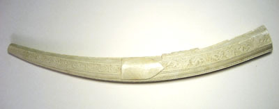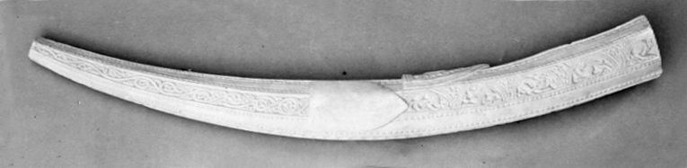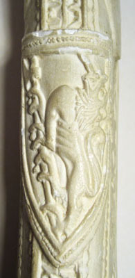 Avgjutning i gulvit gips av ett olifanthorn. Lätt svängt, avsmalnande utåt med ovalt tvärsnitt. Heltäckande dekor av bårder, på sidorna scener med djur och på ovansidan sköld med krönt lejon.