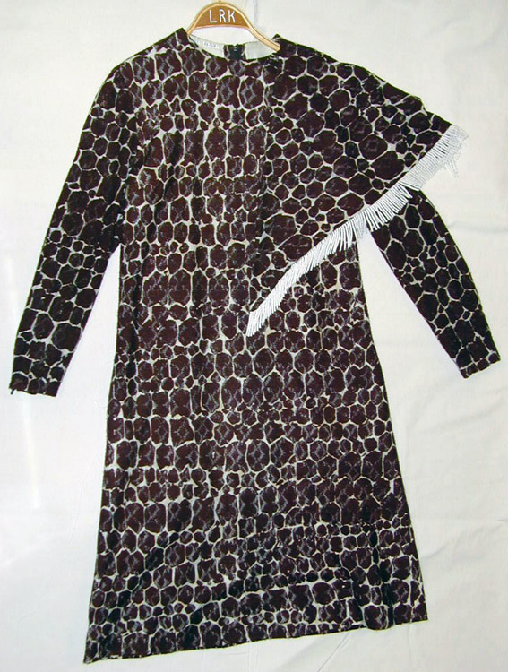 Kort, helskuren (förmiddags-) klänning av glesvävt ylle med mönster av bruna oregelbundnafläckar mot ljus botten, delvis genombrutet och delvis med oregelbundna fläckar mot ljusbotten som är delvis genombrutet och delvis med oregelbundna invävda tätare partier. Deljusa partierna delvis tonade gult. Slät, rund ringning. Rak, lång isydd ärm i en våd. Klänningen skuren i tre våder. Frånsidsömmen tvärgående bystveck, l: 110 mm. I sidsömmarna fickor. Från axelsömmen bak två 50 mm långa figurveck. Brunt blixtlås mitt bak, l: 540 mm. Brunt blixtlås, l: 92 mm, infällt idet 190 mm långa figurvecket i nederkanten på ärmen. Foder av vit taft fastsytt i sömmarna. Ärmarna ofodrade. Vid axelsömmarna långa hällor medtryckknappar. Maskinkastade sömmar, på vissa ställen nylontråd.