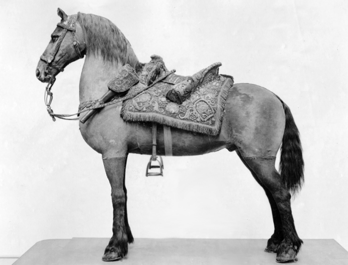 - 1 stor brun Hästhud konstigt med träd uppfylld, stående på fotställning af träd på 4 fötter med sina hofvar ohc beslag samt svart svans, mahn, i pannan hvithårig men öronen och nosen något förbrände af vådelden på Stockholms slott. Samma hud är tagen af den hästen, som Konung Gustaf d. II Adolph ridit på vid slaget å Lützen år 1632, då konungen blef skjuten. Sadel äfven under N.o 86 af Cramoisierödt sammet med silfver och guld rikt broderad med stora guld i silfver silkesfransar, broderingen mästa delen afgången och sammetet formultnadt; ett par hölster med röda sammetskappor med guld i silfver broderade. 1 Hufvudställe, handtygel, förbögel och ryggstycke med dito brodering på bemäldte tyg äro 6 söljor med 6 tampar af silfver. 1 par stegböglor af jern, förgyllningen afnött med röda stegläder. 1 Enkel sadeljohl. Likaså under N:o 86 1 par hjullåspistoler med buxboms-Stockar, samma pistoler nyttjade äfven konungen då han blef på vallplatsen vid Lützen tillika med förberörda Sadel, som Drottning Maria Eleonora förärat.