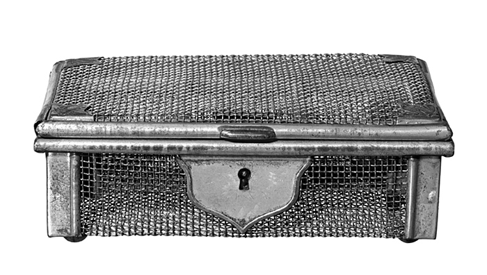 Rektangulärt, med platt fällock och plan botten, duken vävd i små fyrsidiga rutor. Kring skrinets övre och lockets yttre kant en stav av bleckplåt; på skrinets hörn en pålagd bleckplåt, omviken på bottnens undersida samt där med en halvsfärisk fot; längs plåtarnas kanter en skarp rygg. Ovanpå locket i varje hörn ett pålagt treflikigt blad av plåt, vänt inåt. På framsidan ett på insidan liggande lås (nyckel saknas): på utsidan en konturerad nyckelskylt, kring vars ytterkant en stav. Inuti skrinet en lös låda med kanter och hörn som skrinets samt indelad i tre tvärgående fack. I ett av facken fem svenska 1-öres kopparmynt av åren 1905,1911,1920 (två stycken) och 1927. Tillhört inventarierna på Walther von Hallwyls privata kontor, inrymt i Hamngatan 4, Stockholm, 1909 - 1921; därefter på Wilhelmina von Hallwyls, f. Kempe, kontor där från sistnämnda år t. o. m. 1930.