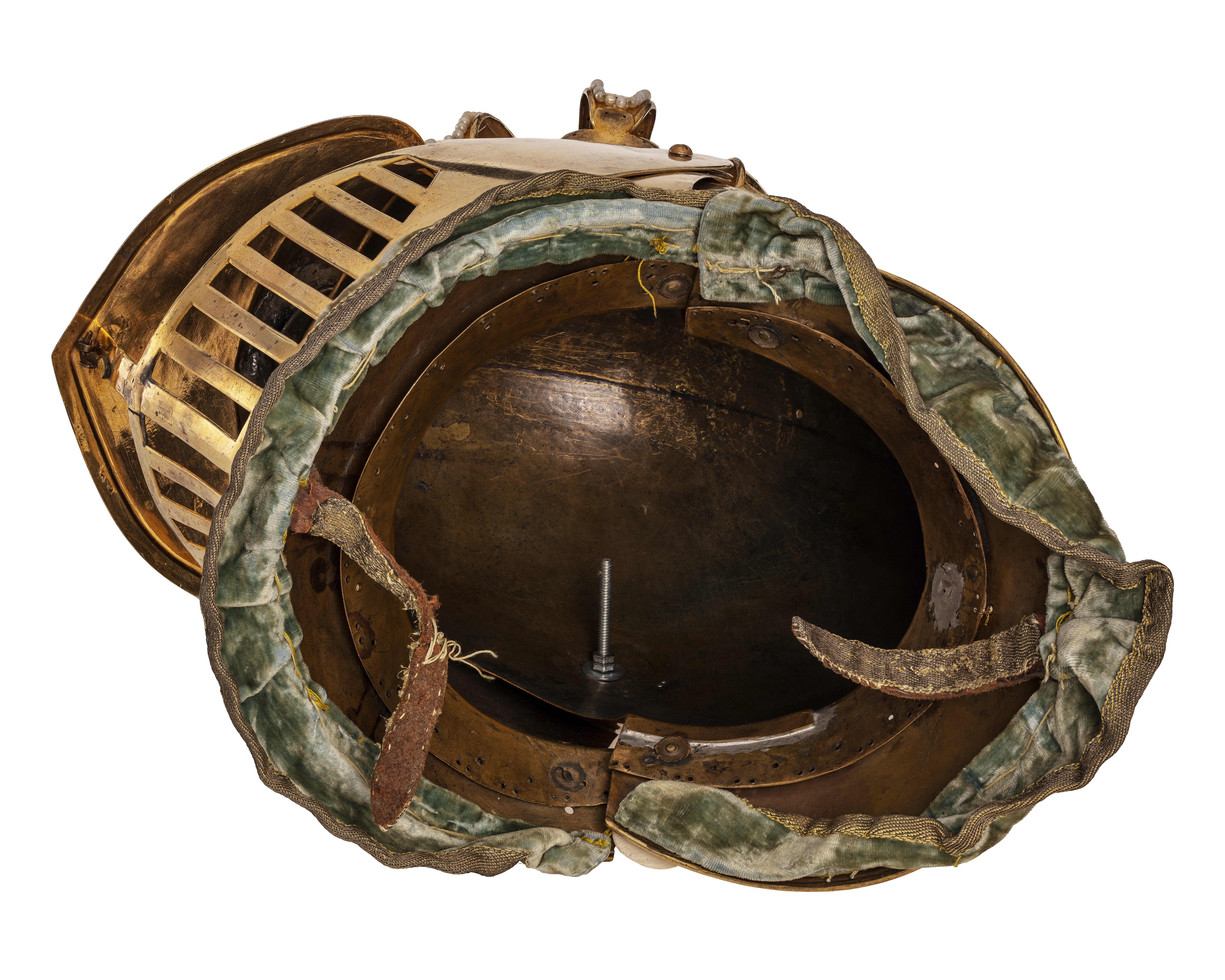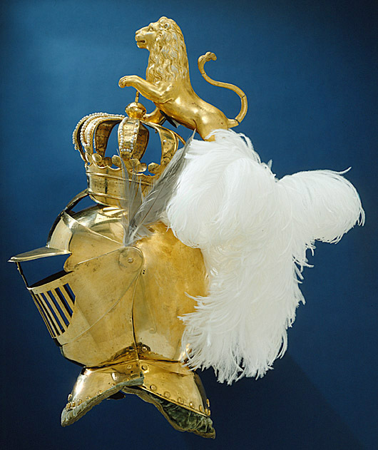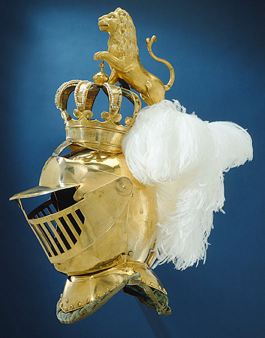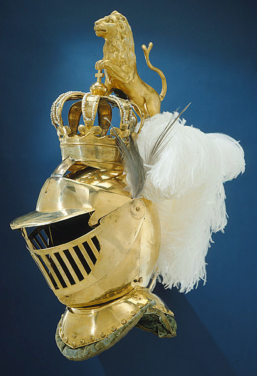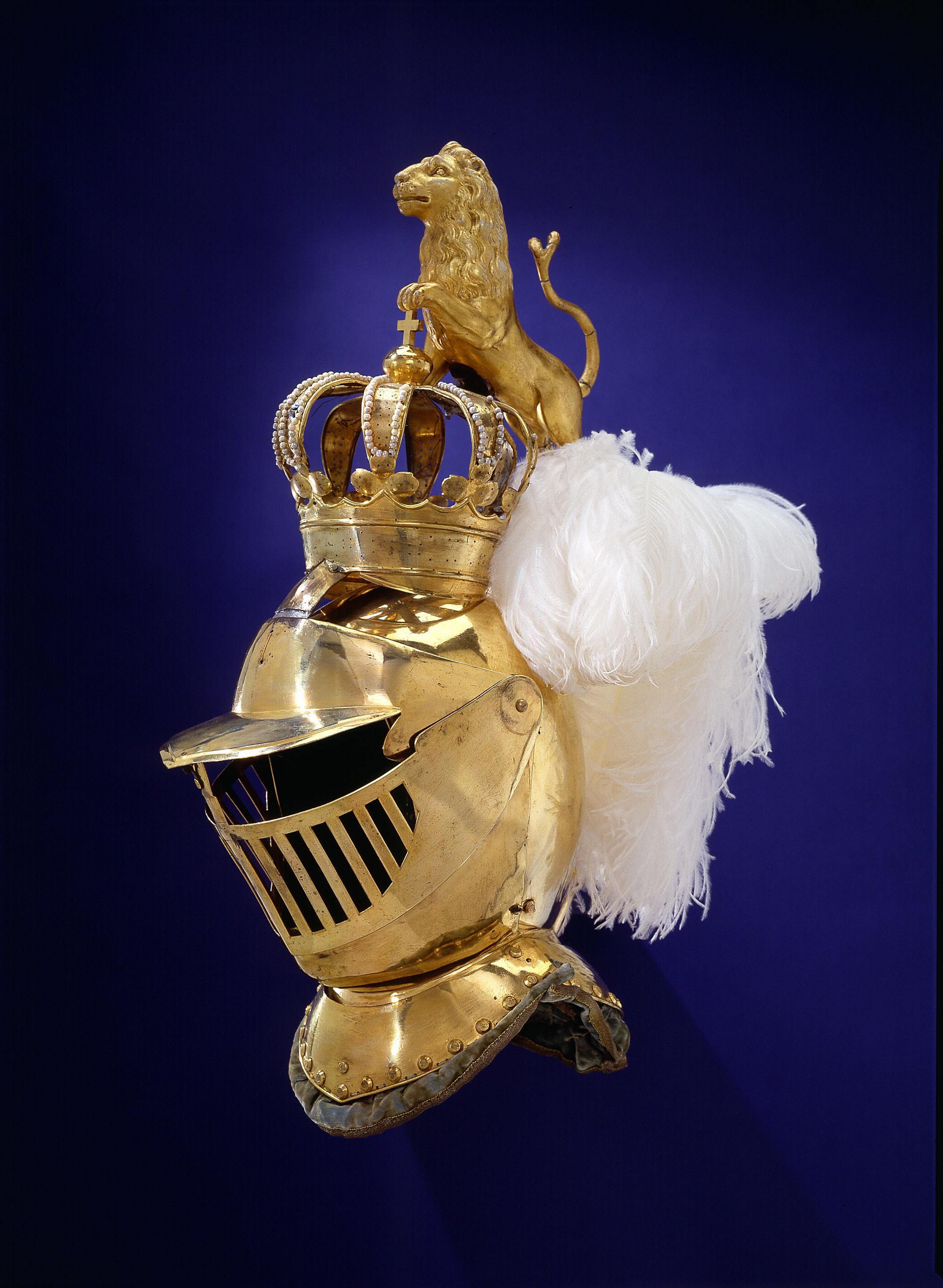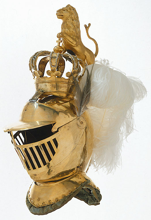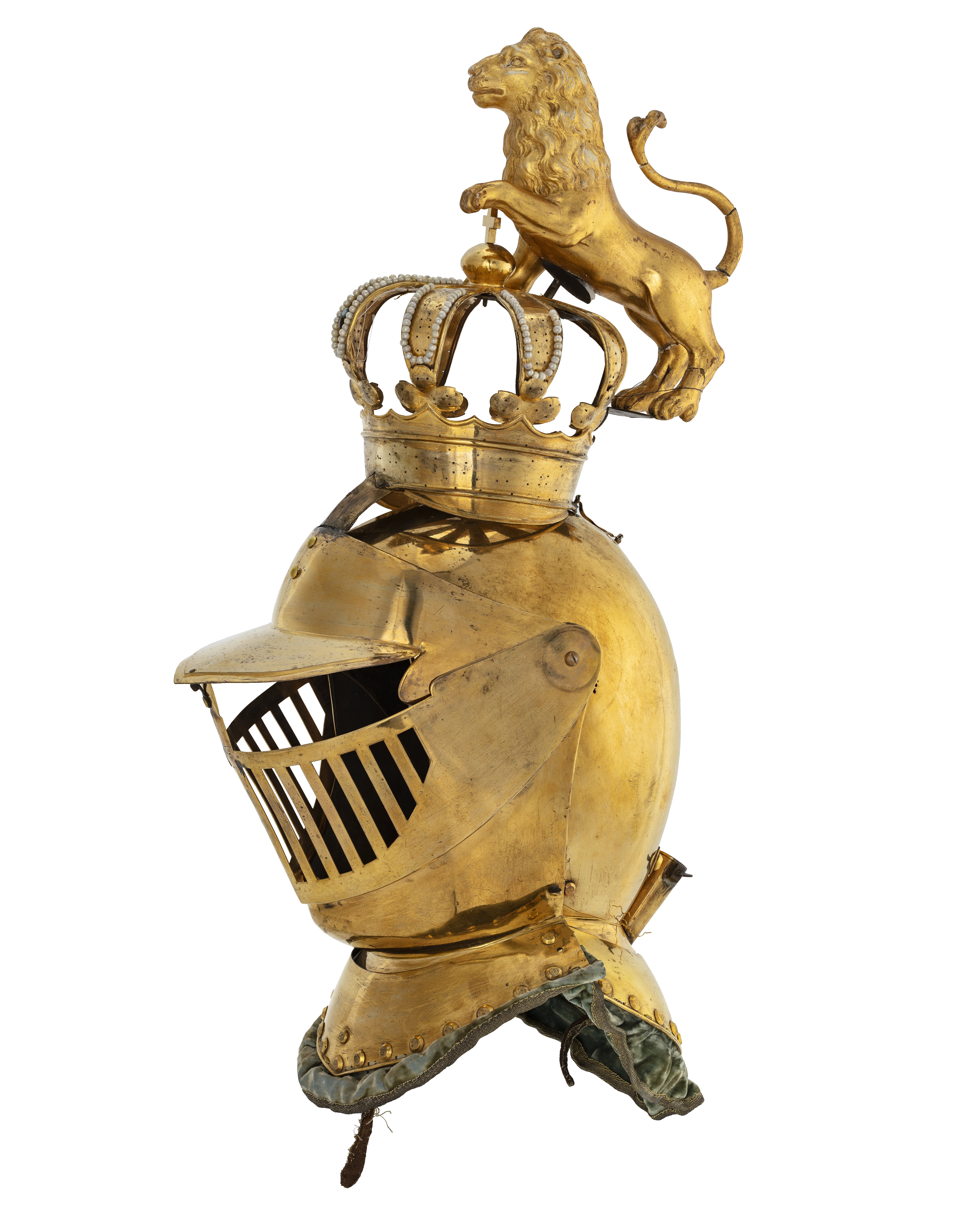 1 Sluten Hjelm förgyld, prydd med en Kongl. krona med Oägta stenar och pärlor samt ett Leijon af Träd