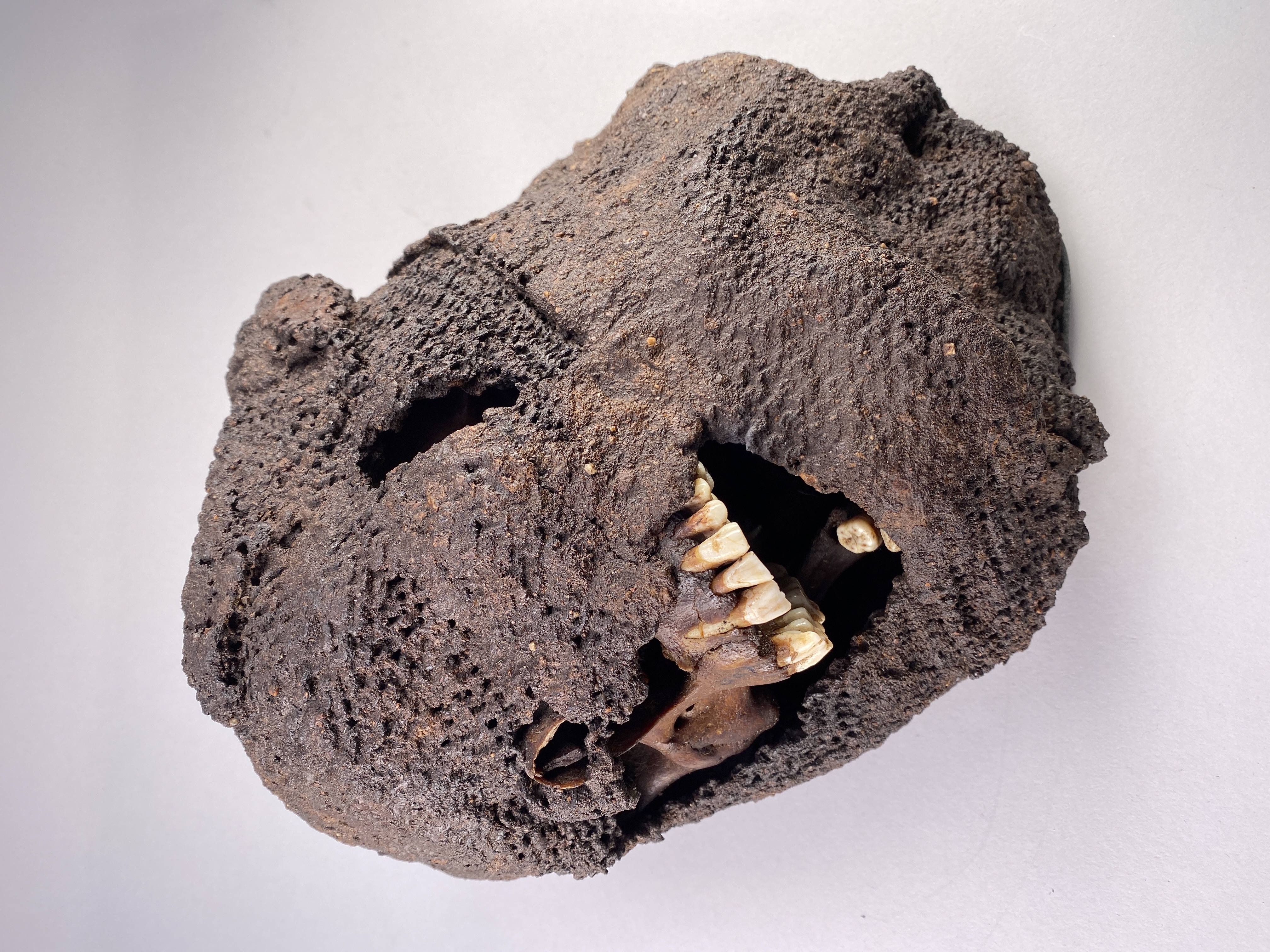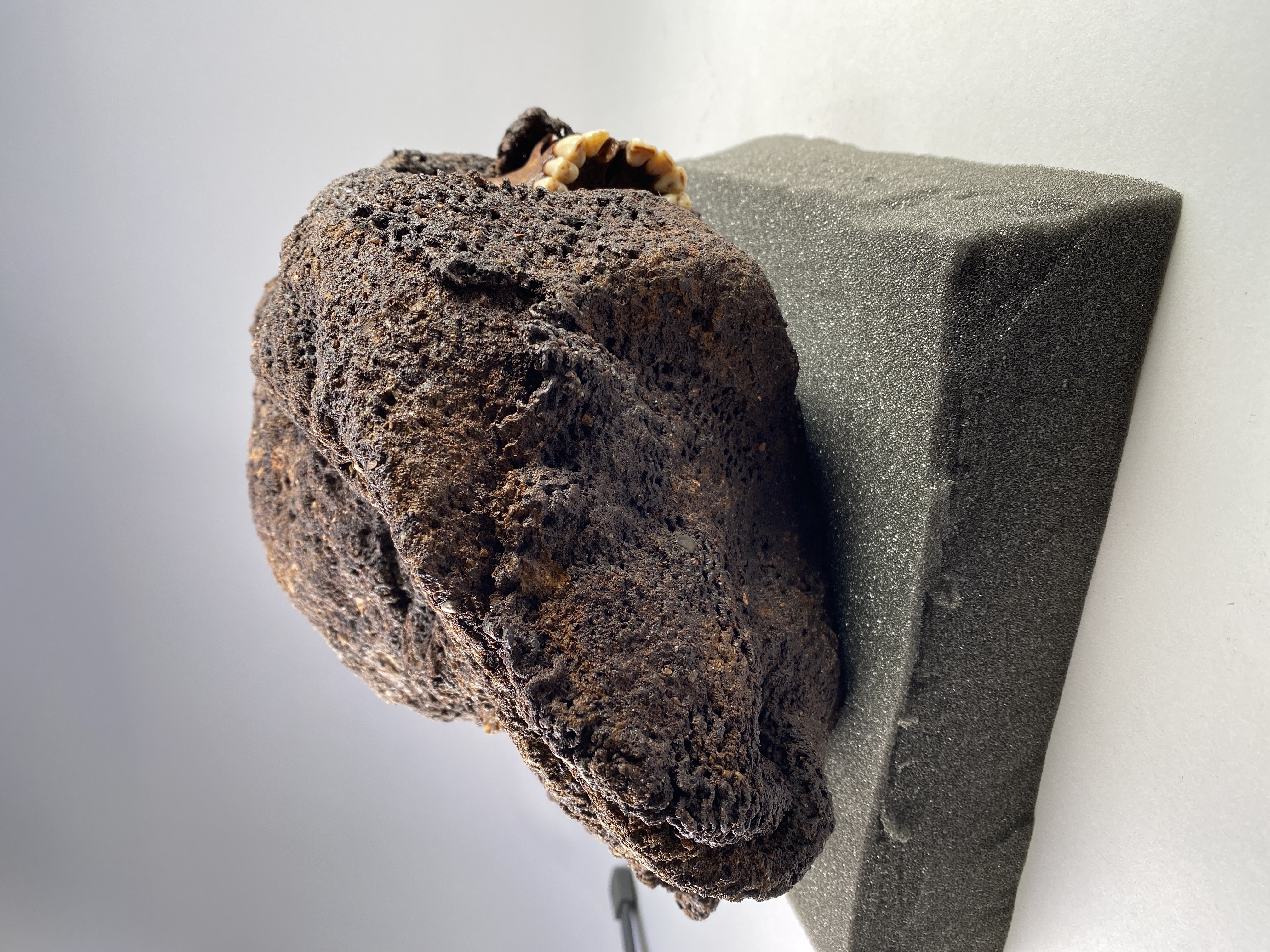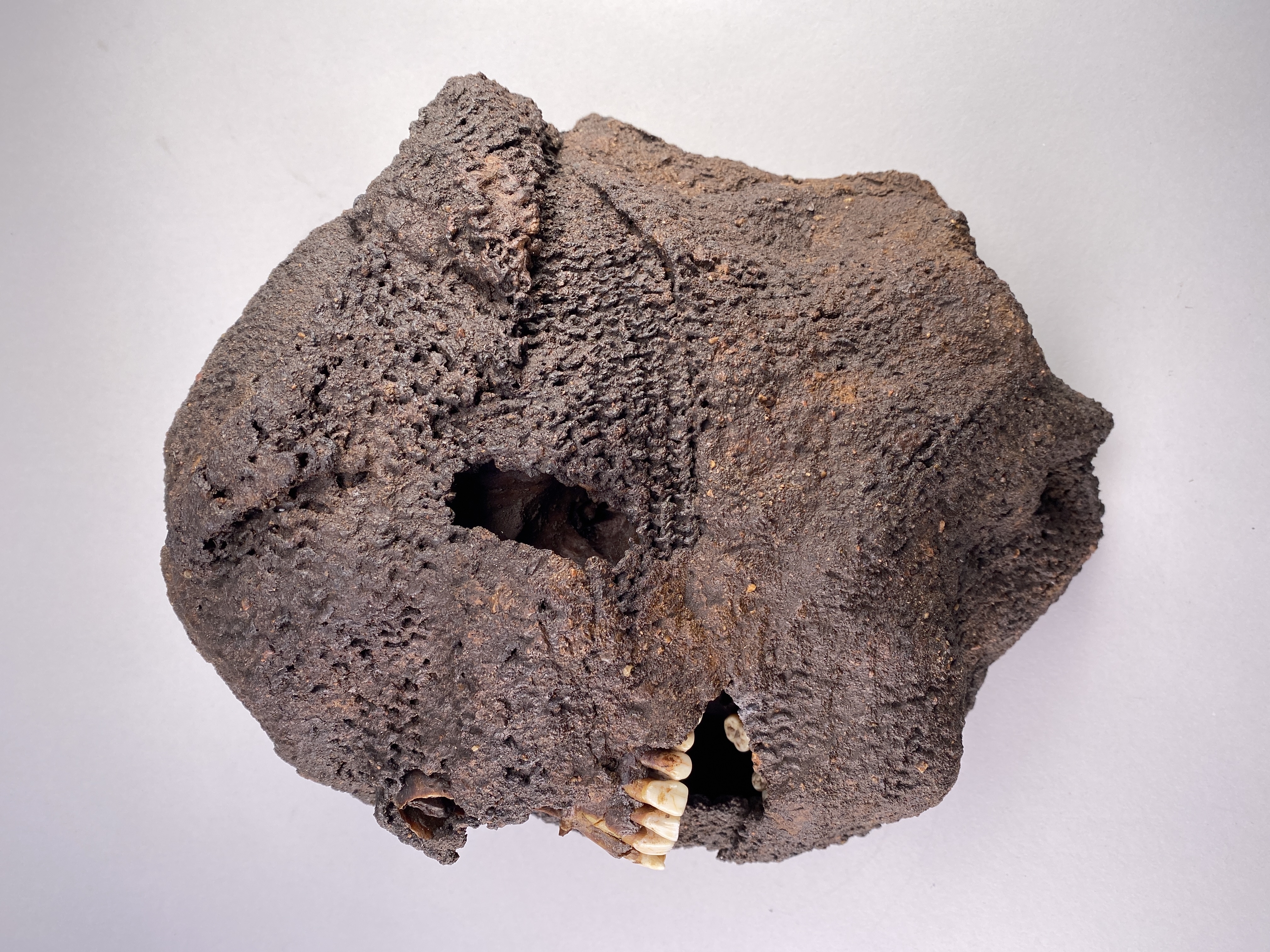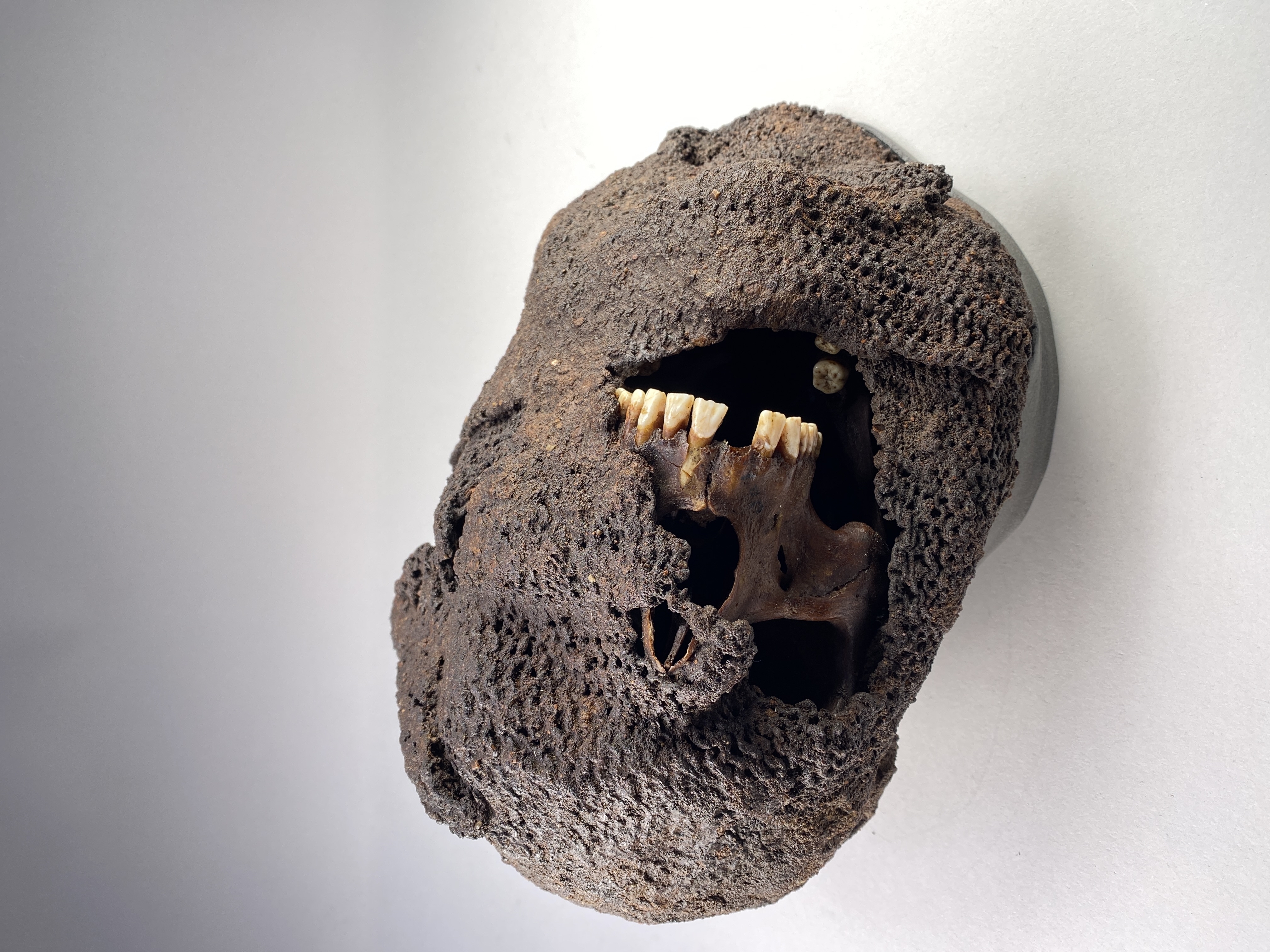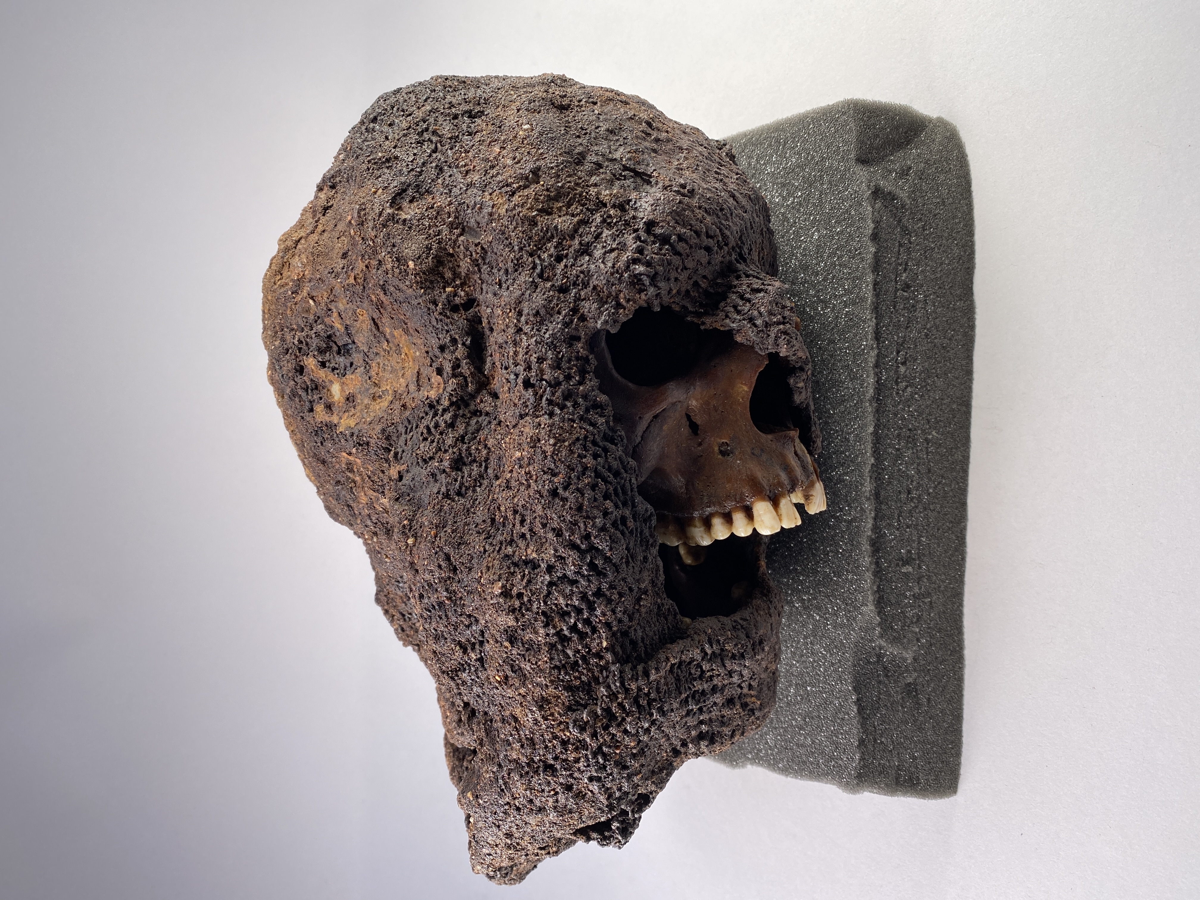 Huva som omsluter ett kranium. Strontiumanalyser tyder på att individen kommer från Danmark.