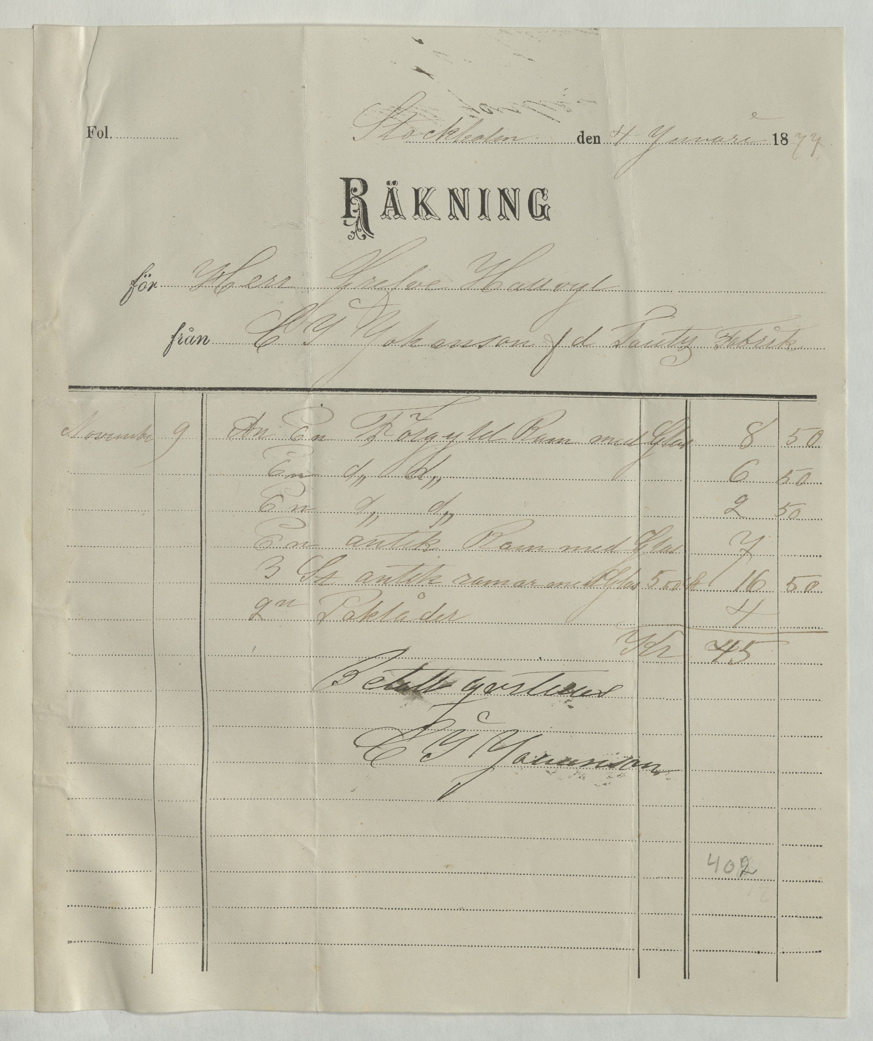 Kvitto från C. J. Johanson. Gällande bl.a. förgyllning av ramar.