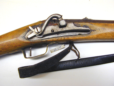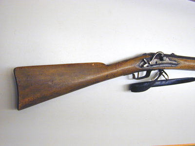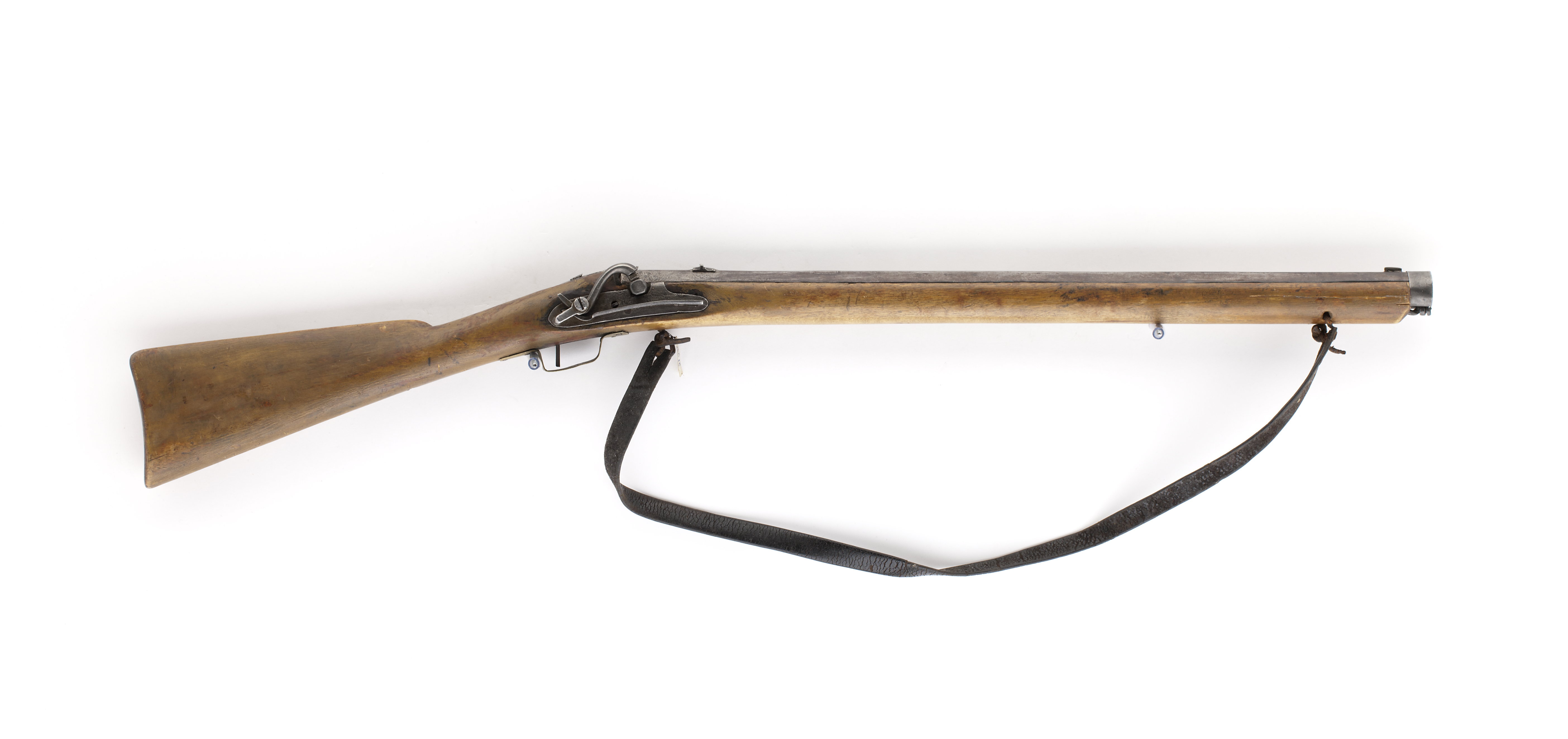 Åttsidig pipa av stål med sex räfflor. På undersidan och kammaren slagmärken från smidet, pipans kanter rundnötta. Rektangulärt, i vinkel böjt svansskruvblad som slutar i en spetsig båge. Bakom siktet ett inpunsat mönster med ett kors och en halvmåne, framför siktet en igenfylld laxning. På pipans h. sida en fyrsidig snäcka med tändhattsnippel. Riktmedel: Inlaxat ståndsikte av stål, bredare än pipans ovansida, grund skåra. Fastlött stolpkorn. Fästning: Ett bortfilat häfte. Pipan fäst uppifrån med krysskruven, en vanlig träskruv samt av den bandformiga topprörkan. Slagsnapplås med plant, flintlåsliknande låsbleck. S-formig, rundad hane med harmynt slaghuvud, långt utdragen hanfot. Kantig kagge utan plunderskruv. Utvändig slagfjäder, upphöjd bakom hanen. Studeln bandformig med baktill en i vinkel böjd skruv för fäste i låsblecket. Fästning: En låsskruv. Smal, rak avtryckaren. Helstock av furu, ursprungligen fernissad, senare övermålad med brun färg, som delvis nötts bort. Kolven närmast av fransk typ. Sluten laddstocksränna, i piprännans botten borrade hål som delvis förbundets med varandra genom utskärningar ner till laddstocksrännan. Piprännan limmad framtill, framstocken genomborrad av två hål för bärremmen. Pipband av stål som näsband, bandformigt med omvända och hopfogade ändar. Bred varbygel, bandformig, utskuren i en mässingsplåt och tillbockad, fastspikad med trådspik. Framför och bakom den finns hål från en borttagen varbygel. Tillbehör: Laddstock av ståltråd, l: 596 mm, d: 6 mm, framtill avsmalnande och omböjd i tre varv till krats.
