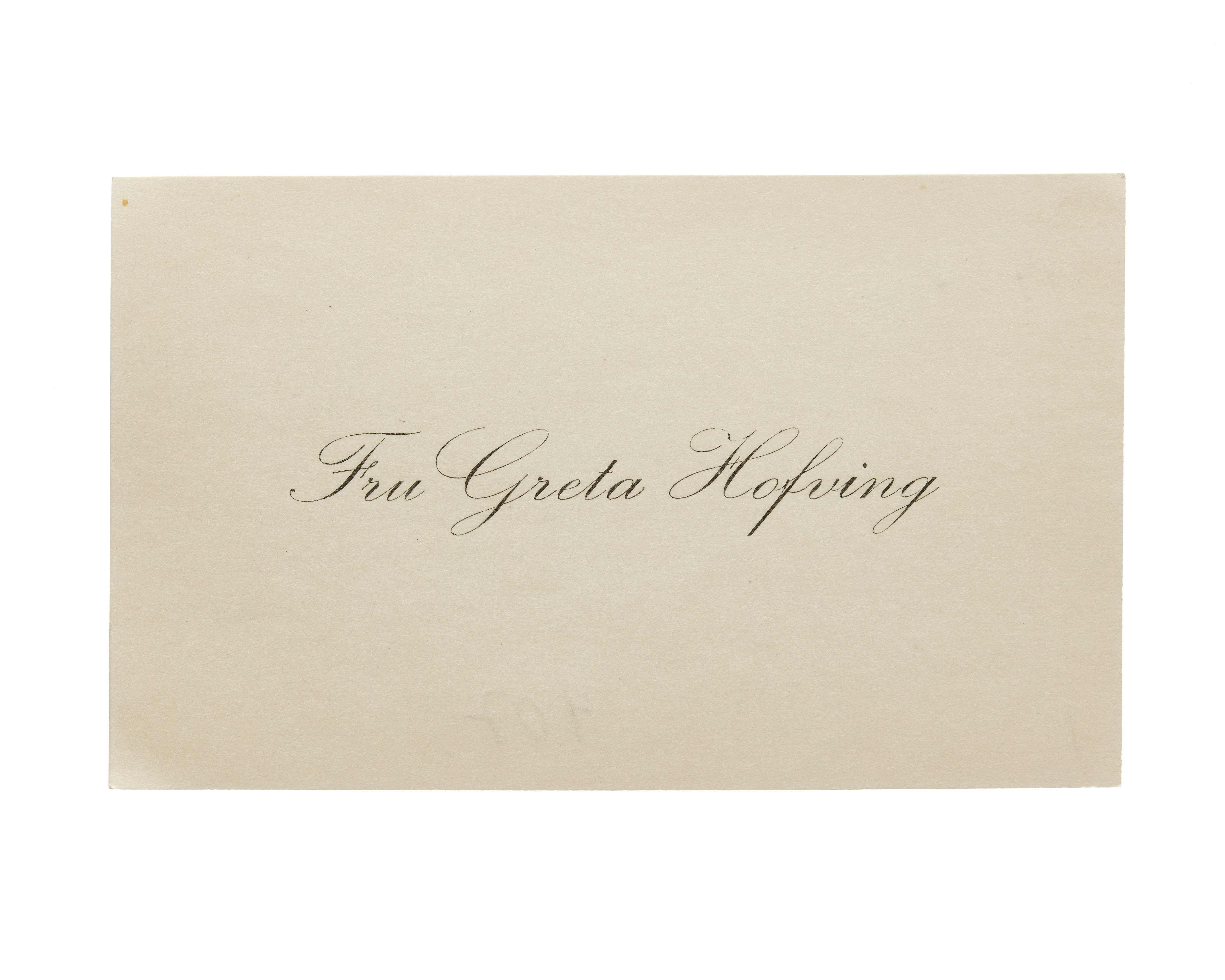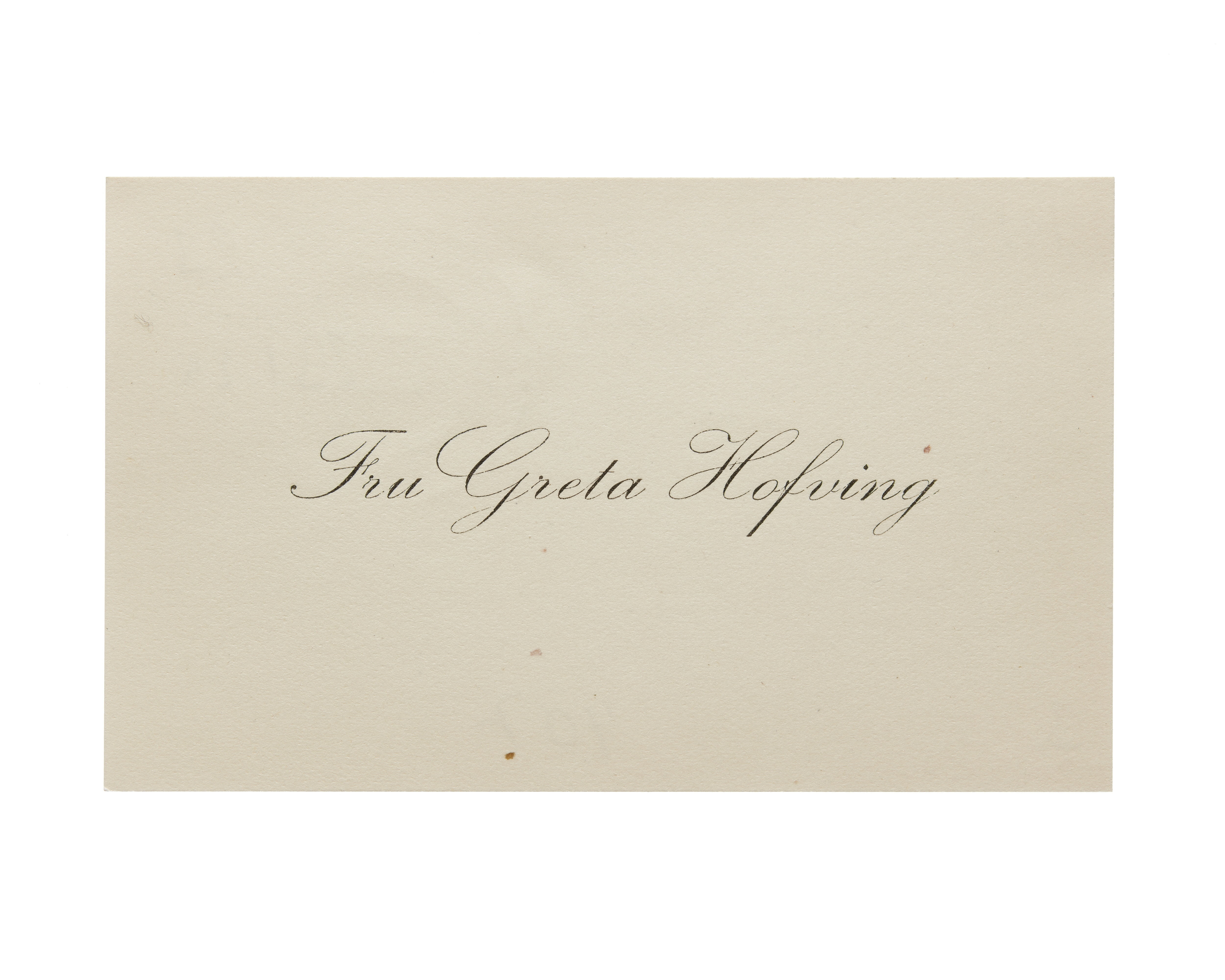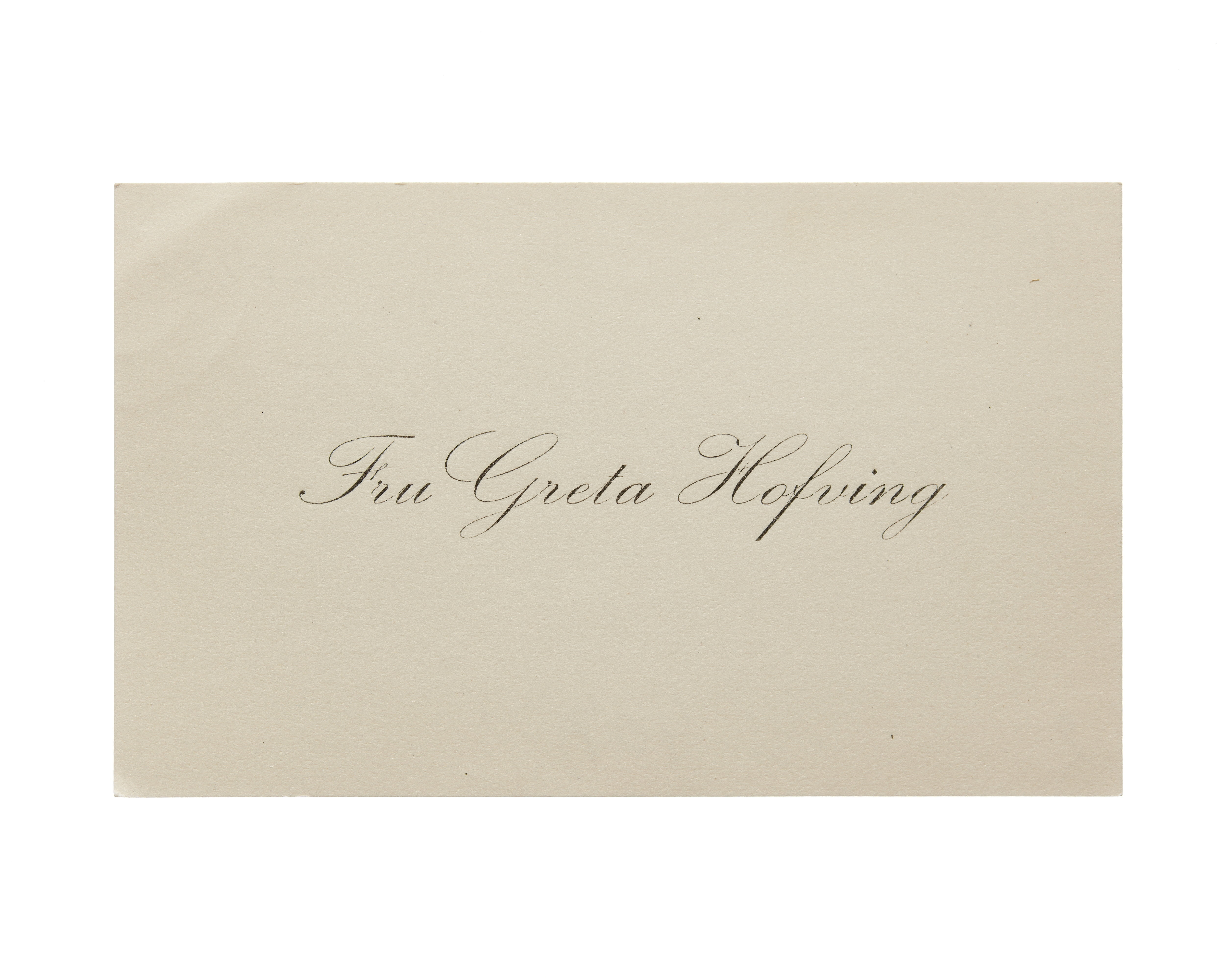 Tre visitkort från Fru Greta Hofving. Första kortet daterat 1921. Andra kortet daterat 1922. Tredje kortet daterat 1923.