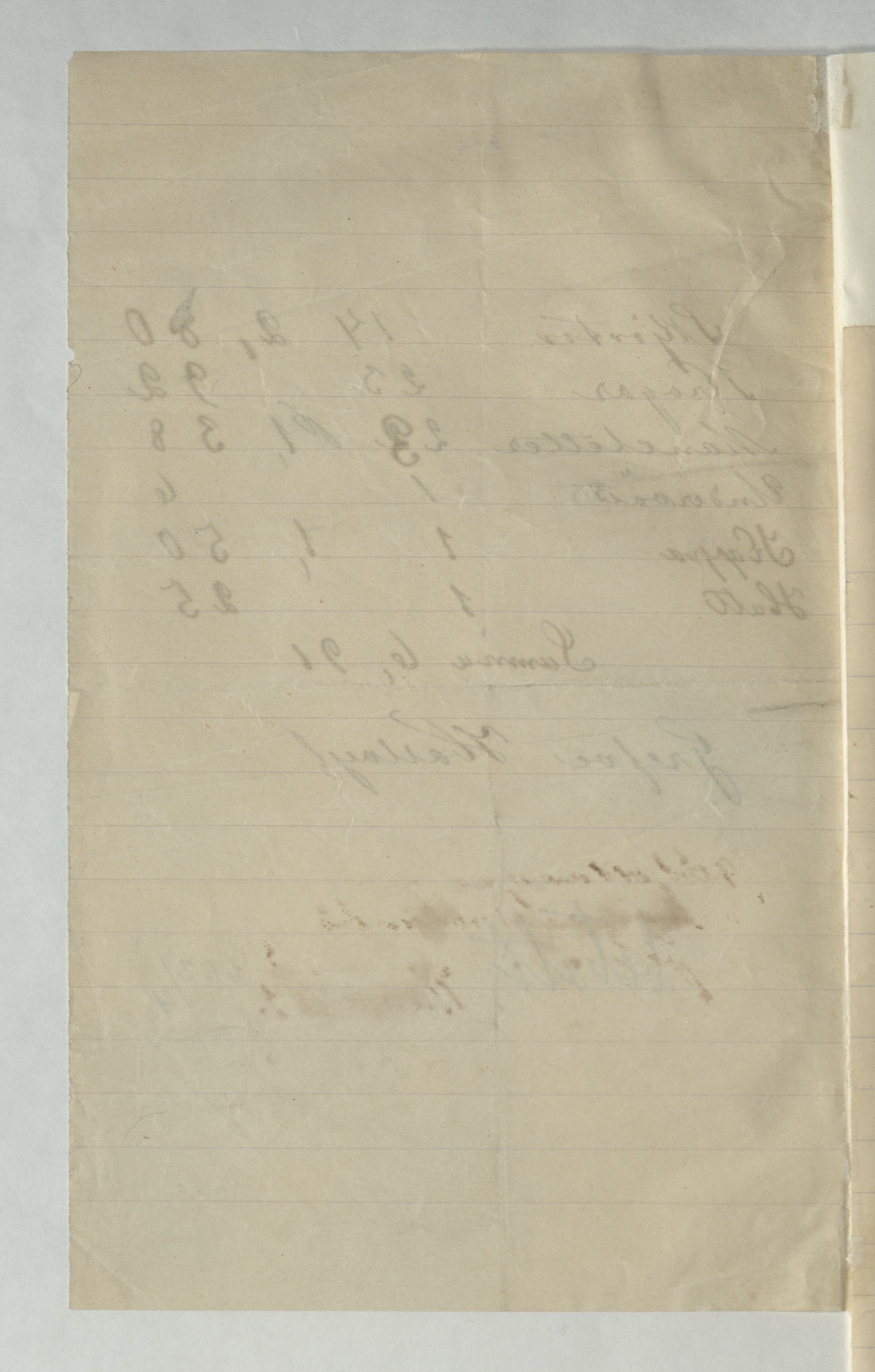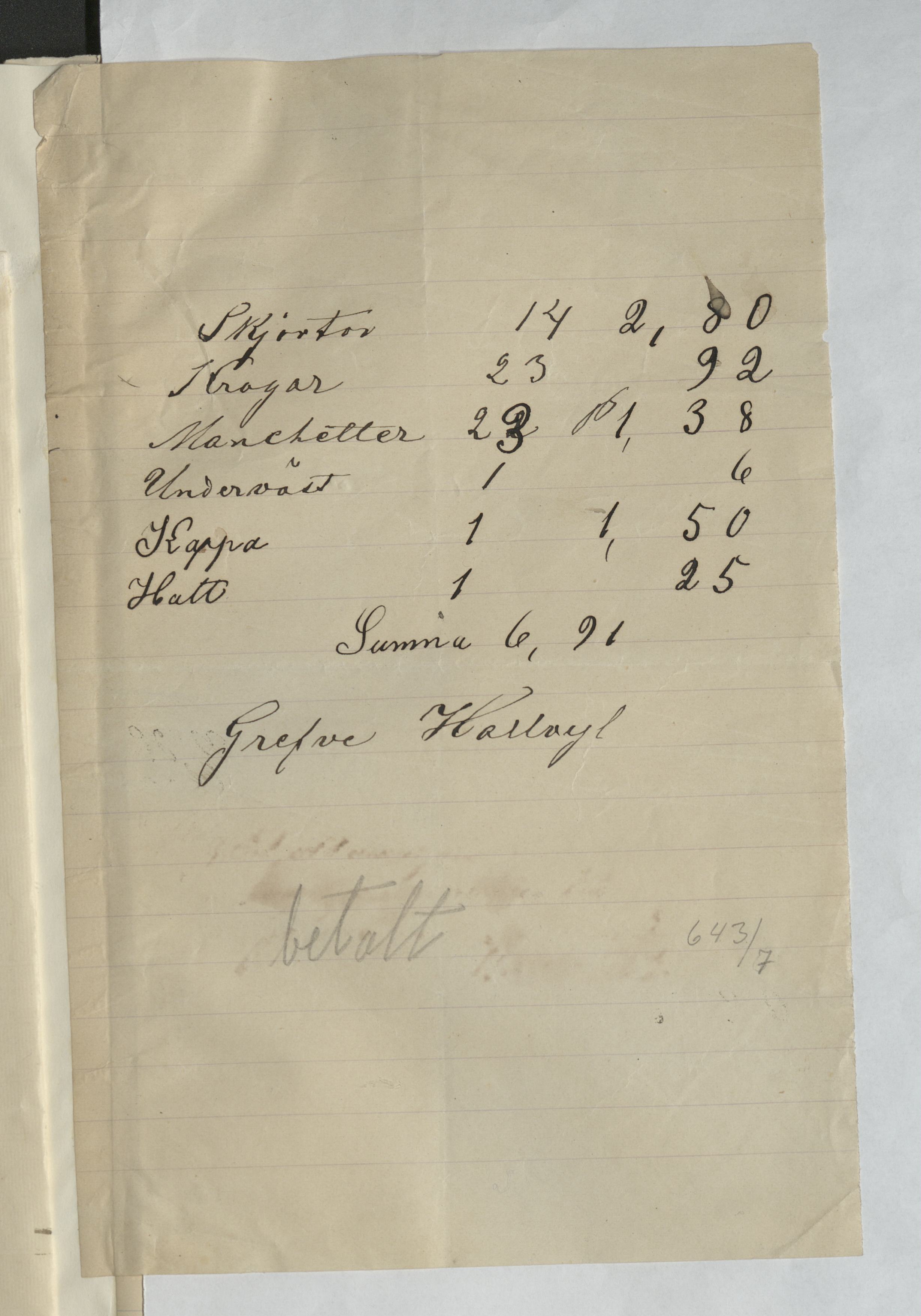 Kvitto från Fru Pettersson, Skjorttvätt, för bl a 14st skjortor, 23 manchetter, 1 kappa, 1 hatt och 23 kragar. 6:91Kr betald av Greve Hallwyl. Odat.