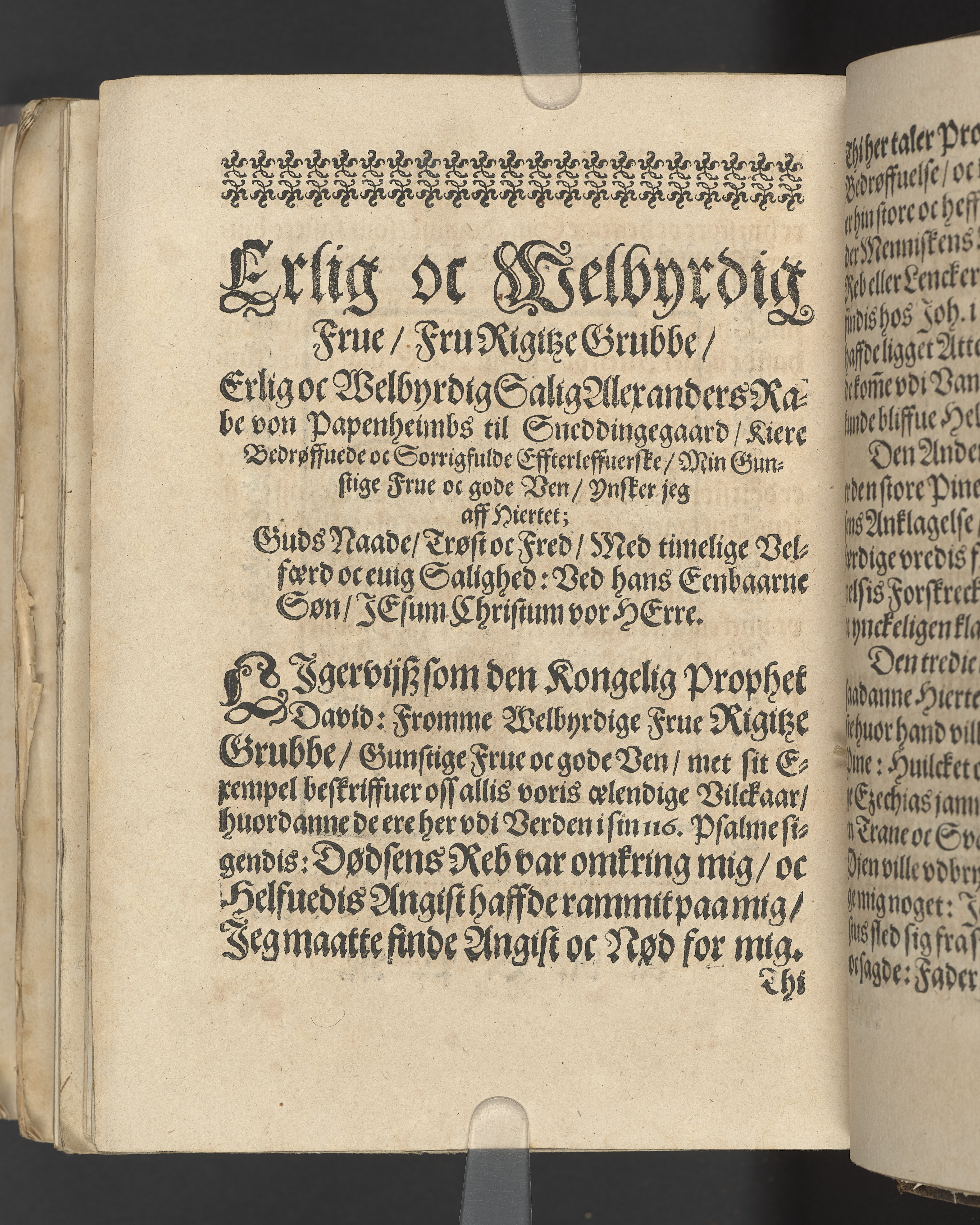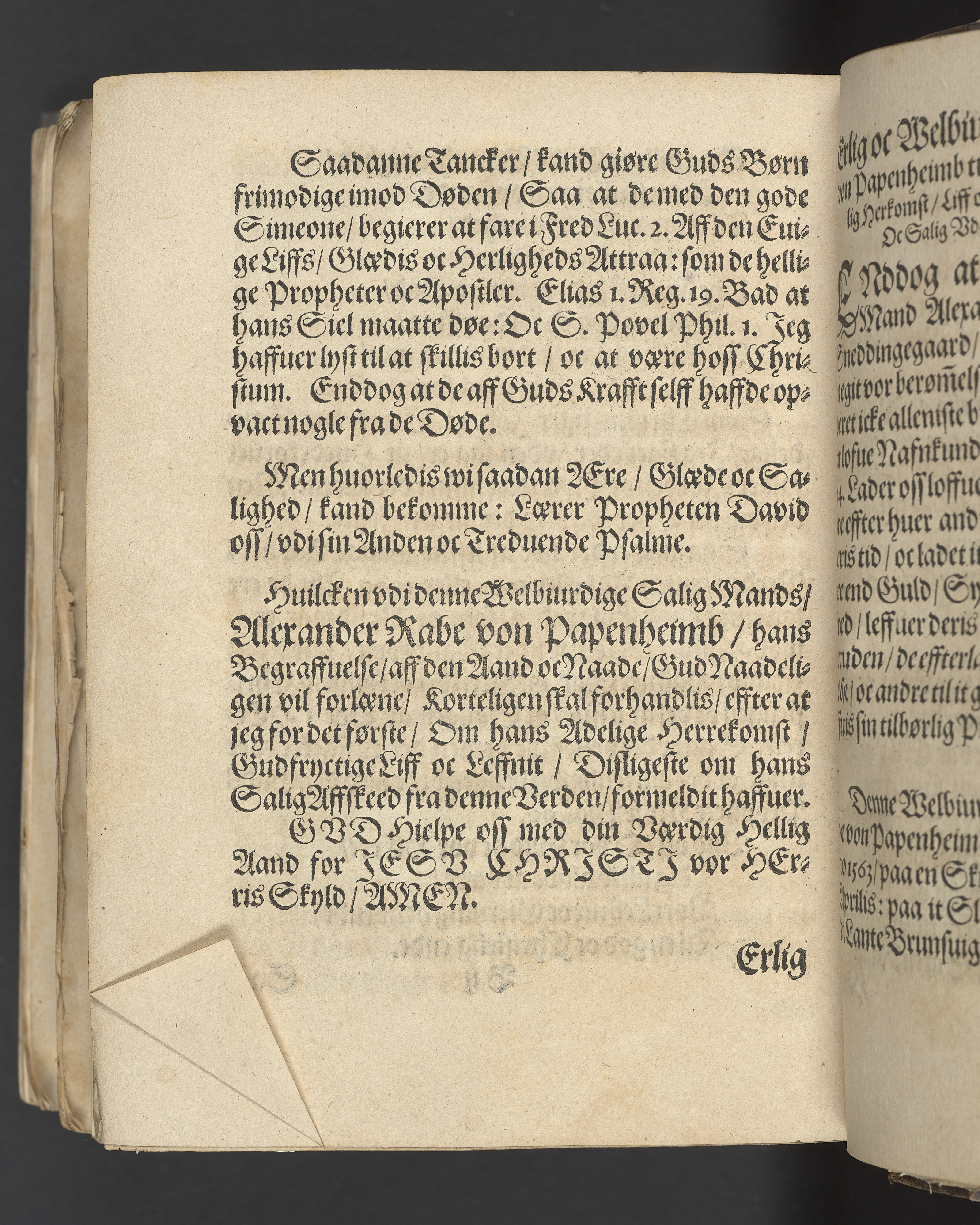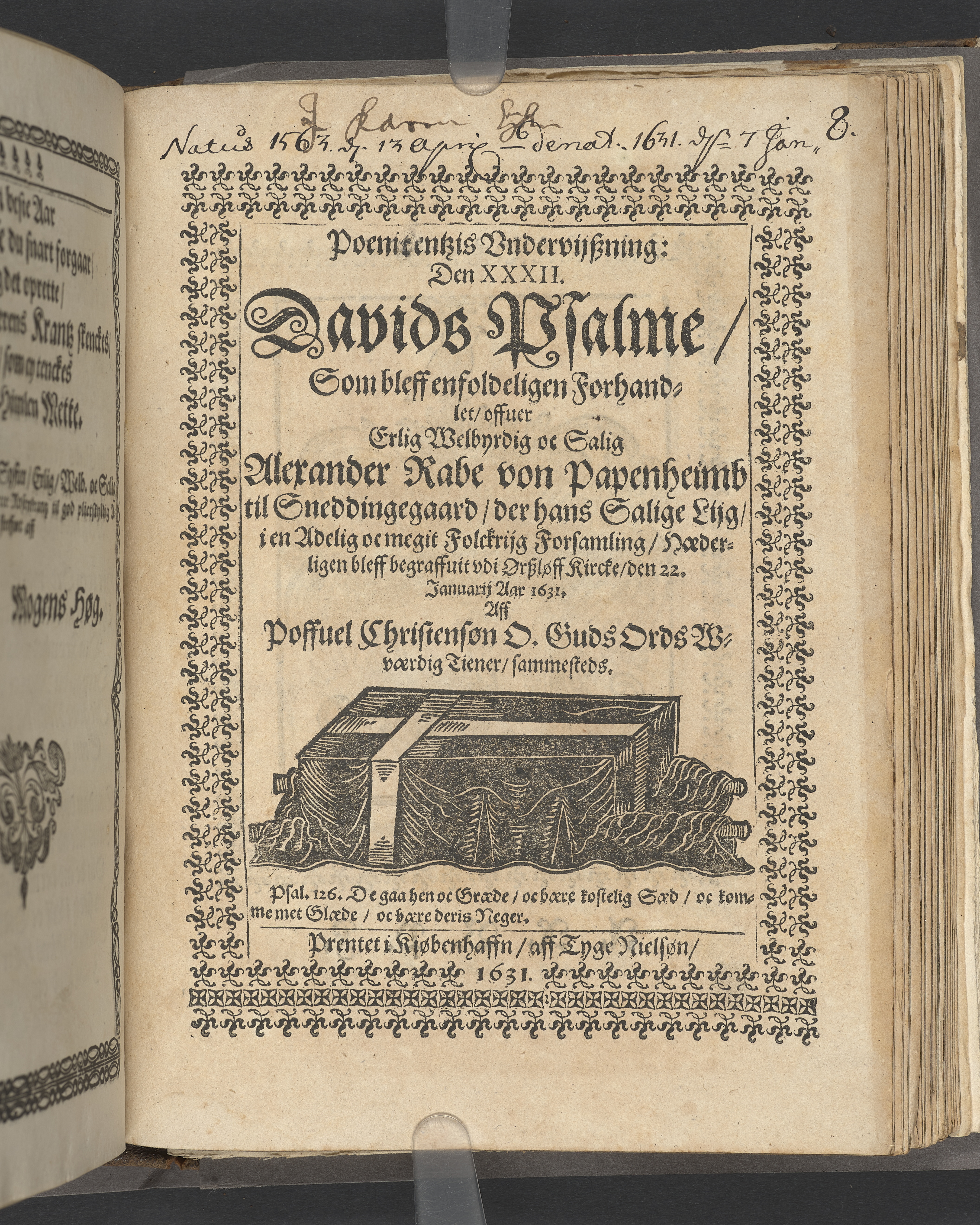 Poenitentzis Vndervijßning: Den XXXII. Davids Psalme Som bleff enfoldeligen Forhandlet / offuer Erlig Welbyrdig oc Salig Alexander Rabe von Papenheimb til Sneddingegaard / der hans Salige Lijg i en Adelig oc megit Folckrijg Forsamling / Hæderligen bleff begraffuit vdi Ørßløff Kircke / den 22. Januariji Aar 1631. Aff Poffuel Christensøn O. Guds Ords Wværdig Tiener / sammesteds. Psal. 126. De gaa hen oc Græde / oc bære kostelig Saed / oc komme met Glæde/ oc baere deris Neger. Prentet i Kiøbenhaffn / aff Tyge Nielsøn / 1631
