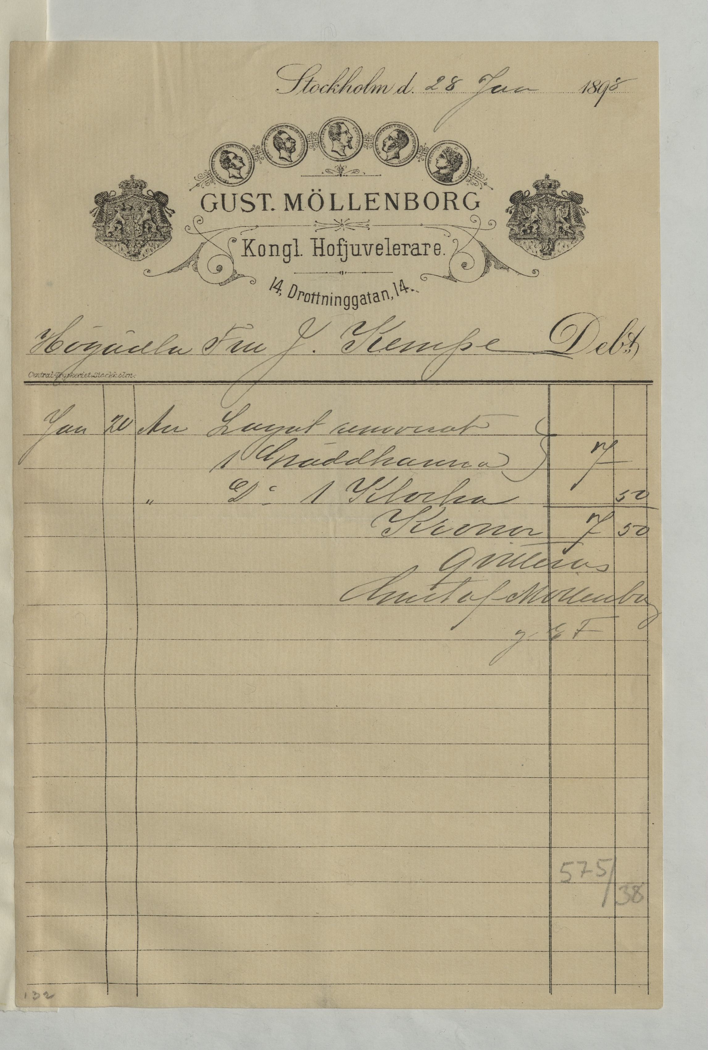 Kvitto från Gustaf Möllenborg, Juvelerare, 1898