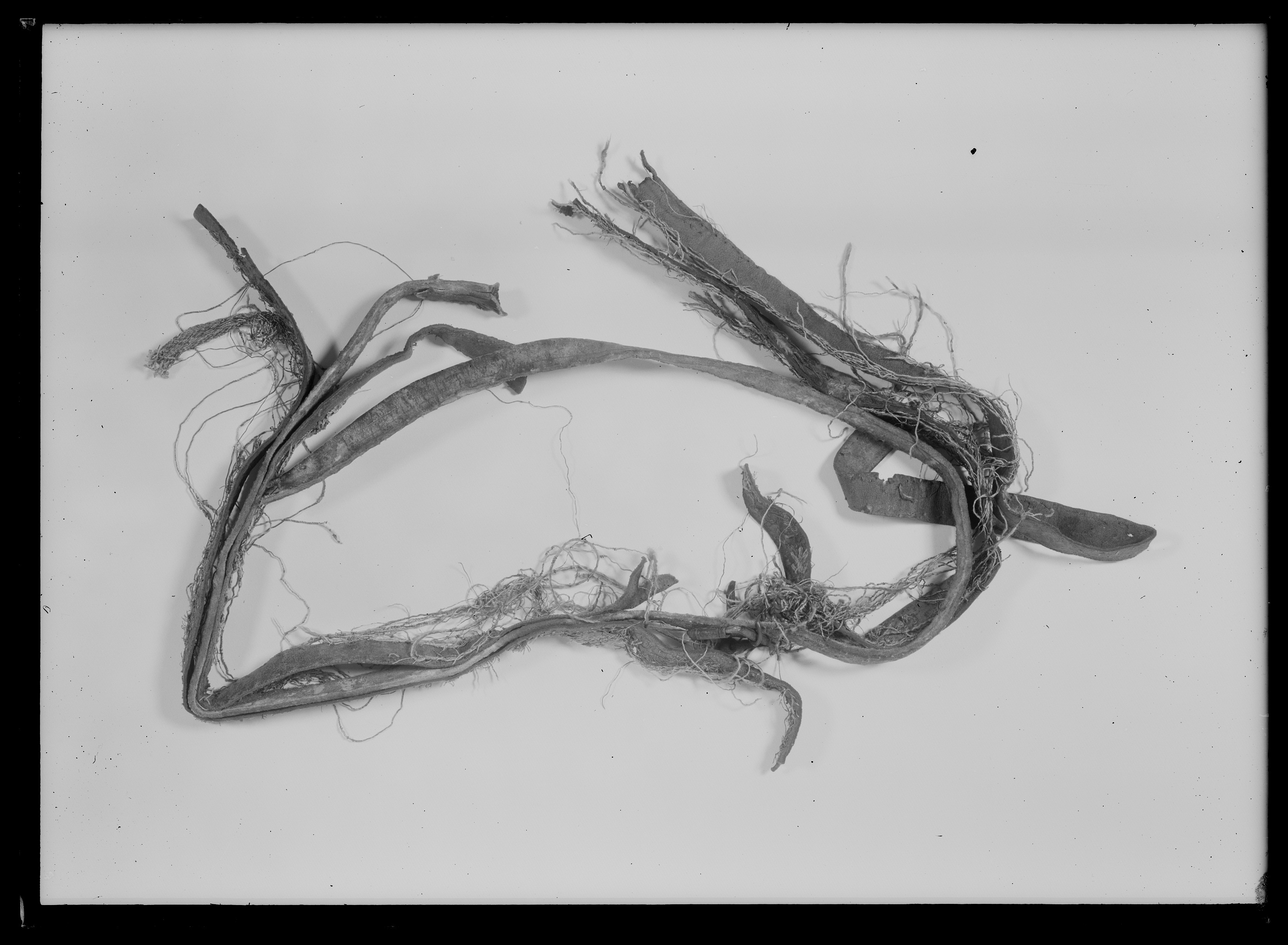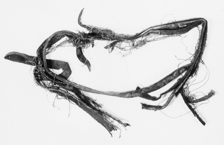 Dubbel bukgjord av blått, vitt och gult silke med skinnapplikationer och randning på tvären. I änden två söljor av järn med söljstycken. Den andra delen avsliten.