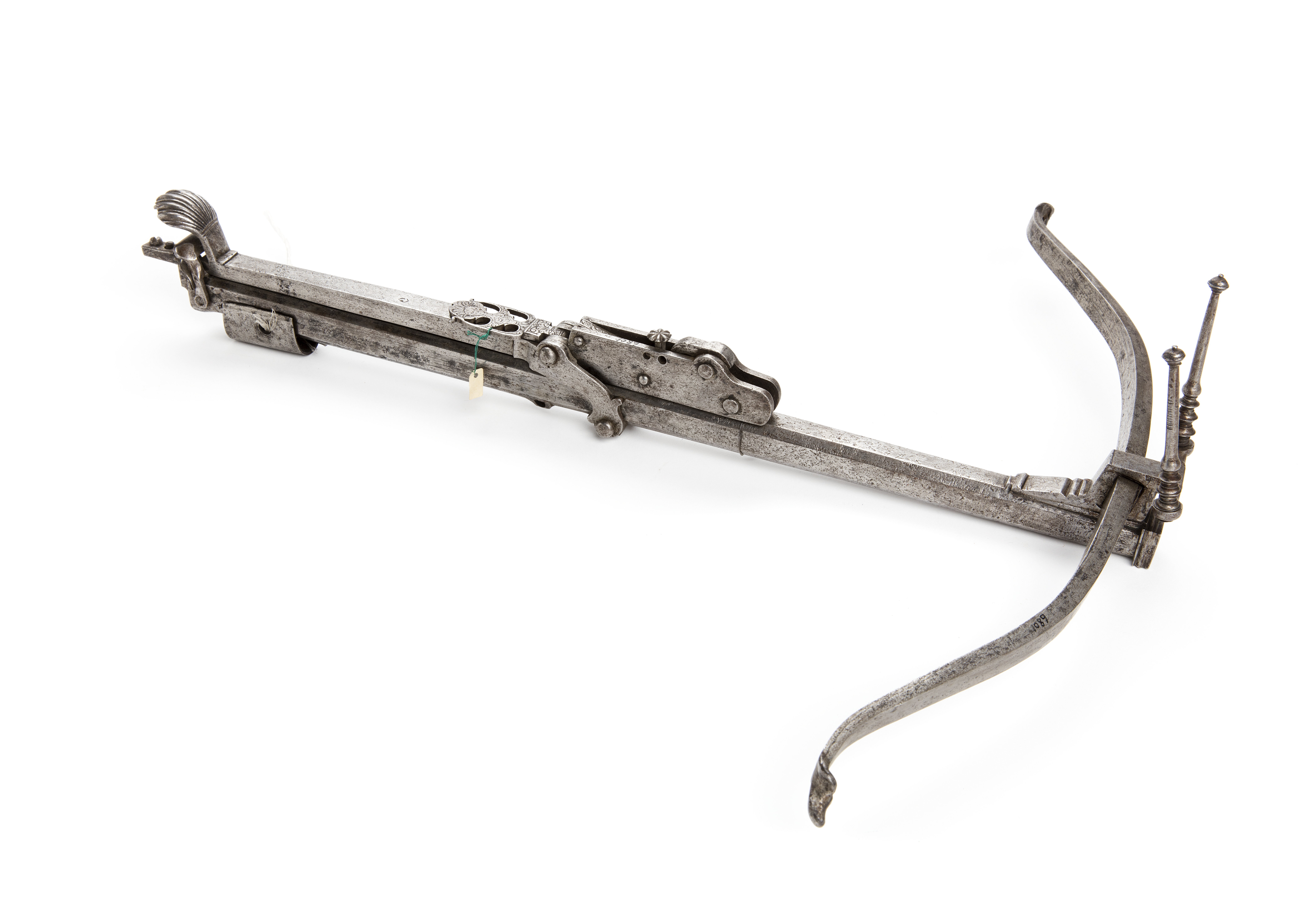 Båge av stål, fäst i hål i stocken med stålkil. Låset friliggande på stockens ovansida, kombinerat med spännare (hävarm) med handtag i form av snäcka. Spännaren fästes med en rektangulär fjädrande bygel. På spännarens ovansida stämpel, orm som slingrar sig runt kors (jfr Stöckel nr 5871). Stock av stål i form av åttkantig bösspipa. På mitten är en böjd stålplatta fäst med bult på undersidan. På bösspipans ovansida otydlig stämpel. Ciselerat genombrutet fällbart sikte bakom låset. Framtill gaffel för korn. Gaffelns armar är fastskruvade. Karl XV:s samling nr 1221, testamentarisk gåva till LRK. 1872 förvarad i trappan från Biljardsalen på Ulriksdal.