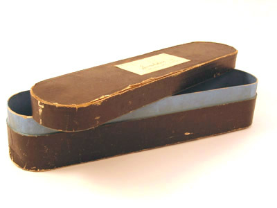Oval pappask med lock. Svart utsida och blå insida. Påklistrad lapp på locket med Generalskärp handskrivet. På samma lapp står skärpets gnr, nnr m.m. antecknat med blyerts.