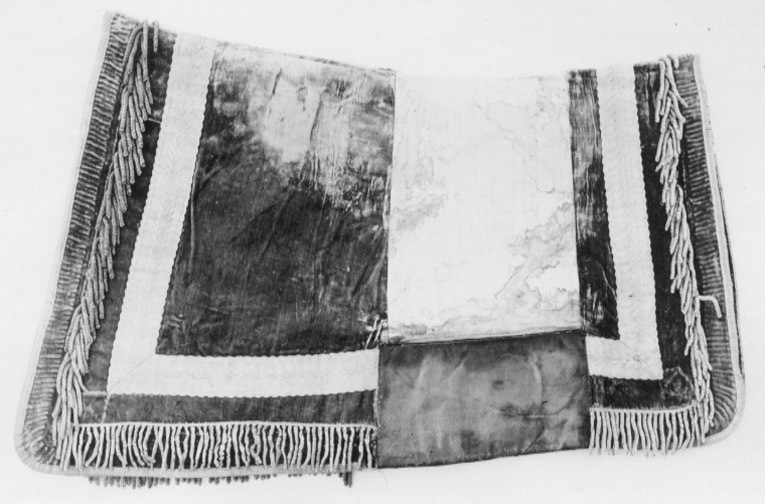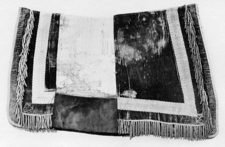 Fyrsidigt schabrak av röd sammet. Hörnen rundade. Ett stycke röd saffian, 300 x 165 mm sitter på vardera långsidan 450 mm innanför schabrakets främre kant, Partiet mellan dessa läderstycken är klätt med oblekt linne. Schabraket kantas av en 10 mm bred guldgalon. 55 mm ovanför denna sitter en 60 mm bred gyllene frans med krepiner. 35 mm ovanför fransen sitter en uddkantad, 55 mm bred guldgalon. Baksida: svart vaxduksfoder.