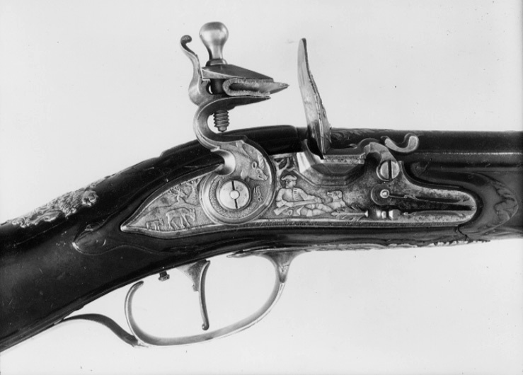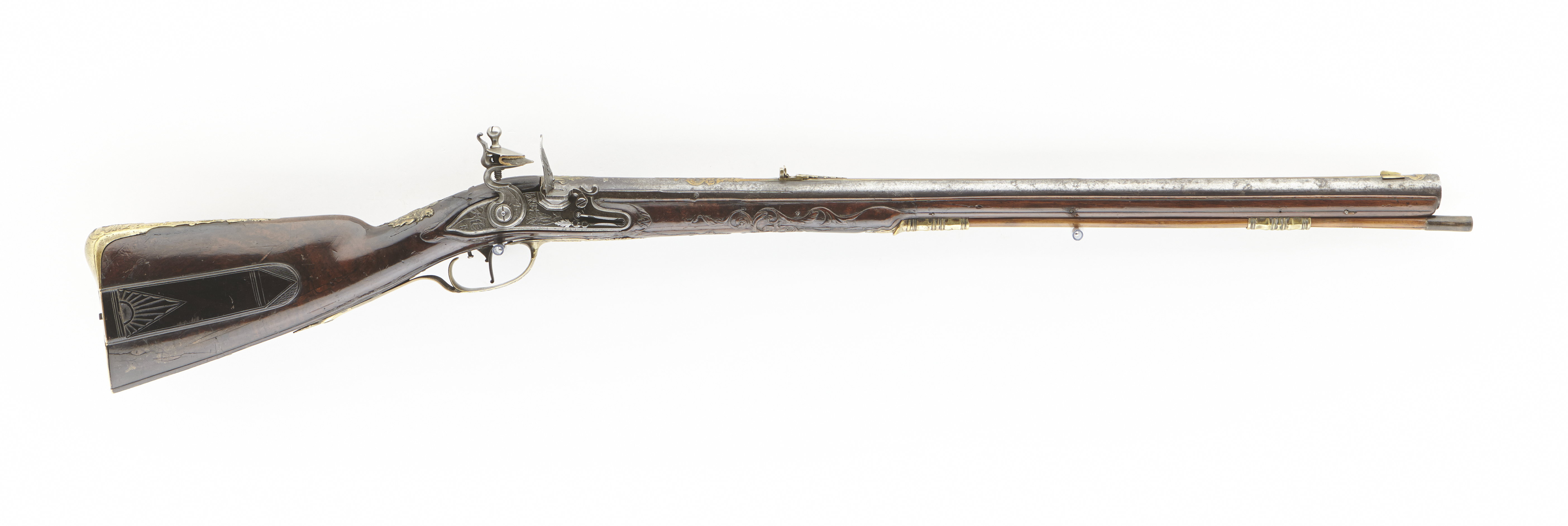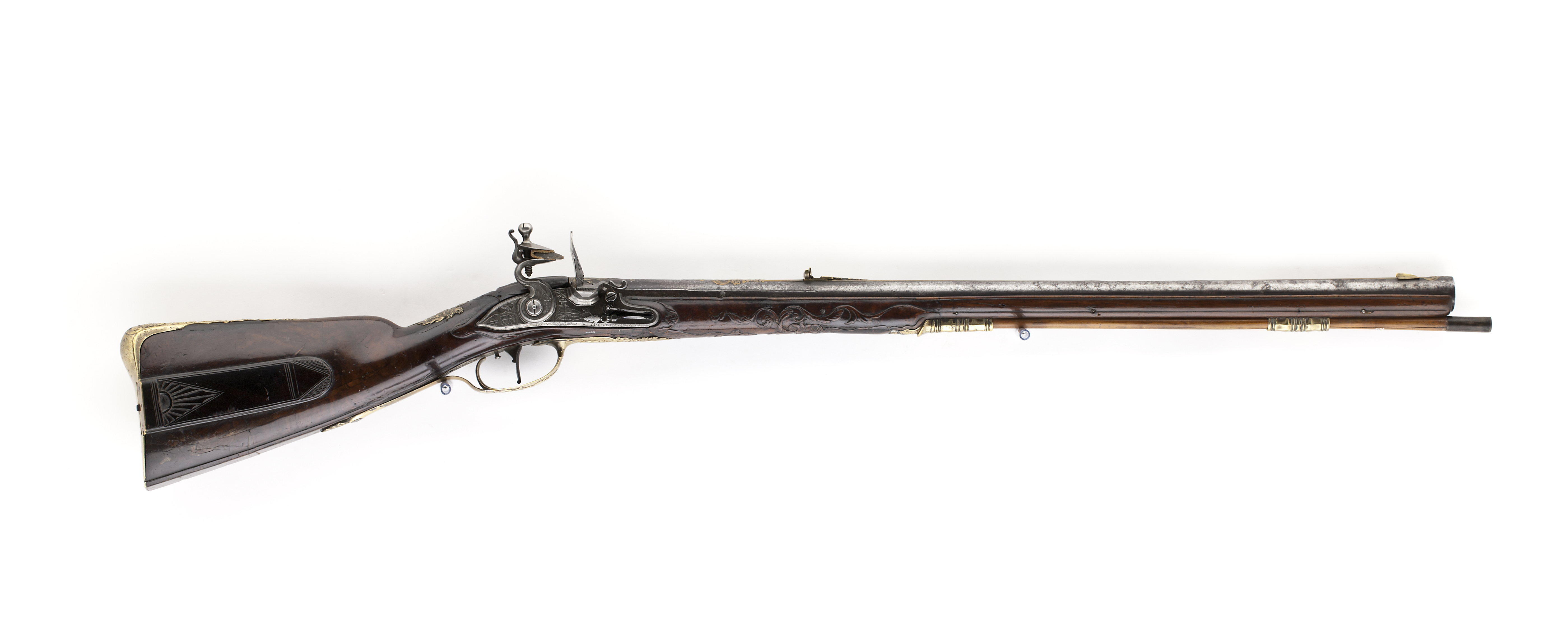 Rund, brunerad pipa, sju räfflor. På svansskruvbladet, kammaren runt siktet och kornet inslagen dekor av förgylld mässing i form av lister, blad, voluter och mas-karoner. På pipans mittparti och bakåt från mynningen går två kilformiga åsar med list av inslagen mässing. På kammaren inslaget: "M. C. PISTOR". Riktmedel: Klaffsikte och stolpkorn av förgylld mässing. Fästning: Tre häften. Pipan fäst med krysskruv och tre pipstift av stål. Flintlås av stål med plant låsbleck och fasade kanter. Dekor i stålsnitt i låg relief, bakom hanen betande hjortar, framför hanen en liggande jägare, på den s--formiga hanen ett vildsvin och ett fantasidjur. Lös överkäke med fasade sidor. Kantig fängpanna med fals, eldstål med ansiktsmask på ryggen. På låsbleckets nedre kant graverat: "Ecce Vigilando Quiescit M.C.PISTOR Offenbacensis" (Se den vilande men ändå vakne M C Pistor från Offenbach). Fästning: Två låsskruvar. Svagt s-formigt svängd avtryckare. Helstock av valnöt med kolv av fransk typ, kolvlåda med lock av trä, snidad dekor i form av trianglar. Kolvlådan invändigt klädd med filt. Snidad dekor i form av blad vid kindstödet, snidad dekor bakom svansskruvbladet samt mellan varbygel och spets-rörka. Beslag av gjuten, förgylld mässing. Bakplåt med kraftig flik på kolvryggen, dekor i form av Diana jagande hjort och vildsvin, på kolvhälen graverat: "SYL..COUS (INSU)LA COGNITA NYMPHIS". Tumplåt i form av Hessen-Kassels vapen krönt av grevekrona. Sidbleck med dekor i form av jaktscen med två jägare, hundar, vildsvin och hjort. På bleckets nederkant graverat: "Scit Bene qua frendens valle moretur aper" (ung. Huru skönt i den dal där vildsvinet dör). Två balusterformiga, kantiga rörkor, spetsrörkan med spets i form av fantasidjur. Varbygel med kraftig bygel och profilerad främre arm, dekor på bygeln i form av hjort- och vildsvinsjakt, på främre armen en hund som huggit en fälld hjort, därframför en drake med ett stort, flikigt blad i munnen. Tillbehör: Laddstock av trä, l: 722 mm, ena änden skodd med horn, l: 37 mm, andra änden ett mässingsrör, l: 93 mm.