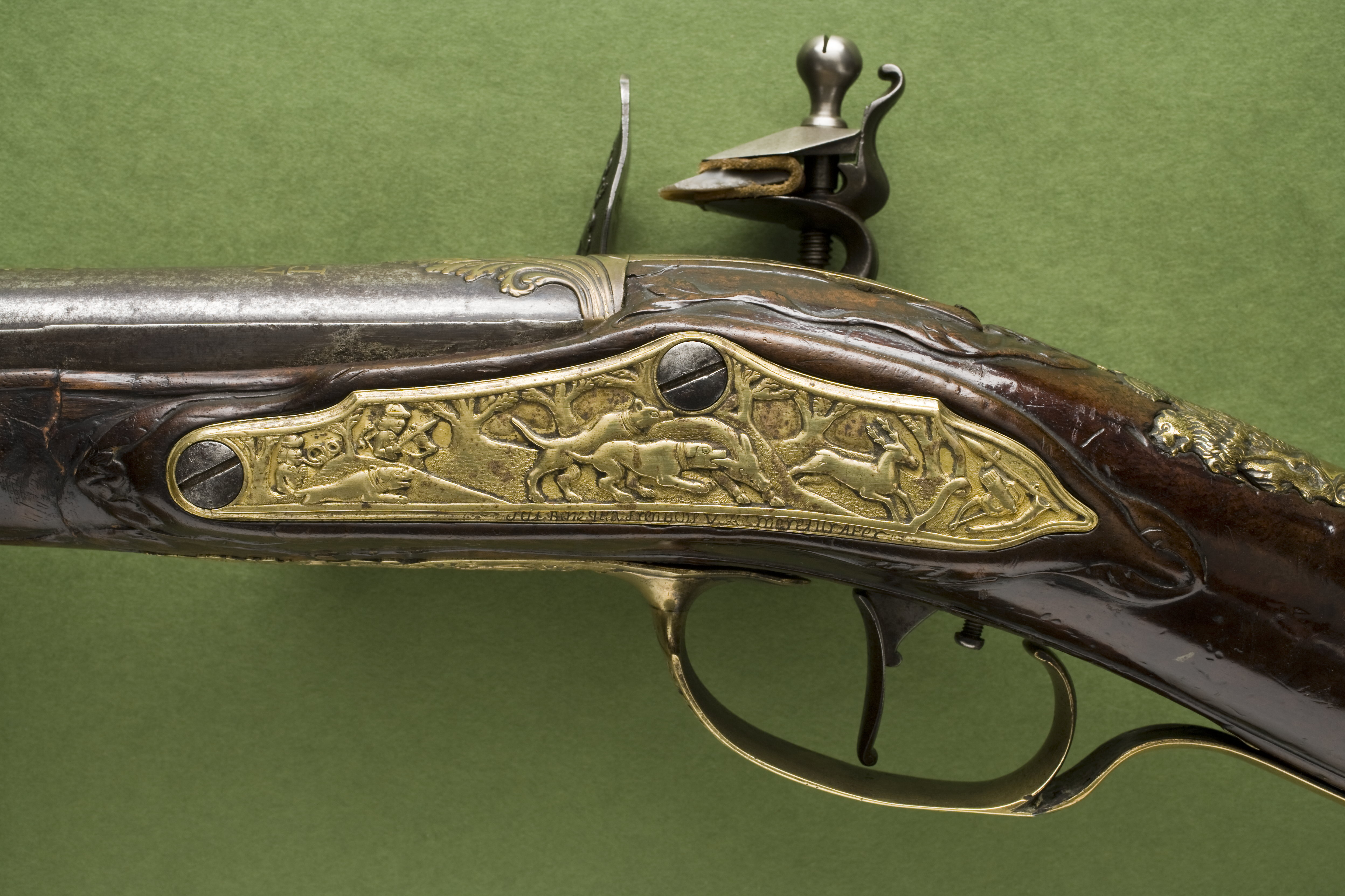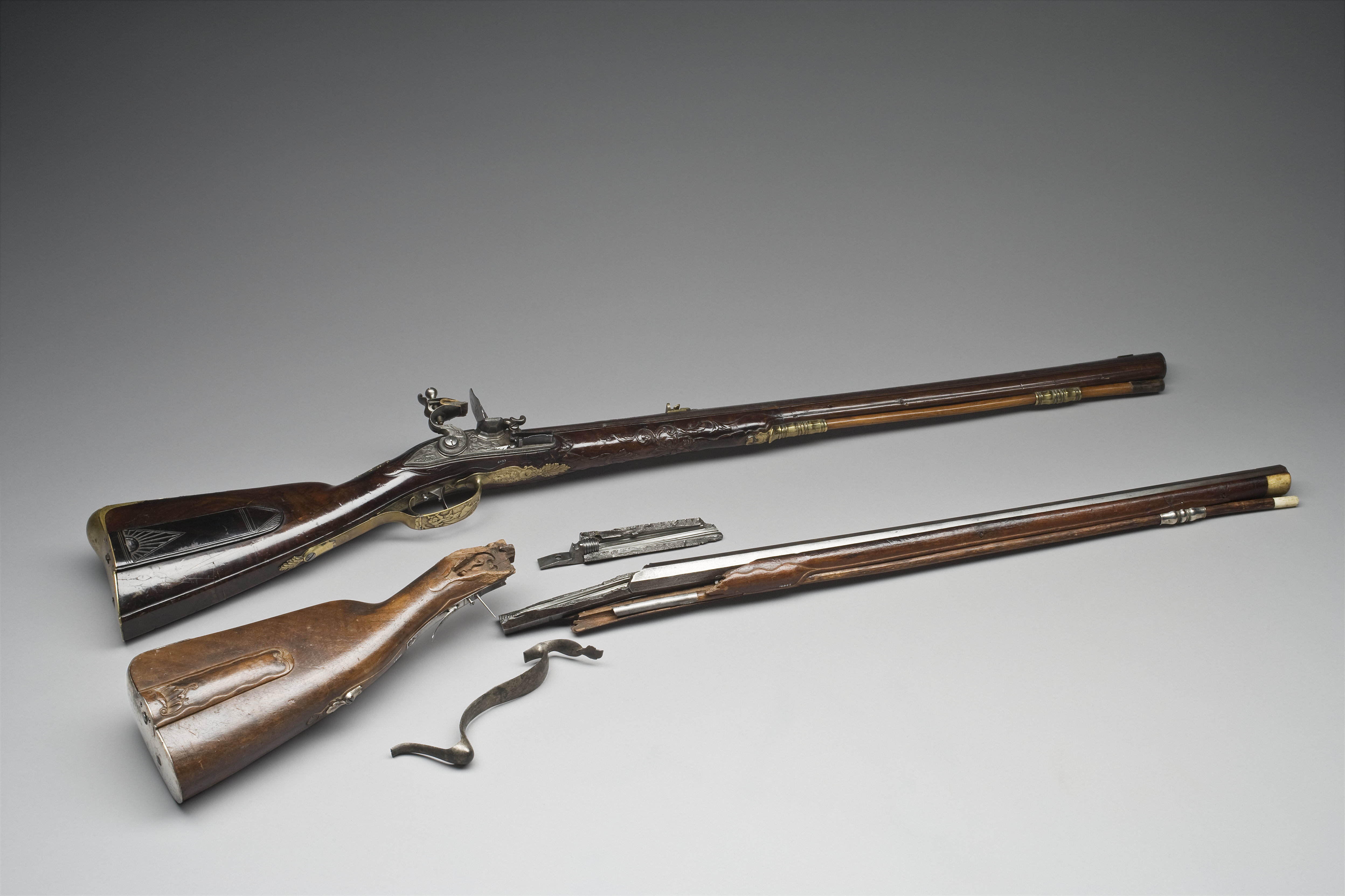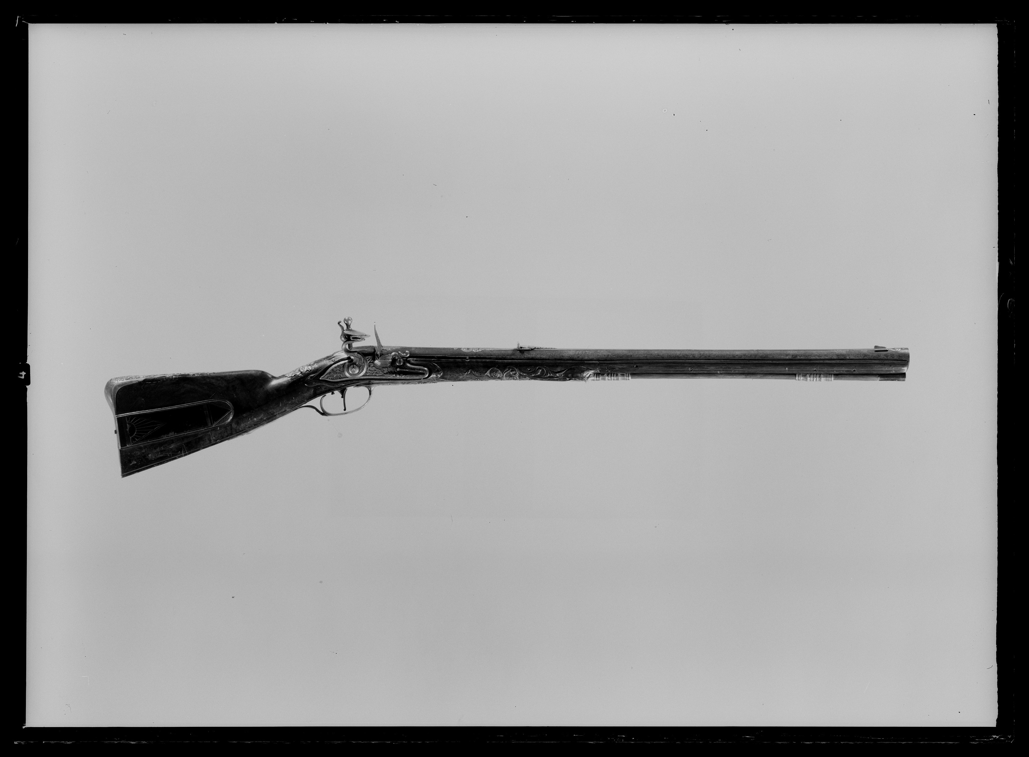 Rund, brunerad pipa, sju räfflor. På svansskruvbladet, kammaren runt siktet och kornet inslagen dekor av förgylld mässing i form av lister, blad, voluter och mas-karoner. På pipans mittparti och bakåt från mynningen går två kilformiga åsar med list av inslagen mässing. På kammaren inslaget: "M. C. PISTOR". Riktmedel: Klaffsikte och stolpkorn av förgylld mässing. Fästning: Tre häften. Pipan fäst med krysskruv och tre pipstift av stål. Flintlås av stål med plant låsbleck och fasade kanter. Dekor i stålsnitt i låg relief, bakom hanen betande hjortar, framför hanen en liggande jägare, på den s--formiga hanen ett vildsvin och ett fantasidjur. Lös överkäke med fasade sidor. Kantig fängpanna med fals, eldstål med ansiktsmask på ryggen. På låsbleckets nedre kant graverat: "Ecce Vigilando Quiescit M.C.PISTOR Offenbacensis" (Se den vilande men ändå vakne M C Pistor från Offenbach). Fästning: Två låsskruvar. Svagt s-formigt svängd avtryckare. Helstock av valnöt med kolv av fransk typ, kolvlåda med lock av trä, snidad dekor i form av trianglar. Kolvlådan invändigt klädd med filt. Snidad dekor i form av blad vid kindstödet, snidad dekor bakom svansskruvbladet samt mellan varbygel och spets-rörka. Beslag av gjuten, förgylld mässing. Bakplåt med kraftig flik på kolvryggen, dekor i form av Diana jagande hjort och vildsvin, på kolvhälen graverat: "SYL..COUS (INSU)LA COGNITA NYMPHIS". Tumplåt i form av Hessen-Kassels vapen krönt av grevekrona. Sidbleck med dekor i form av jaktscen med två jägare, hundar, vildsvin och hjort. På bleckets nederkant graverat: "Scit Bene qua frendens valle moretur aper" (ung. Huru skönt i den dal där vildsvinet dör). Två balusterformiga, kantiga rörkor, spetsrörkan med spets i form av fantasidjur. Varbygel med kraftig bygel och profilerad främre arm, dekor på bygeln i form av hjort- och vildsvinsjakt, på främre armen en hund som huggit en fälld hjort, därframför en drake med ett stort, flikigt blad i munnen. Tillbehör: Laddstock av trä, l: 722 mm, ena änden skodd med horn, l: 37 mm, andra änden ett mässingsrör, l: 93 mm.