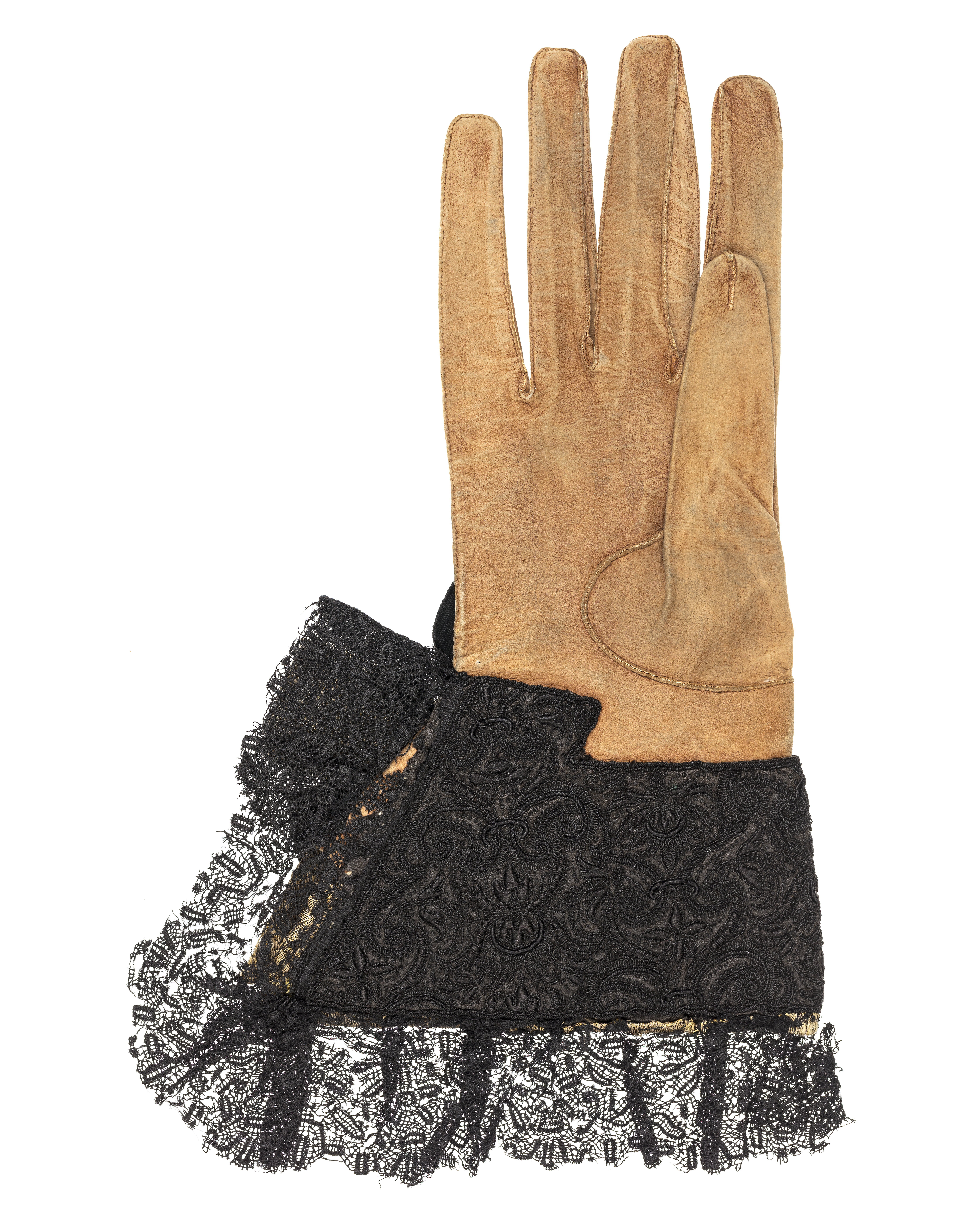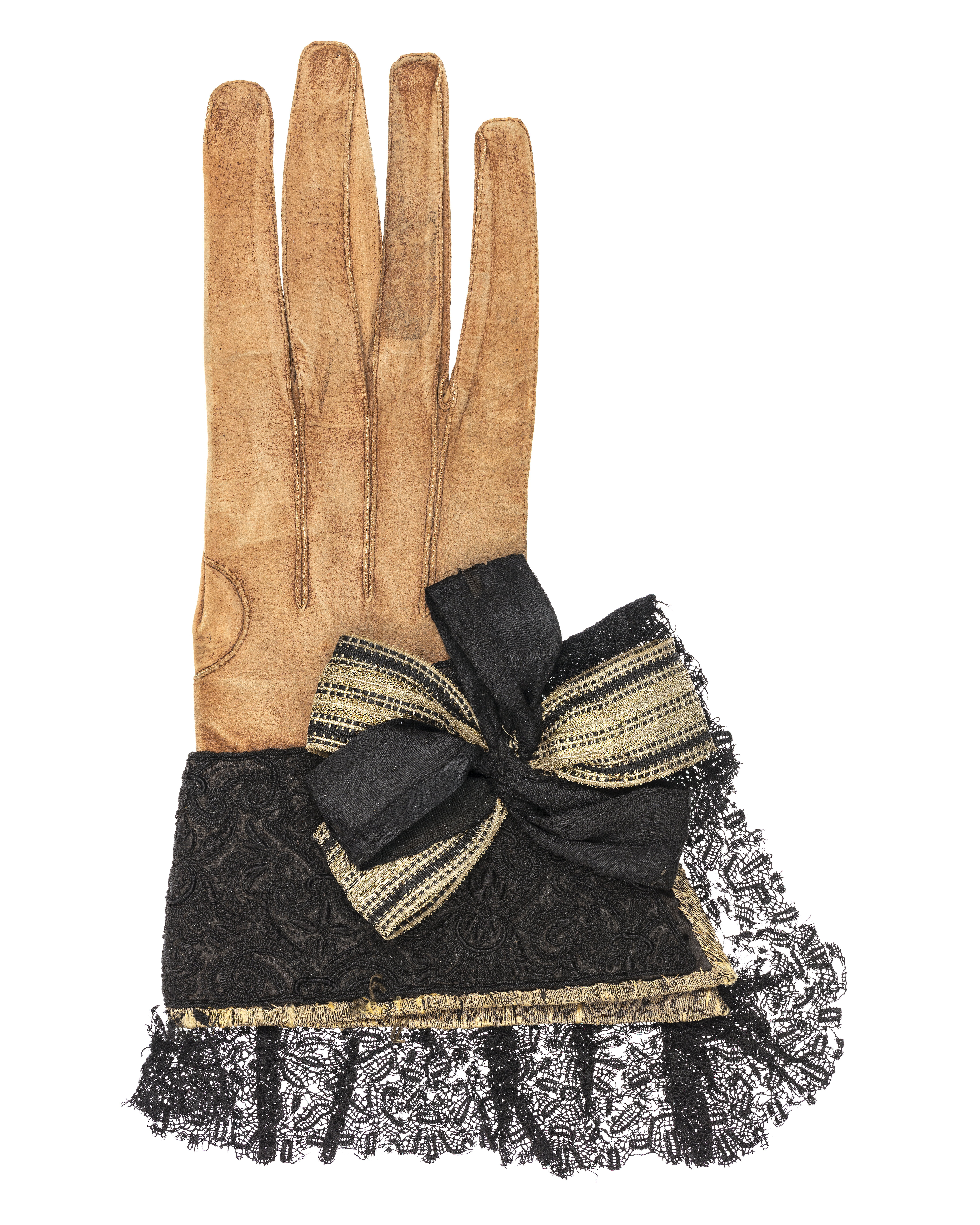 Handske av brunt sämskat skinn med svart, slät atlas broderad med svart silke. Har tillhört Karl X Gustav (1622-1660).