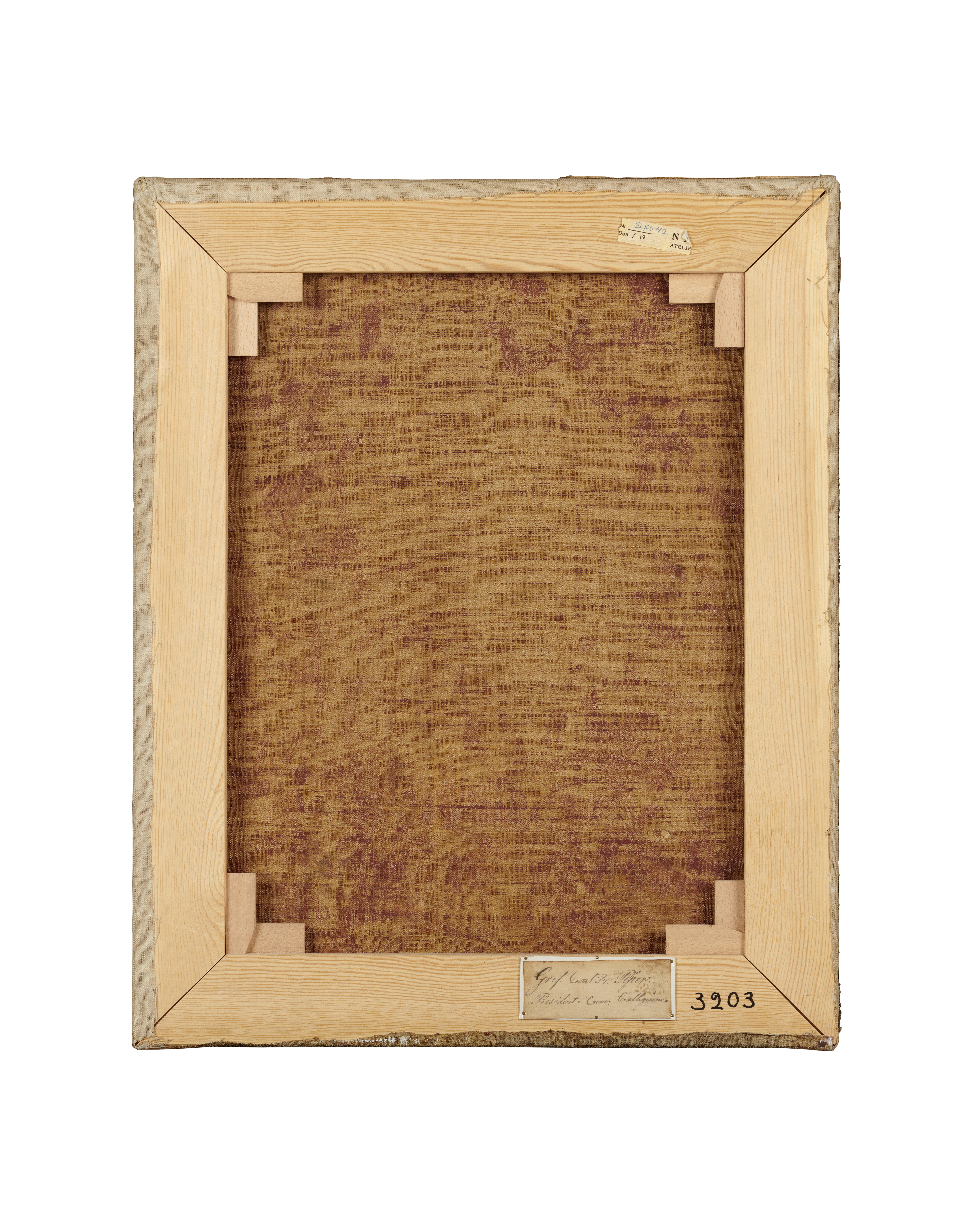 Oljemålning på duk. Bröstbild, fas, huvudet höger, kroppen vänster. Vit peruk. Grå justaucorps, vit väst och ljusröd mantel. Vitt spetskrås. Serafimerordens axelband och kraschan, nordstjärneordens kommendörstecken. Grågrön bakgrund. På dukens baksida 1800-talslapp: "Gref. Carl Fr. Piper President i Cam. Collegium". Stiftad spännram. Förgylld ram med skurna musslor och akantusslingor. Ramlistens bredd 65 mm. Bakpå ramens nedre list "No 2" (?) upp och ner med rödkrita. Bakpå högra ramlisten åtta (?) streck med rödkrita. Listens insida avskuren. Spännramens och ramens delar märkta med ett blyertsstreck.