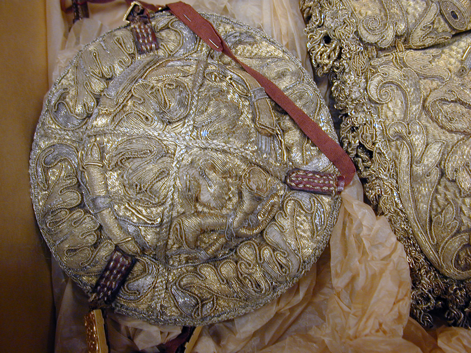 Förbygeln är af rödt läder. Beslaget består i 119 pucklor och söljor, ofvanföre ornerade med drifvet arbete af förgyldt messing.