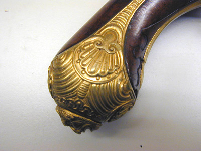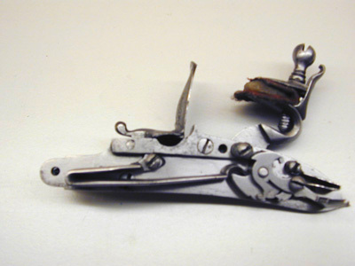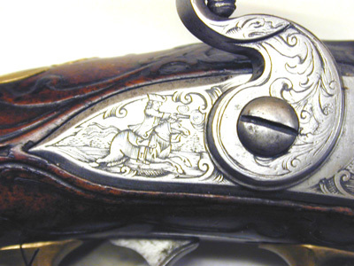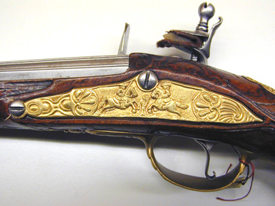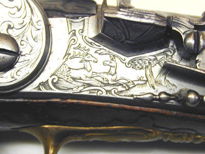Rund, slätborrad pipa med kantig kammare, profilerad ring vid övergången. På kammarens ovansida dubbla kantlister, på mittlisten tre lister, varav två fortsätter bakåt på svansskruvbladet nästan till skruvhålet. Svagt böjt, baktill tvärt avskuret svansskruvblad. Pipan fint bearbetad på alla sidor. Riktmedel: Spolformigt korn av mässing. Fästning: Ett, ursprungligen två häften, det främre saknas. Flintlås med plant låsbleck, fasade kanter. Graverad dekor, bakom hanen en ryttare som avlossar en pistol framåt, framför hanen två i landskap liggande hjortar. S-formigt svängd hane med graverad rankdekor, förtjockning vid övergången till halsen, graverat djurhuvud. Nästan cirkelrunda käkar, överkäken lös, käkskruv med balusterformigt huvud, graverad rankdekor på överkäken. Fasetterade fängpanna med graverad dekor på undersidan. Batteri med plan, konturerad eldstålsrygg, graverad dekor. Batterifjäder med delvis fasade kanter, balusterformigt fjäderlöv. Fästning: Två låsskruvar. S-formigt svängd avtryckare med upprullad ände, konturerat avtryckarbleck. Helstock av valnöt med skuren rankdekor i låg, plan relief kring alla beslag utom kolvkappans flikar. Näsband av horn, övriga beslag av förgylld mässing. Kolvkappa med långa flikar, på kappan fyra palmetter och däremellan bågformig dekor. Oval centrumplatta med mansmaskaron i relief. Oval tumplåt med palmettdekor i låg relief. Helt sidbleck med två ryttare ridande mot varandra i relief mot punsad bakgrund, flankerande palmetter. Spetsrörka och överrörka med rundad spiraldekor, slät spets med dubbla kantlinjer. Varbygel med reliefdekor, jägare som laddar bössa, vid fötterna en sittande hund, allt mot punsad bakgrund. 8-formig främre arm med kantlister och oval på mitten, framtil urna och flikigt blad. Bakre arm med fasade kanter, ovalt ändblad. Tillbehör: Laddstock av trä, l: 302 mm, ingen skoning.