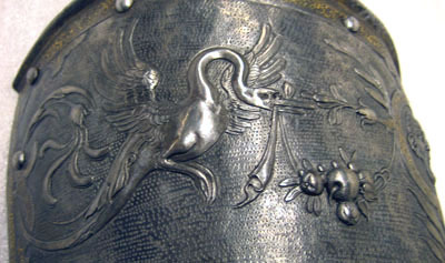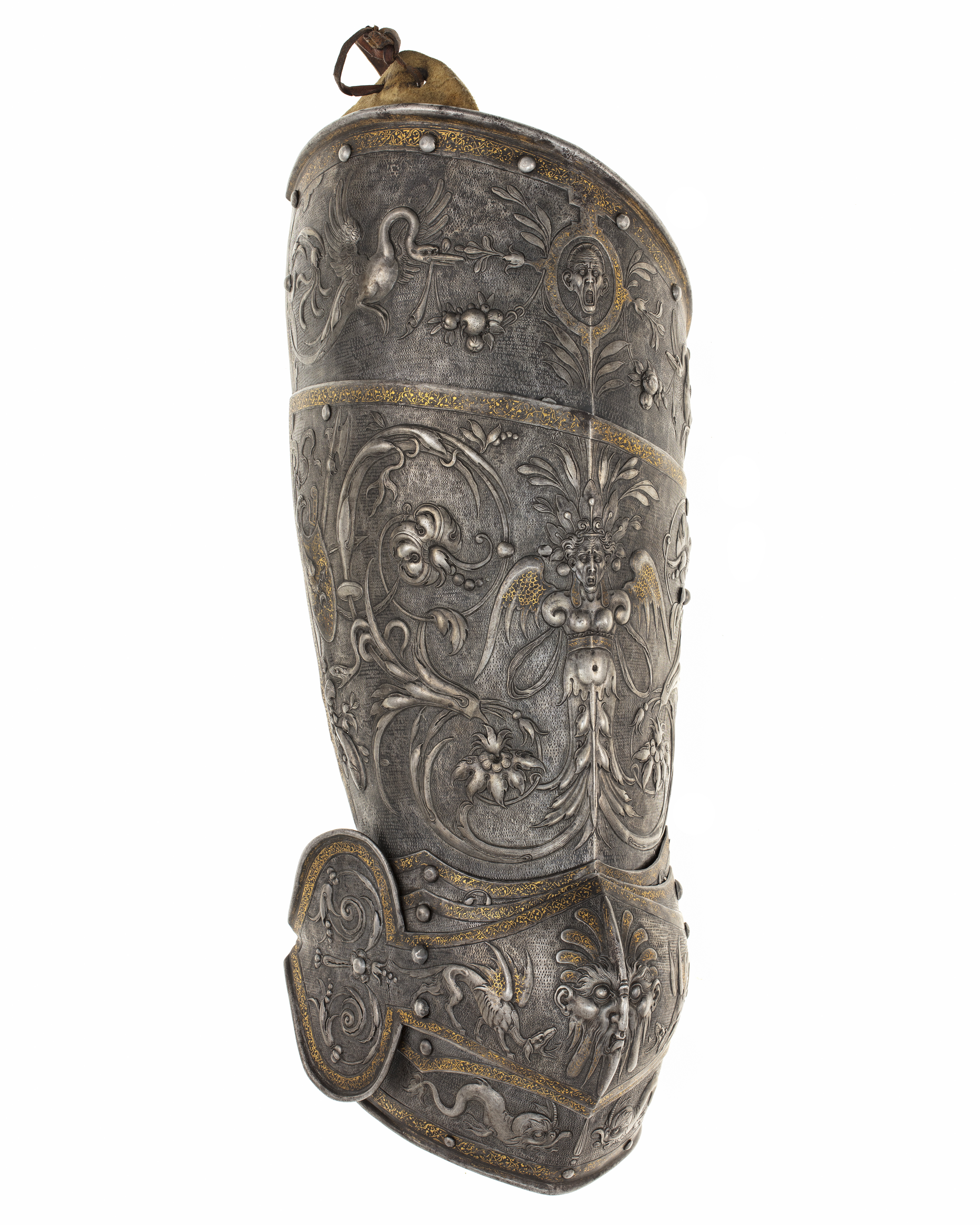 Av driven stålplåt av sammanlagt sju delar. Övre del av två större välvda skenor. Övre kanten omvikt, rundsmidd, snett avtagen och lutande inåt. Sidorna raka och släta. Upptill en nitad triangulär sämskad läderbit med brun läderrem, för att fästa lårpansaret i harnesket. Knäbuckla, välvd med övre och undre kant utdragen till spets och vertikal mittås. Avsmalnade åt sidorna, inåt tvärt avslutad och utåt övergående i oval mussla med rundade kanter och i mitten V-formig tvärt avslutad spets. Över bucklan två mindre skenor, under bucklan en mindre och en större skena. Den synliga kanten utdragen till tre spetsar. Yttre kanterna omvikta och rundsmidda. Driven mittås löper över samtliga skenor även om den bitvis försvinner i dekoren. I inre kant upptill och nertill söljor, nertill sitter söljan i läderrem. På motsvarande plats mot utsidan två läderremmar med rester av svärtning, l 380 och 235 mm.