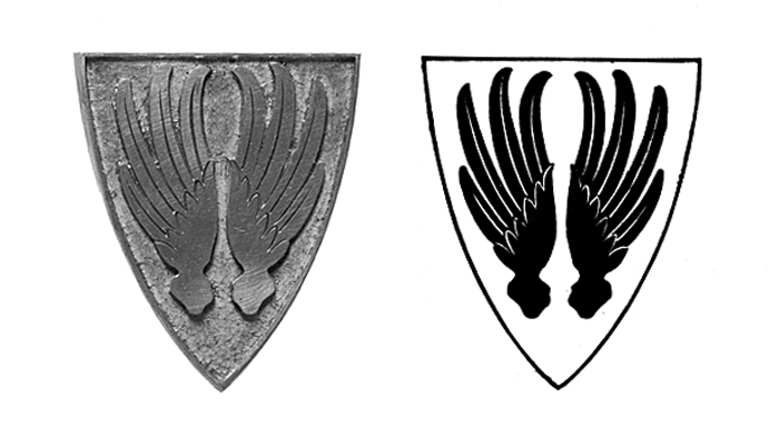 KLICHÉ (till presstryck på bokpärmar) Av mässing. Tjock sköldformad skiva, på vars ena sida i relief von Hallwylska sköldemärket (ett par örnvingar, s. k. örnflykt); kring ytterkanten en smal list. Höjd: 7,8 cm.; bredd: 6,6 cm.; tjocklek: 0,7 cm. Utförd efter beställning av Wilhelmina von Hallwyl i September 1925 hos Bengt Silfversparres Kemigrafiska AB.