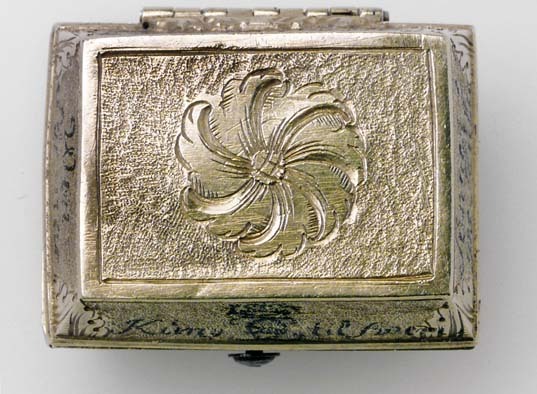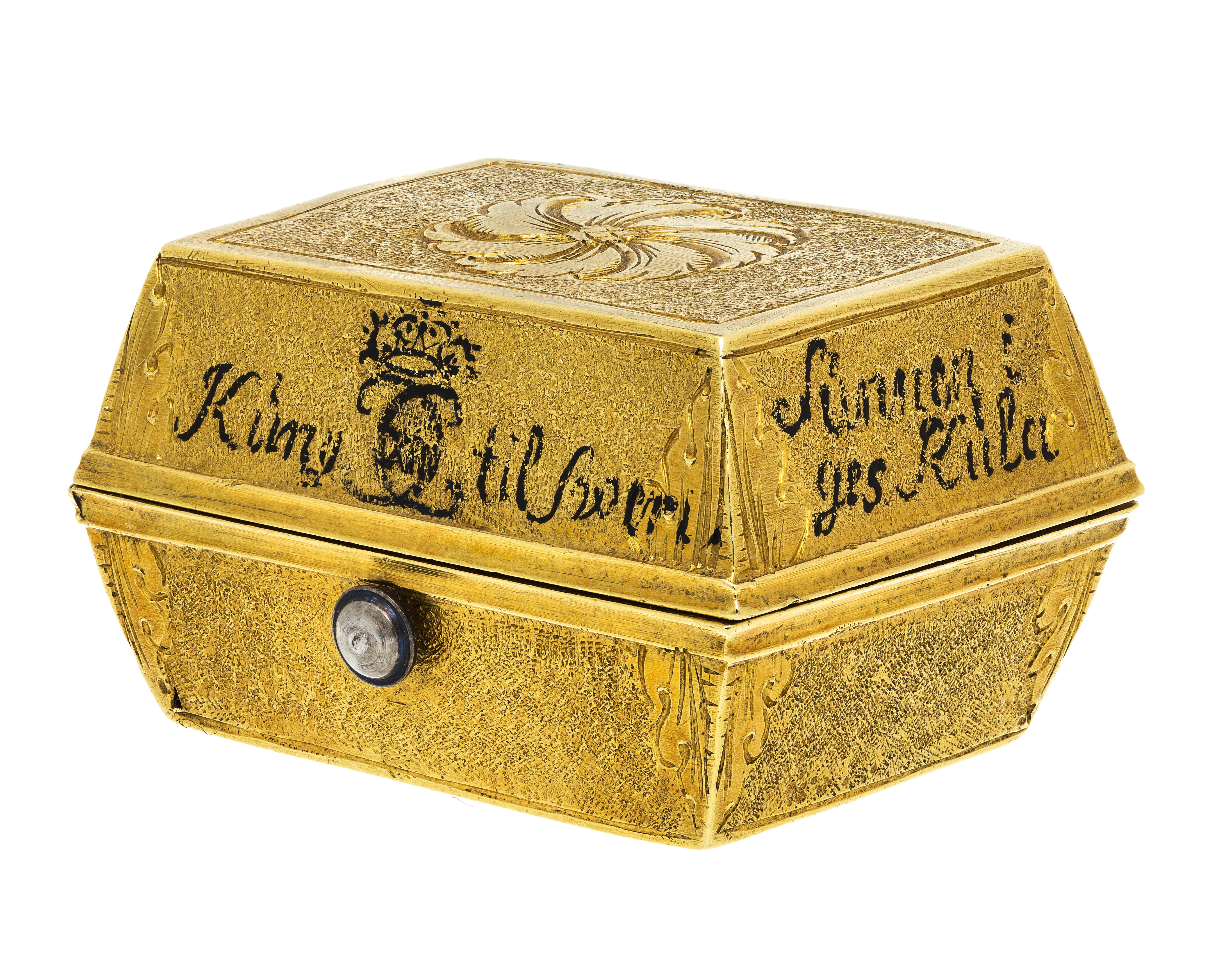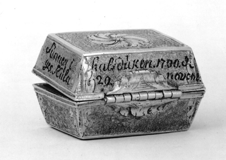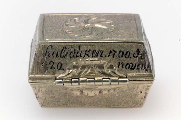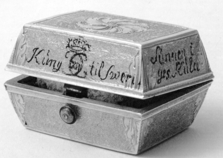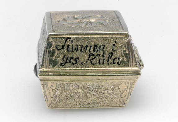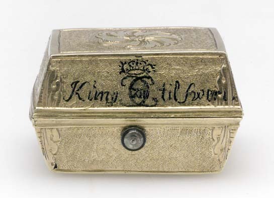 Rektangulär dosa av guld. Runt lockets sidor står skrivet med svart färg: "Kung (spegelmonogram CXII) til Swerig. // ges Kula // funnen i // halsduken 1700 d. // 20 novem", samt på fjärde sidan otydligt: "Wen // för..nar". Texten avser slaget vid Narva. Dosan har lika högt lock som underdel (9 mm), lutande sidor. Längs kanterna finns släta kantbårder, i övrigt har dosan punsade sidor, vid hörnen graverad med bladdekor. På lock och undersida finns ett blomliknande, runt ornament med s-formiga, tvärgående band. På bakkanten ett gångjärn, fäst på lock och underdel med bladornament. Fjäderlås av blånerat stål. Dosan invändigt klädd med blå sammet, innehåller starkt vittrade rester av en blykula.