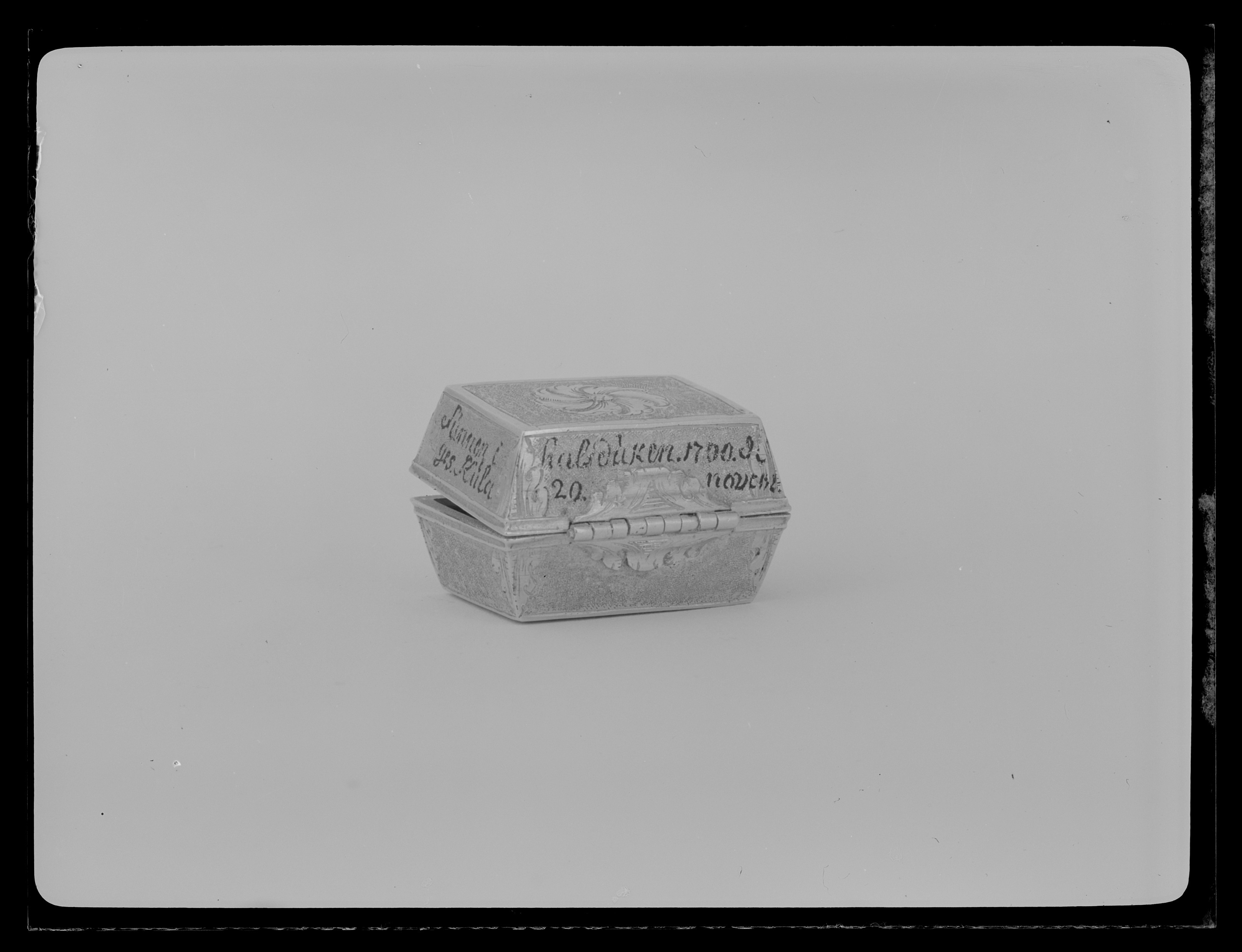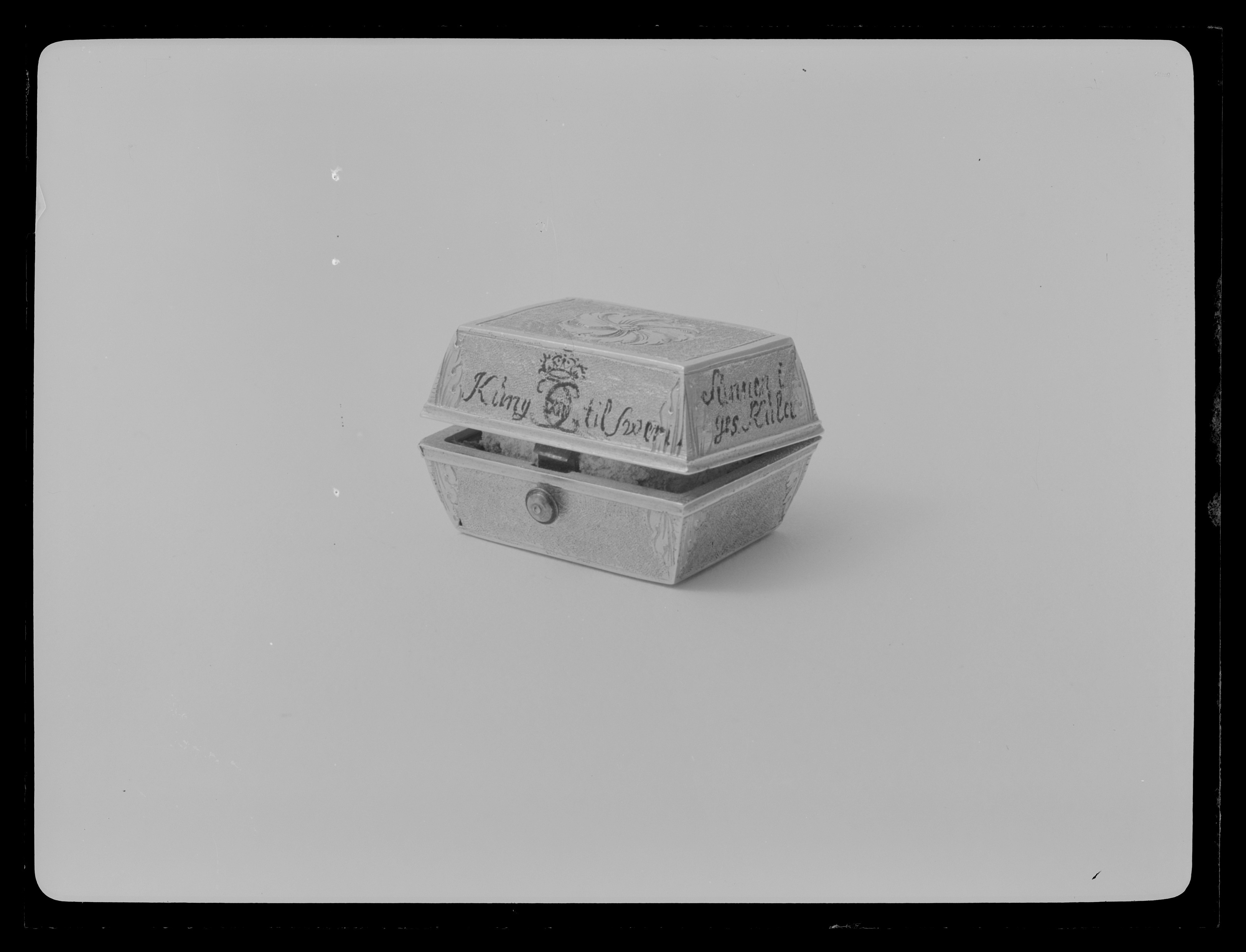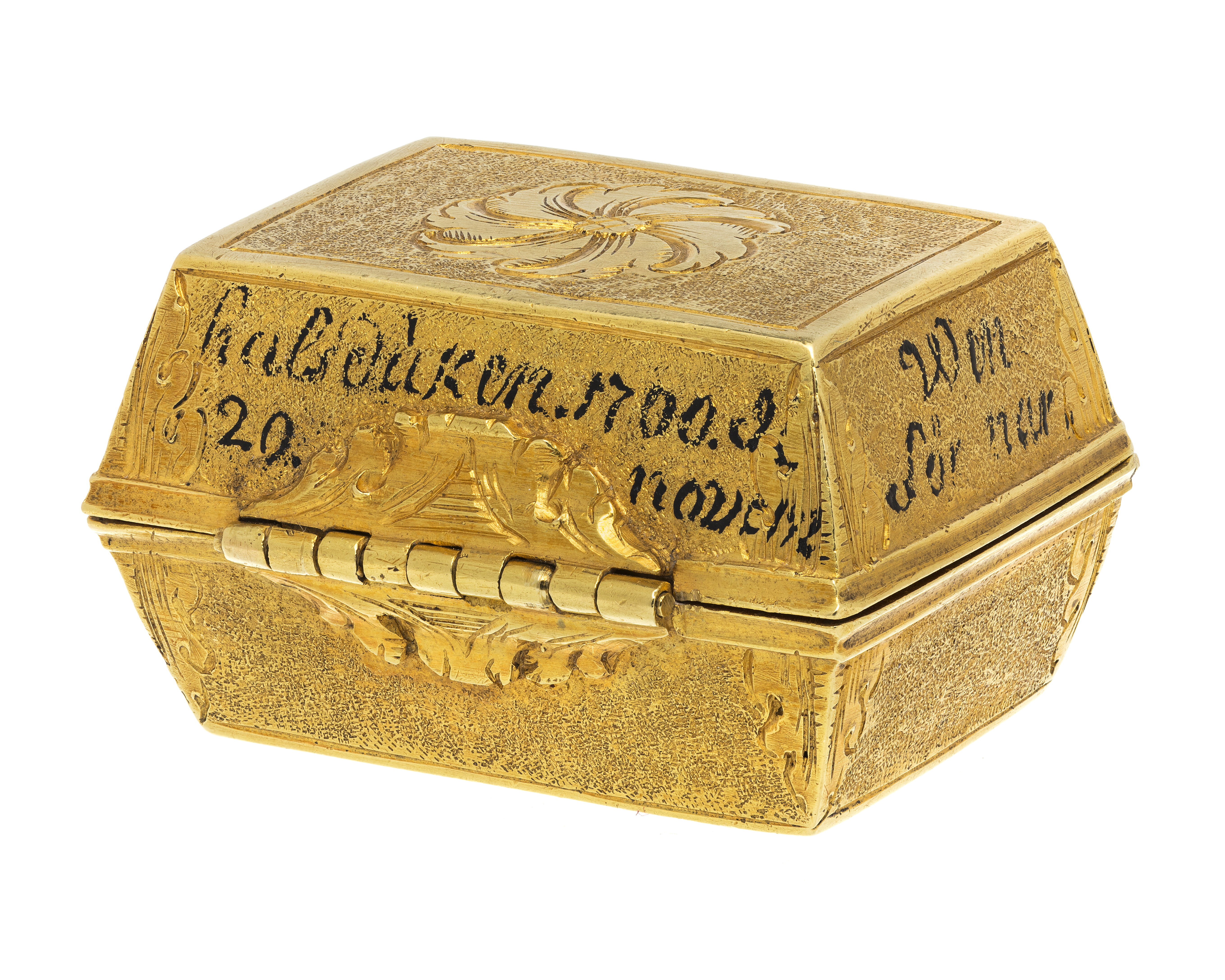 Rektangulär dosa av guld. Runt lockets sidor står skrivet med svart färg: "Kung (spegelmonogram CXII) til Swerig. // ges Kula // funnen i // halsduken 1700 d. // 20 novem", samt på fjärde sidan otydligt: "Wen // för..nar". Texten avser slaget vid Narva. Dosan har lika högt lock som underdel (9 mm), lutande sidor. Längs kanterna finns släta kantbårder, i övrigt har dosan punsade sidor, vid hörnen graverad med bladdekor. På lock och undersida finns ett blomliknande, runt ornament med s-formiga, tvärgående band. På bakkanten ett gångjärn, fäst på lock och underdel med bladornament. Fjäderlås av blånerat stål. Dosan invändigt klädd med blå sammet, innehåller starkt vittrade rester av en blykula.