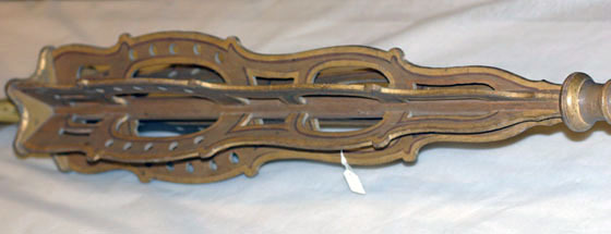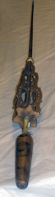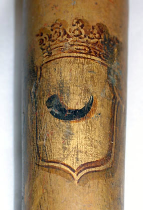 Lans bestående av kolv, handtag, stödskiva, vingar, holk, spjut och spets. Lansen målad i gul grundfärg. Bakåt avsmalnande cylindrisk kolv med rundade ändar. Kolven dekorerad med grevliga ätten Horns hjärtsköld med guldbotten med svart, dextervänt horn. Skölden är krönt av en grevlig krona. Kolven är dessutom dekorerad med sex spridda, svarta horn. Handtaget är klätt med gult blomstermönstrat siden. I handtagets båda ändar finns fransar av tvinnad guldtråd. Stödskiva av trä i form av sexuddig stjärna med rundade kanter, målad i gult och med guldkant. I skivan och stången intappat sex tunna bräder (vingar), kontursågade och genombrutna, målade i gult med guldfärgade och roströda kanter. Vingarna konturerade i fyra runda bågar, avsmalnande uppåt och nedåt, den största bågen genombruten av fem runda hål. Svarvad balusterformig holk, gulmålad med roströda och guldmålade kanter. Framåt avsmalnande spjut, delvis gulmålat, delvis omålat. Spjutet är dekorerat med 2 svarta horn. Spets av järn? med konisk holk, 161 mm lång och spets, 26 mm lång.