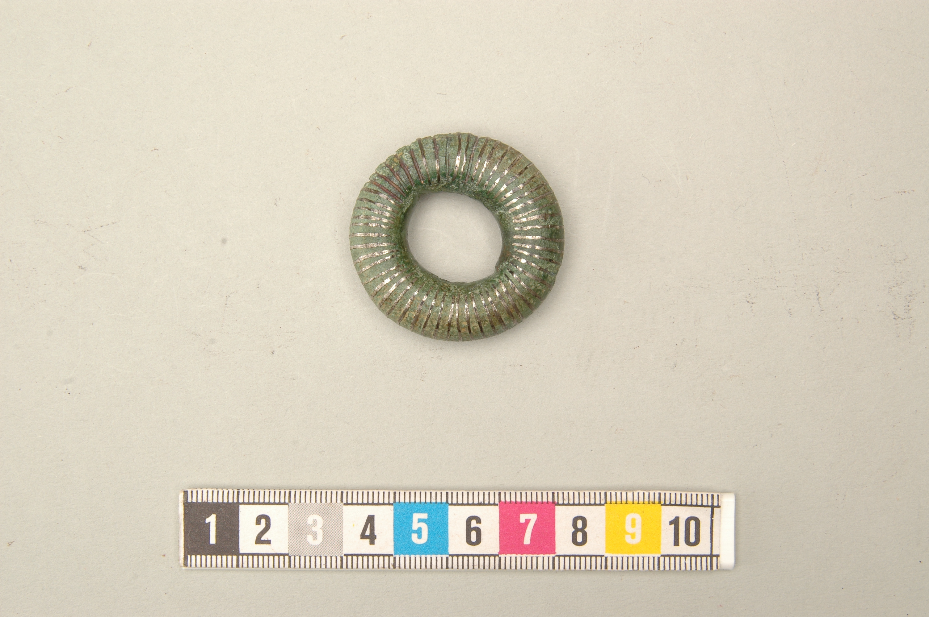 Tjock, sluten ring av brons med smala, inlagda, tvärgående silverränder.
