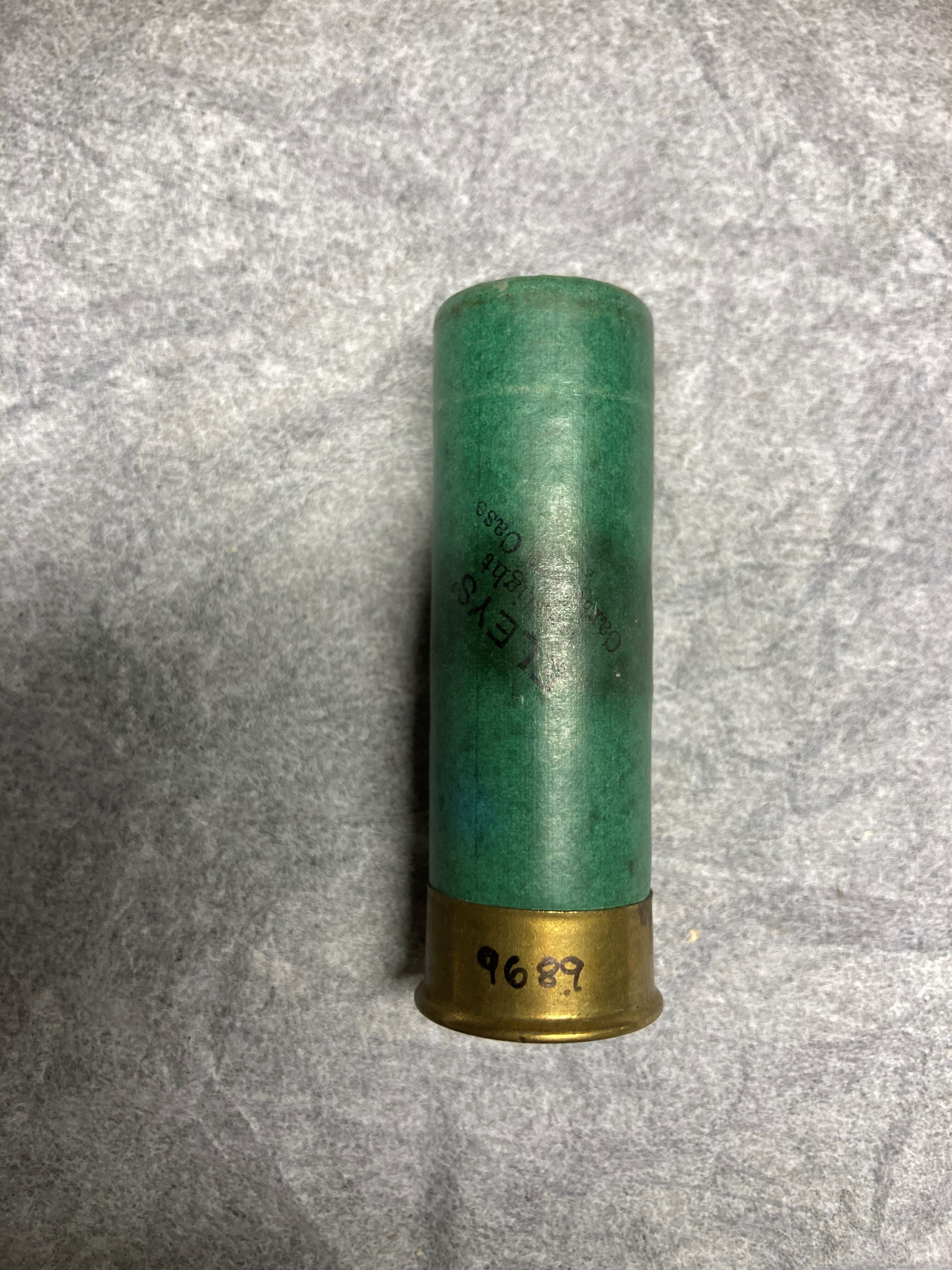 Patronbotten av mässing h: 9,5 mm, med fläns, koppartändhatt och däromkring text: "ELEY LONDON GASTIGHT" och tvärgående "No 12". Hylsa av grön papp, avriven vid kulan.