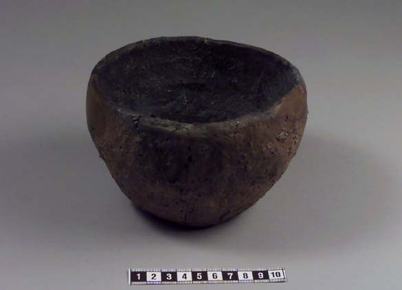 Grovt gods samt grov magring. Insvängd mynning övergår direkt till ett avsmalnande bukparti. H. 9cm, mynning 14,5 cm i diam, botten 8 cm i diam.
