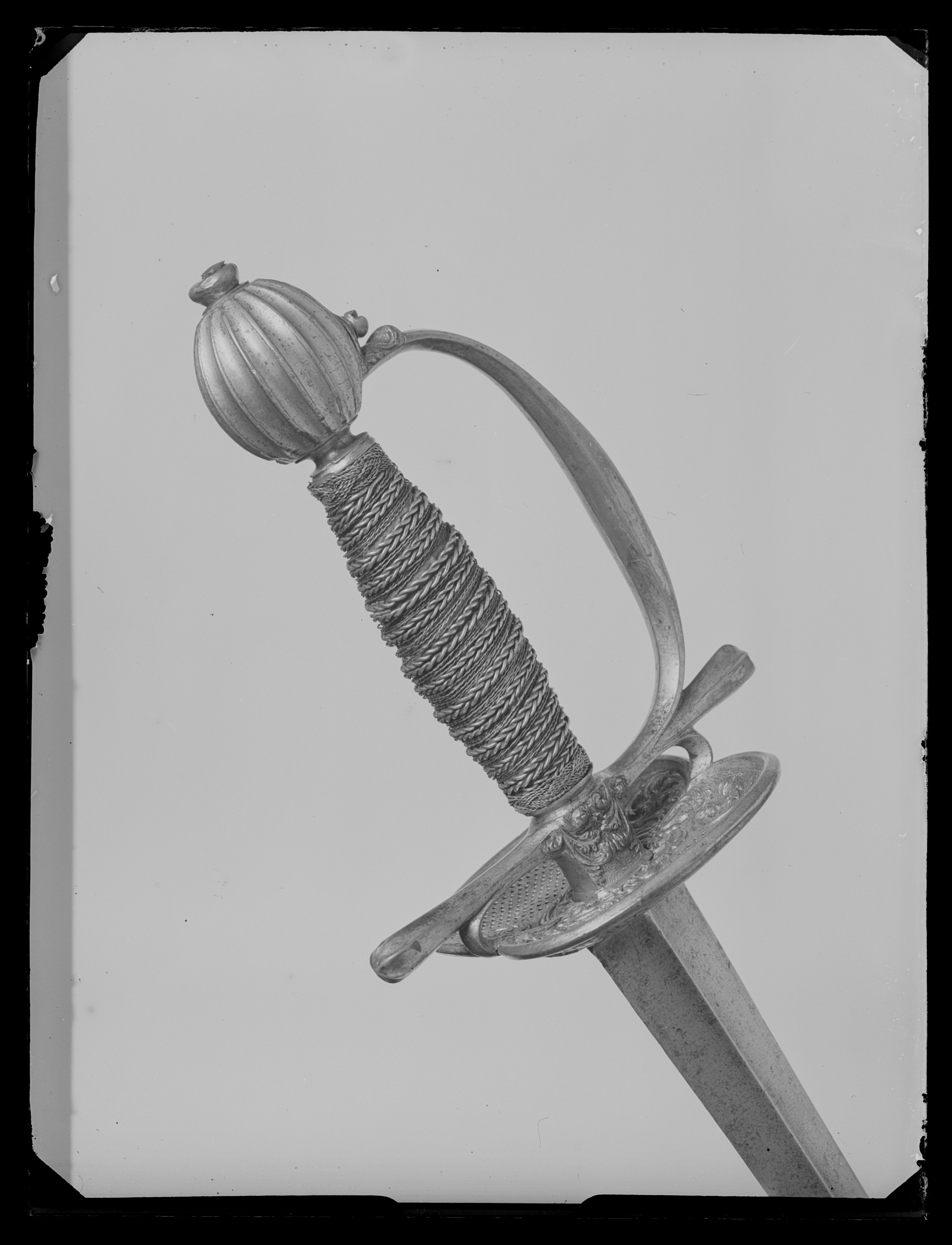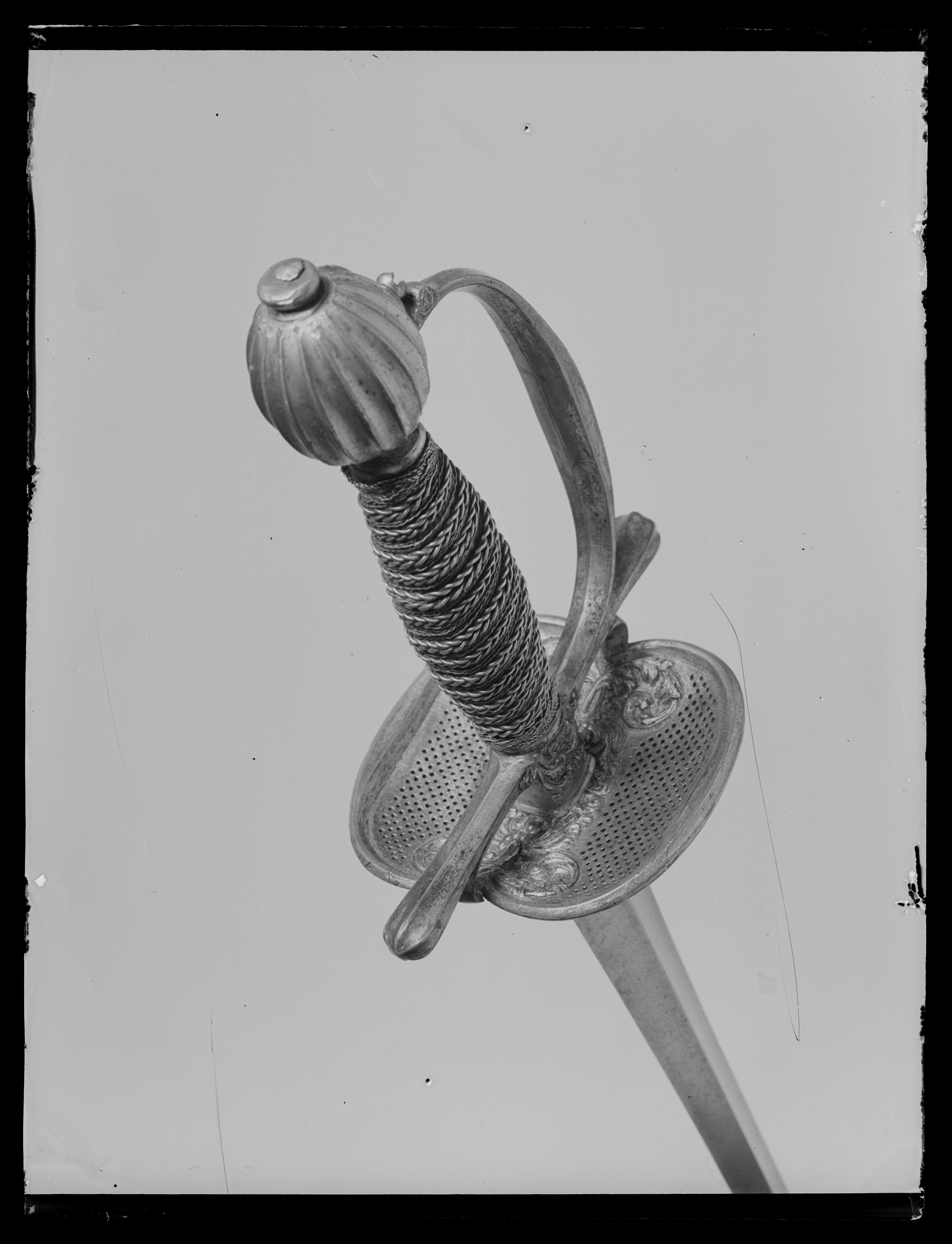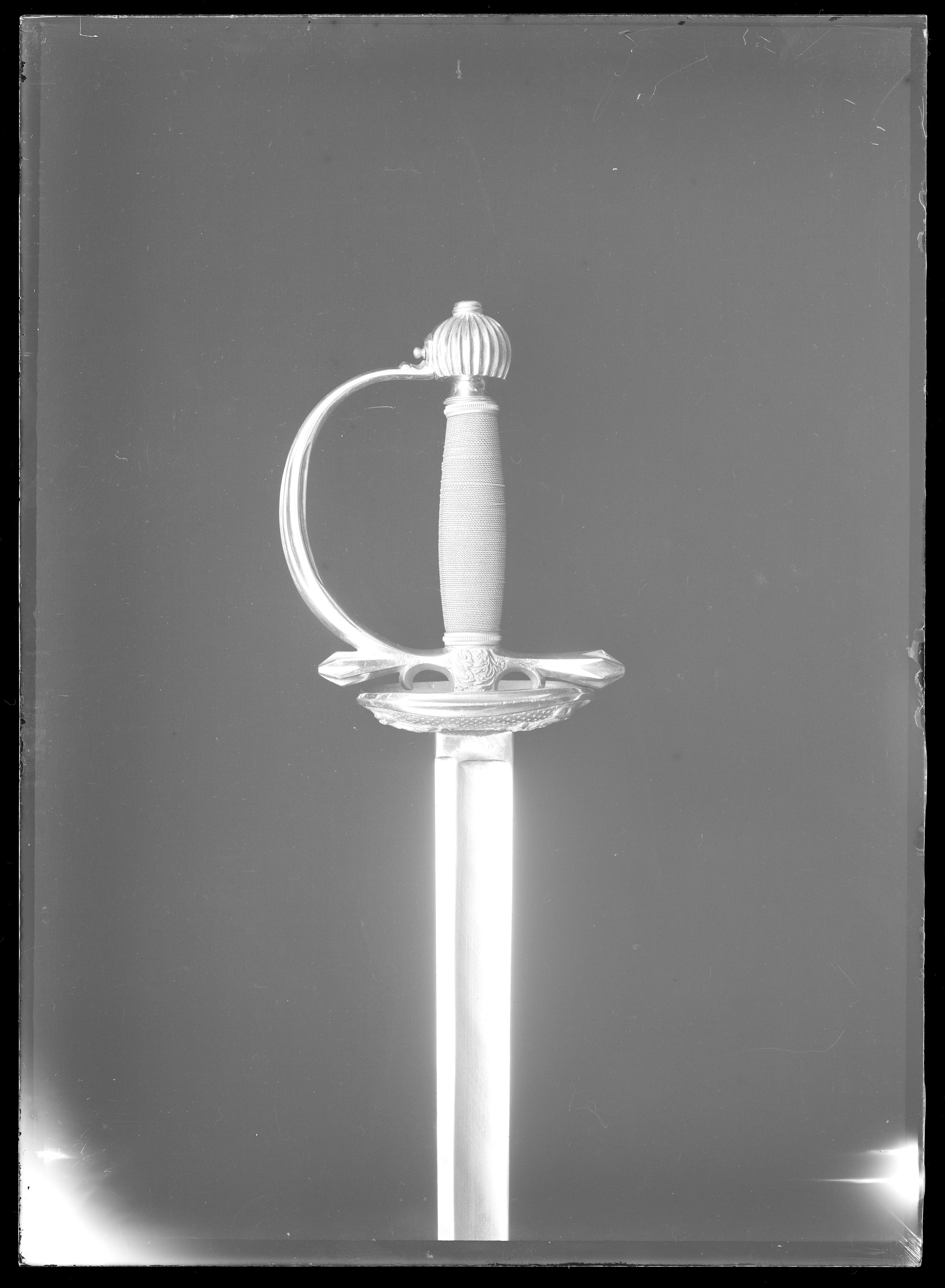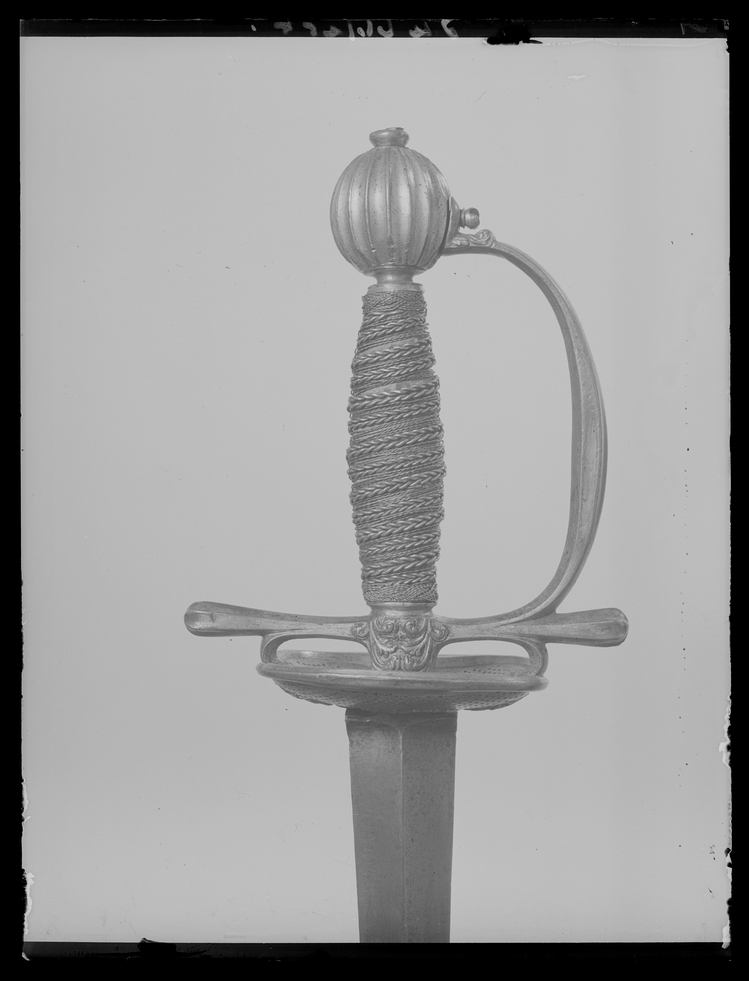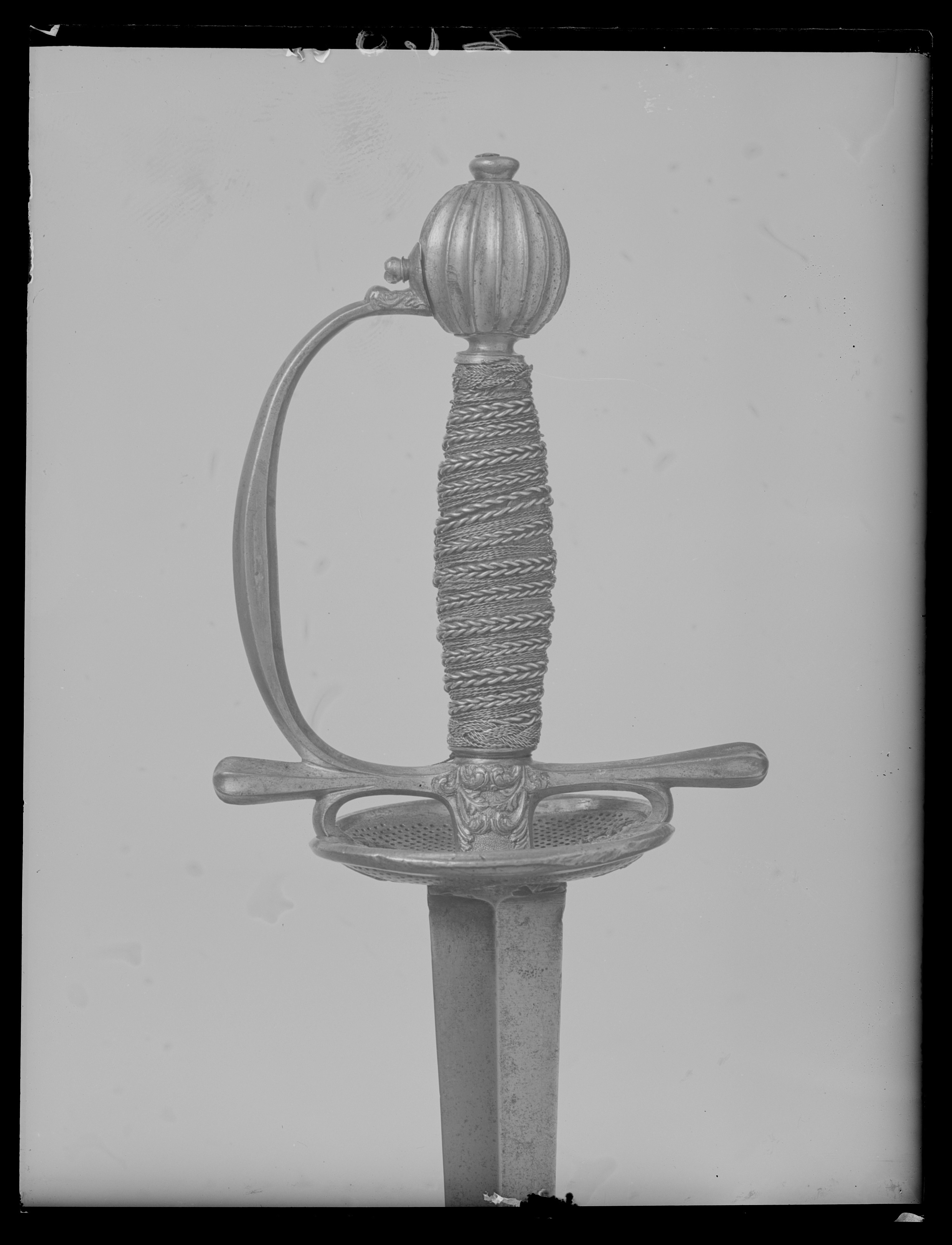 Fäste av förgylld mässing. Av normaltyp för fäste till kommendervärja av den variant som uppstod under slutet av Karl XII:s levnad. Kavellindning av två parter tvinnad, tjock silvertråd (ursprungligen förgylld), omväxlande med sex parter mycket tunn, tvinnad tråd, likaledes av silver. Klinga rak, kraftig, lång, slipad med mötande, jämnbreda skär. Utan ornering. Värjan har uppgivits vara den som Karl XII bar vid Fredrikshald, då han stupade. Enligt inventarium 1867 överlämnad av Riksmarskalksämbetet till Livrustkammaren från Riddarholmskyrkan. Överförd dit från Livrustkammaren 1817.