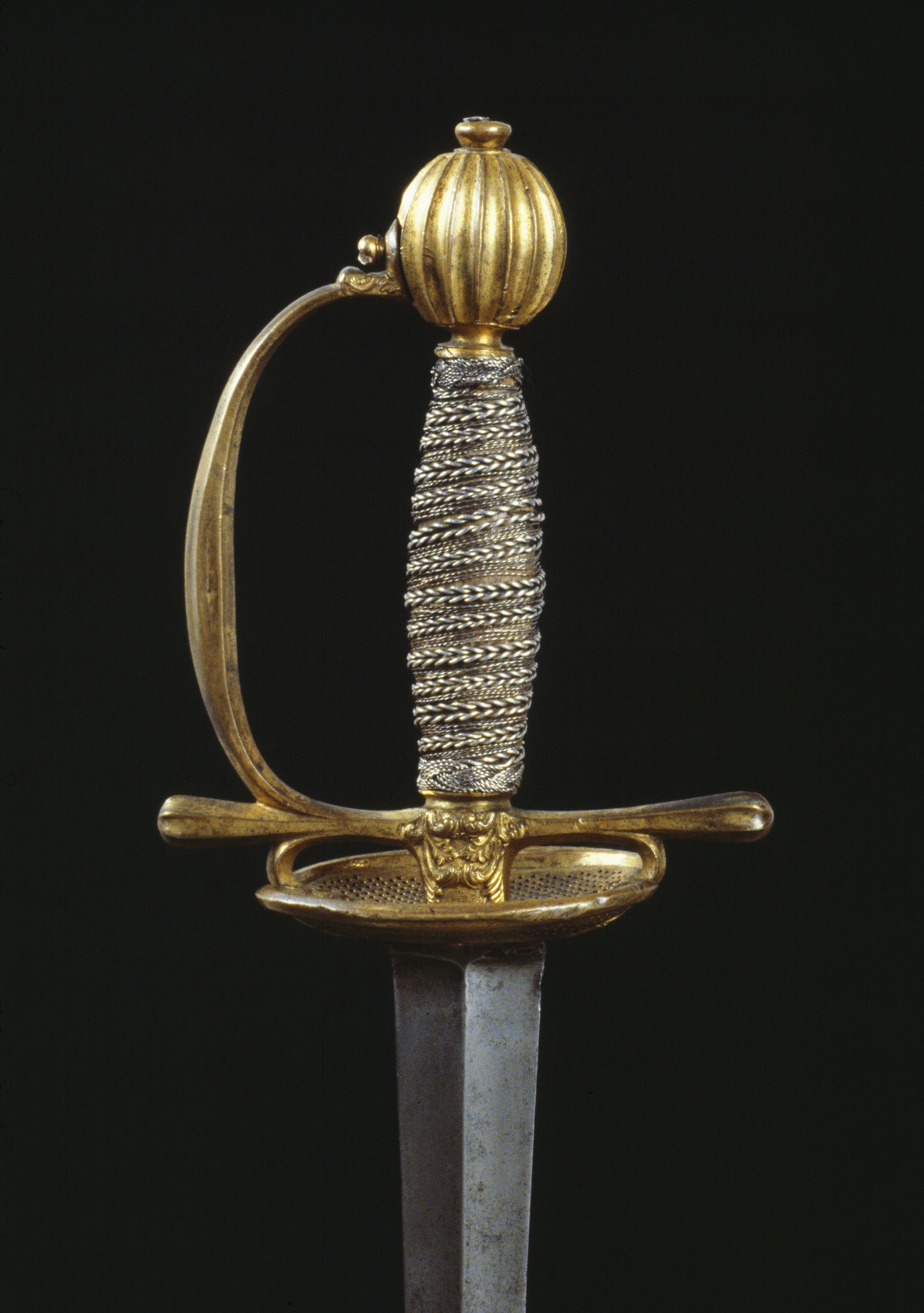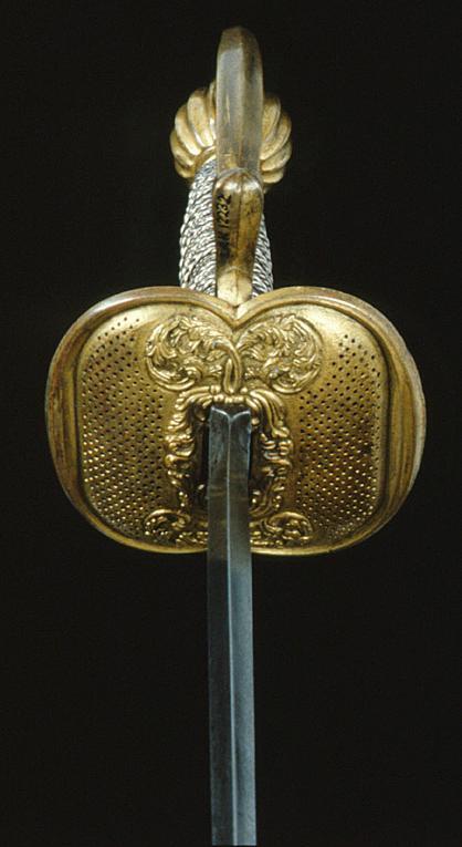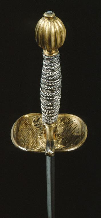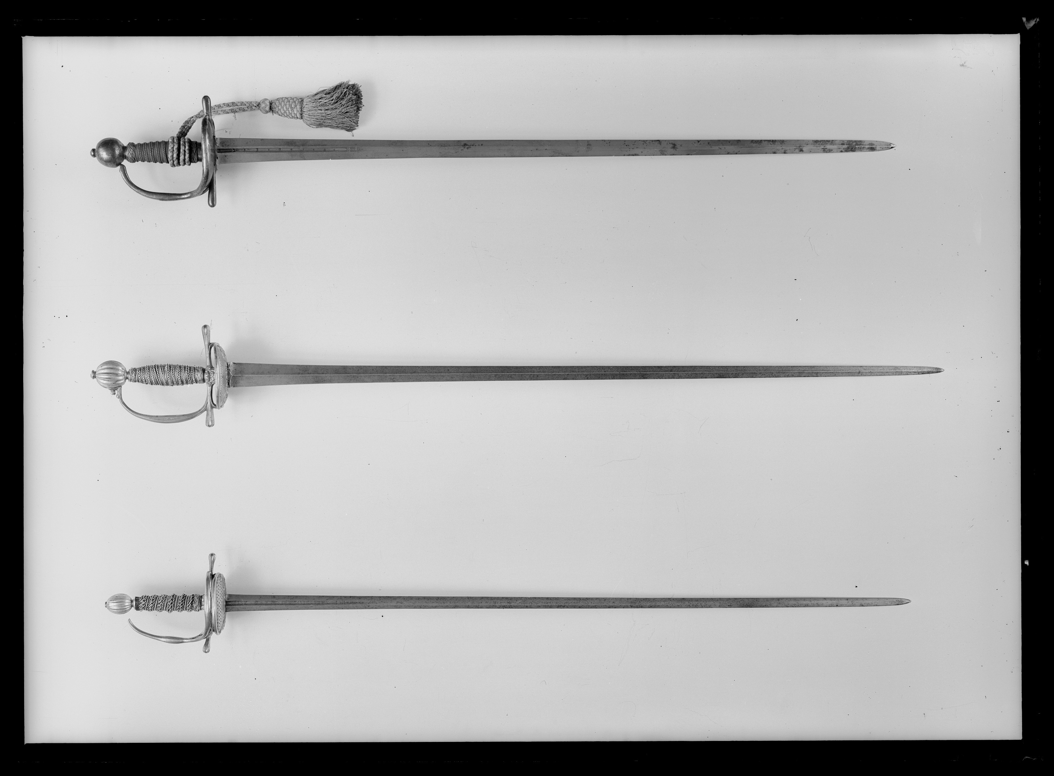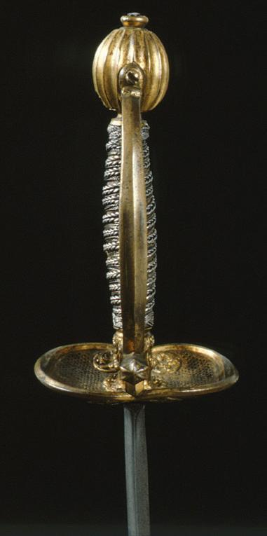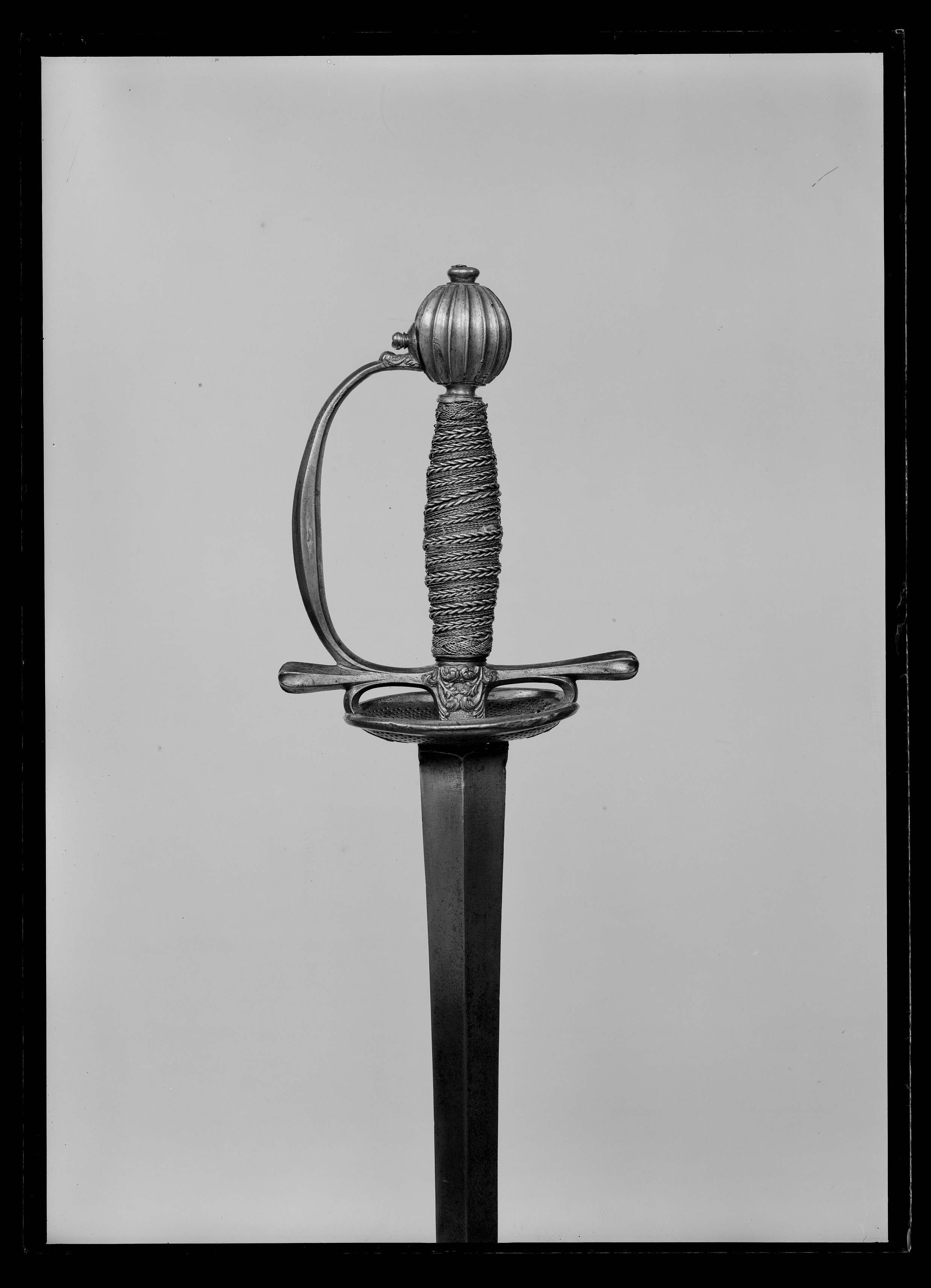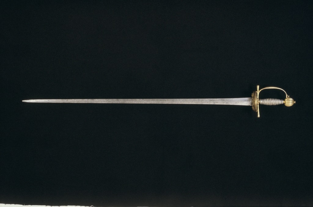 Fäste av förgylld mässing. Av normaltyp för fäste till kommendervärja av den variant som uppstod under slutet av Karl XII:s levnad. Kavellindning av två parter tvinnad, tjock silvertråd (ursprungligen förgylld), omväxlande med sex parter mycket tunn, tvinnad tråd, likaledes av silver. Klinga rak, kraftig, lång, slipad med mötande, jämnbreda skär. Utan ornering. Värjan har uppgivits vara den som Karl XII bar vid Fredrikshald, då han stupade. Enligt inventarium 1867 överlämnad av Riksmarskalksämbetet till Livrustkammaren från Riddarholmskyrkan. Överförd dit från Livrustkammaren 1817.