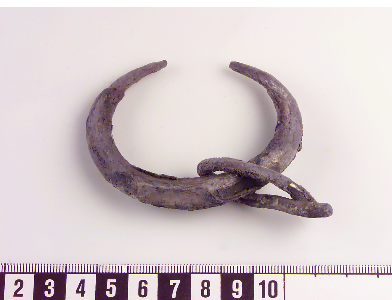 Armbygel av mångkantig ten med avsmalnande ändar. Slät? Med omvikt ten med något kantigt tvärsnitt.