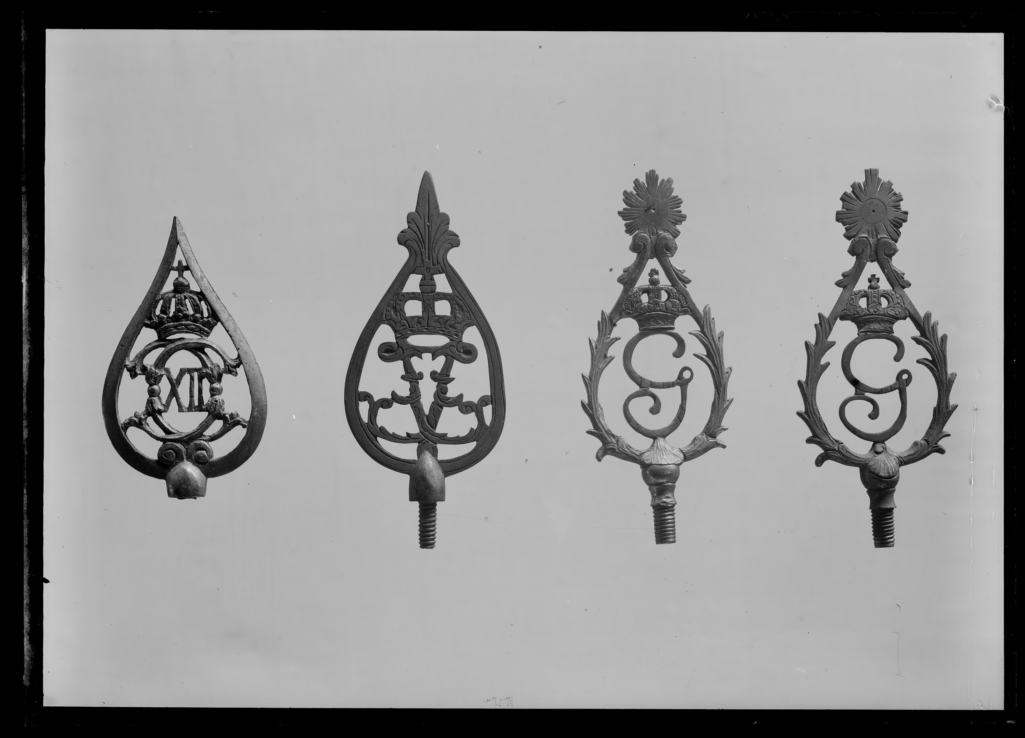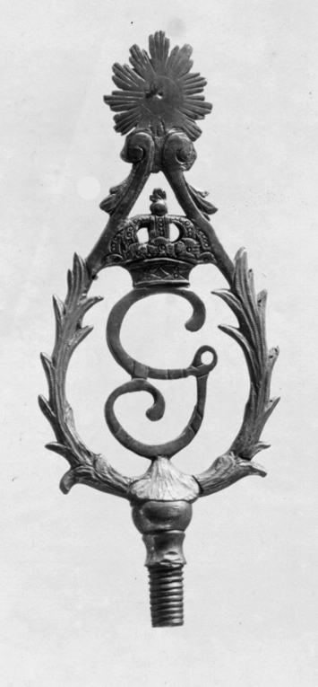 Utdraget, droppformigt blad av förgylld mässing med snidad och punsad ornering, avslutad med ett plant ornament med strålformig kontur. Bladet genombrutet i form av ett G (Gustav III) krönt av sluten krona, kanten med bladornament. Från bladets nederdel utgår en 19 mm lång, gängad tapp.