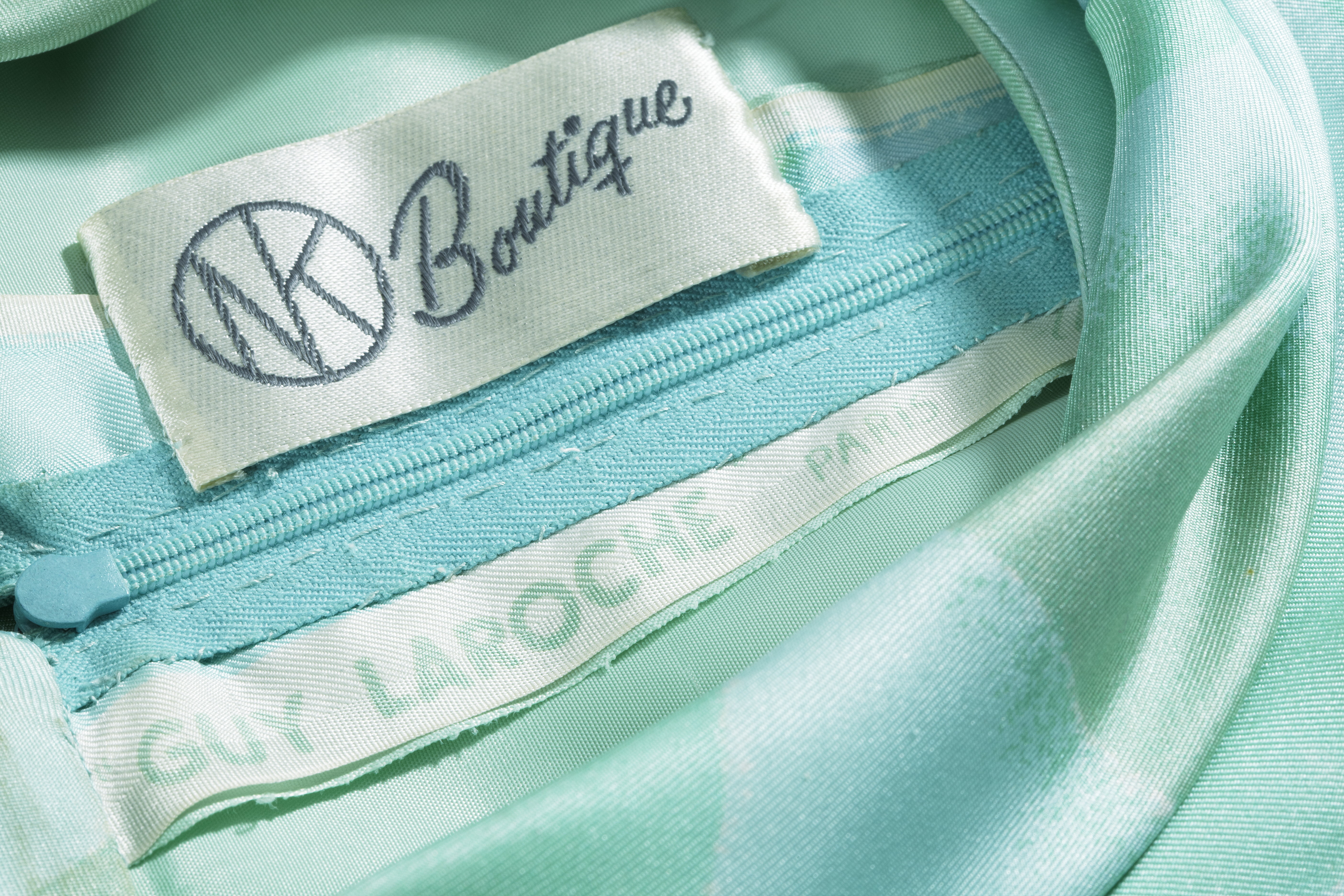 Tyget vävt av Guy Laroche, Paris. Klänningen troligen sydd på NK Boutique. Kort, helskuren klänning med lång ärm av foulardsiden med tryckt mönster. Botten av blekt turkos, däröver breda ljusgröna ränder som bildar stora rutor, däröver stora, oregelbundna S-formade slingor i mörkare grönt. Slingorna med diffusa konturer. Oregelbundna isblå fyrkanter med delvis diffus teckning. Klänningen skuren i fem våder. Hellånga, isydda raka ärmar av en våd med manschett och vändsytt knapphål och ljusblå knapp, d: 14 mm, av plast. Ärmen blusad vid manschetten. Krage av dubbelt tyg, fastsydd bak och i sidorna och framtill löst hängande i snibbar. Vid axelsömmarna hällor med tryckknappar. I vådsömmarna fram dubbla gångveck, l: 405 mm.Gångvecken bildas av infällt stycke, b: 245 mm. 35 mm nedanför ärmhålen ett 275 mm långt figurveck. I ryggen, från axelsömmen två figurveck, l: 80 mm. Mitt bak blixtlås, l: 570, med upptill hyska och hake. Foder av ljusgrönt siden. Handkastade sömmar.