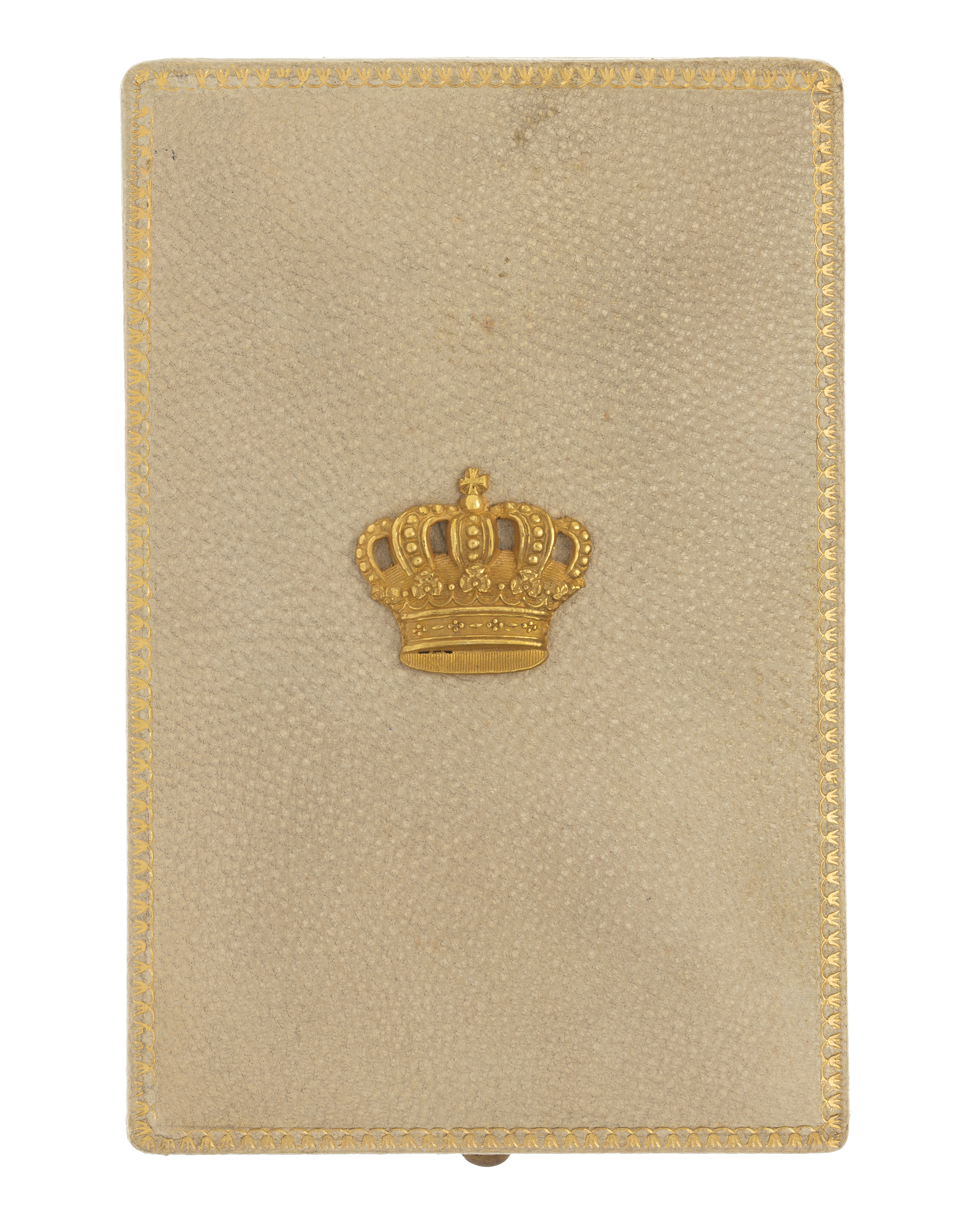 Rektangulärt etui av trä med svagt välvt lock. Utvändigt klätt med beige skinn, på undersidan benvitt, mönsterpressat papper. På lockets översida samt på underdelens överkan tkantbård i guldpressning, mittpå locket fäst en förgylld kunglig krona. Fjäderlås av gulmetall, överklätt gångjärn. Locket invändigt klätt med vitt siden, firmamärke tryckt med guldfärg från hovjuvelerare CF Carlman. I underdelen fast insats klädd på ovansidan med beige sammet, upphöjning med urtag för minnestecknet.