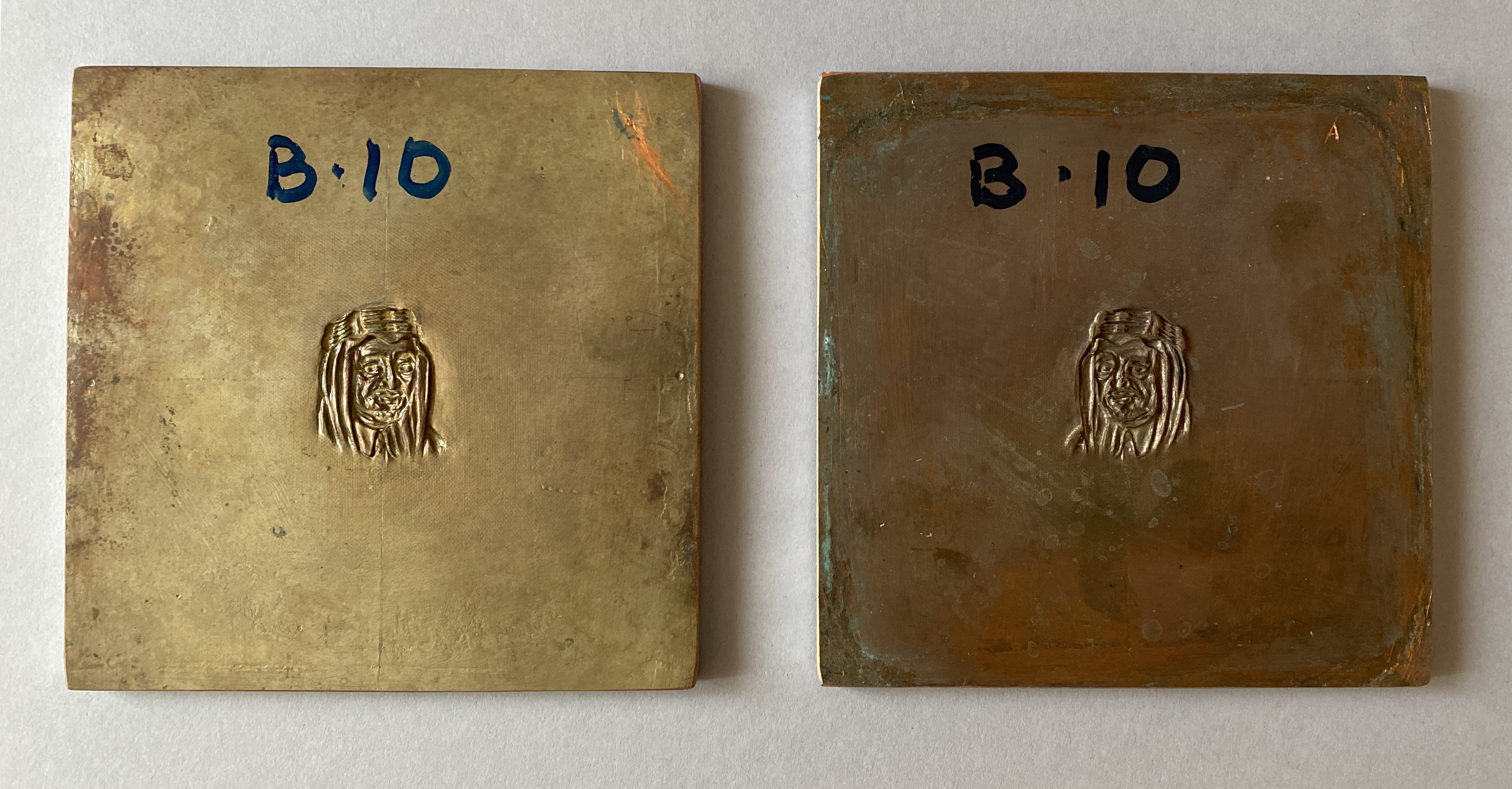 Pressplatta för vattenmärkestillverkning: porträtt av arabisk man (shejk?) med huvudbonad (ink. agal). Text på framsidan av plattorna: B.10 Text på baksidan av plattorna: B.9 (?), fejsal (?), best.nr. 19