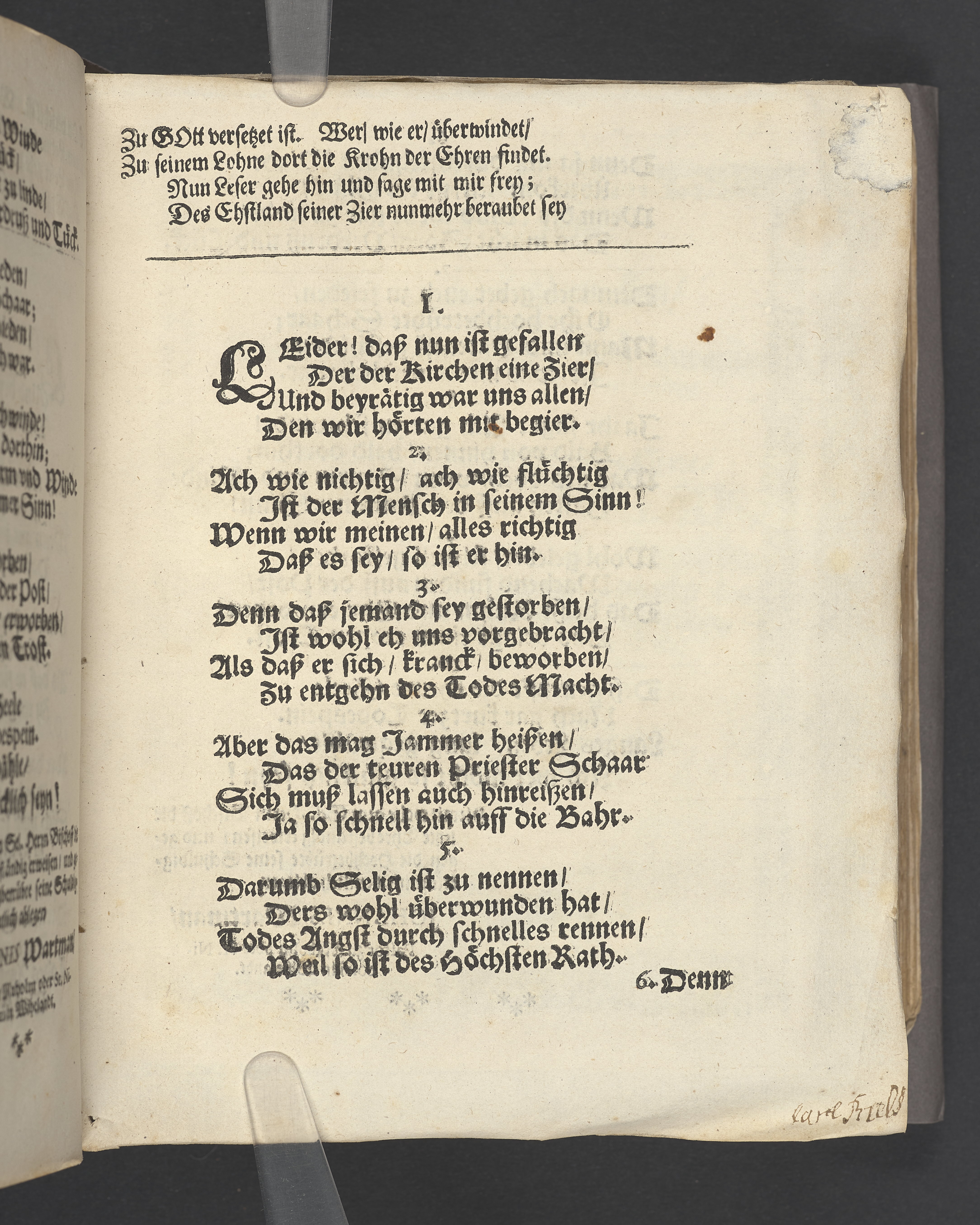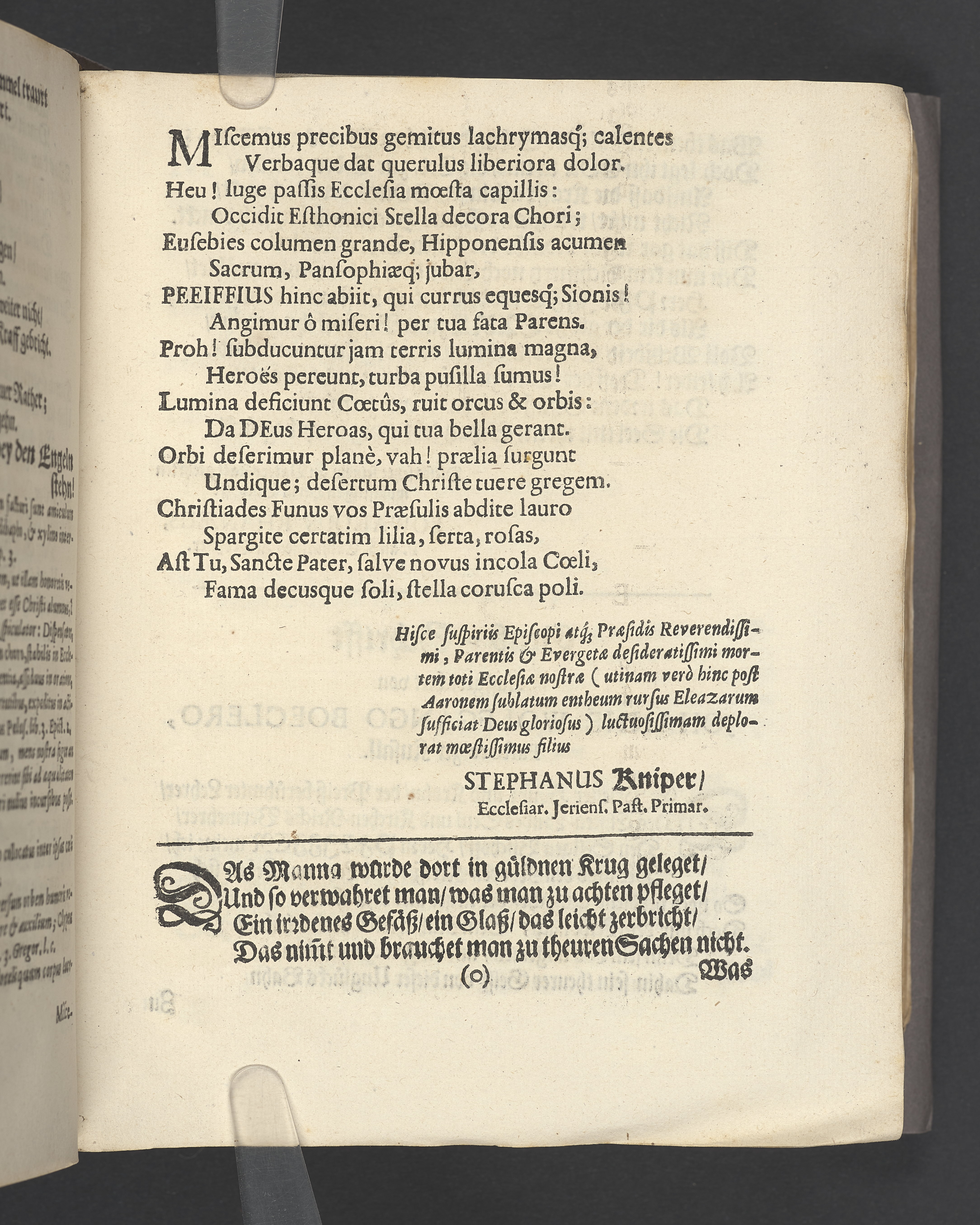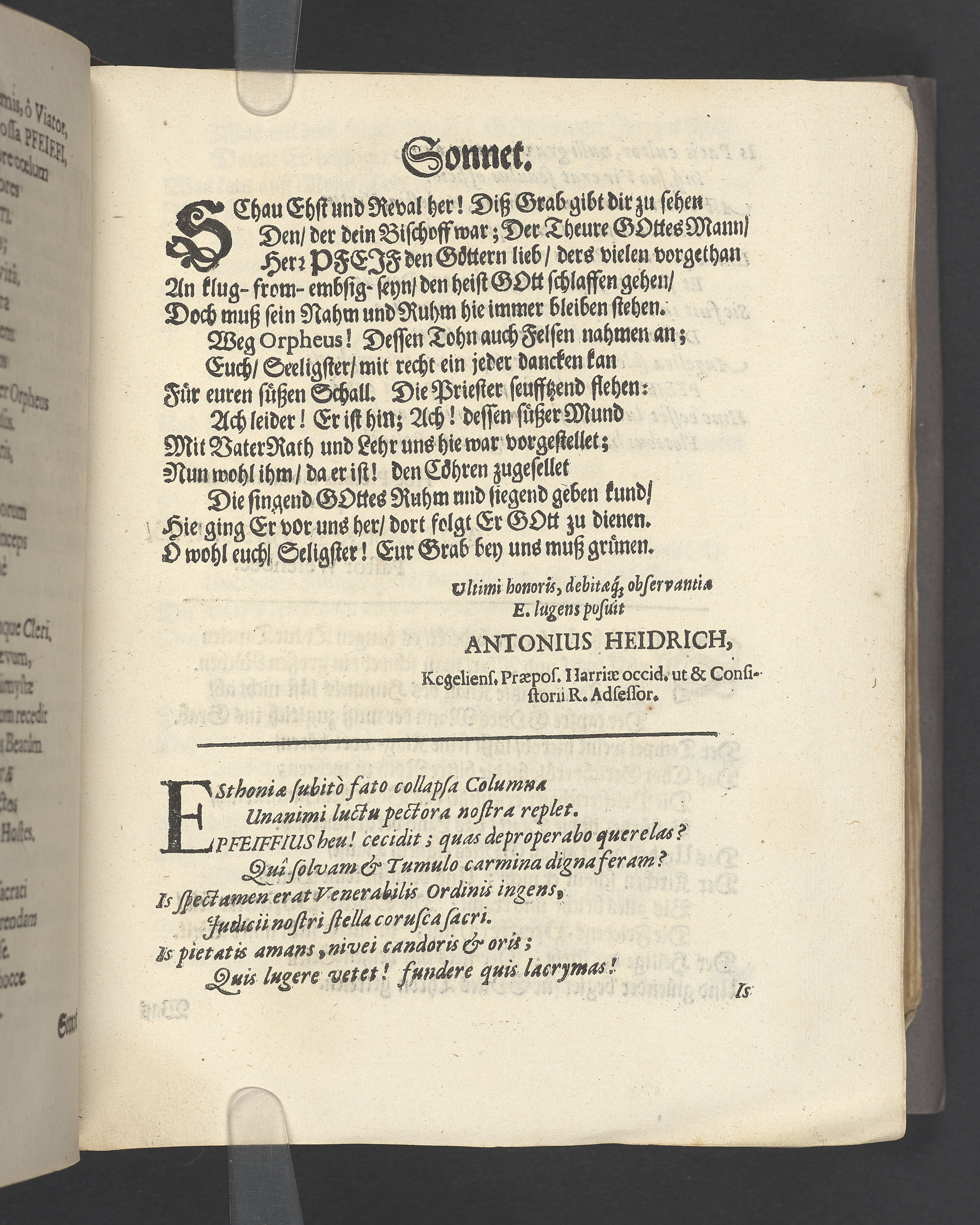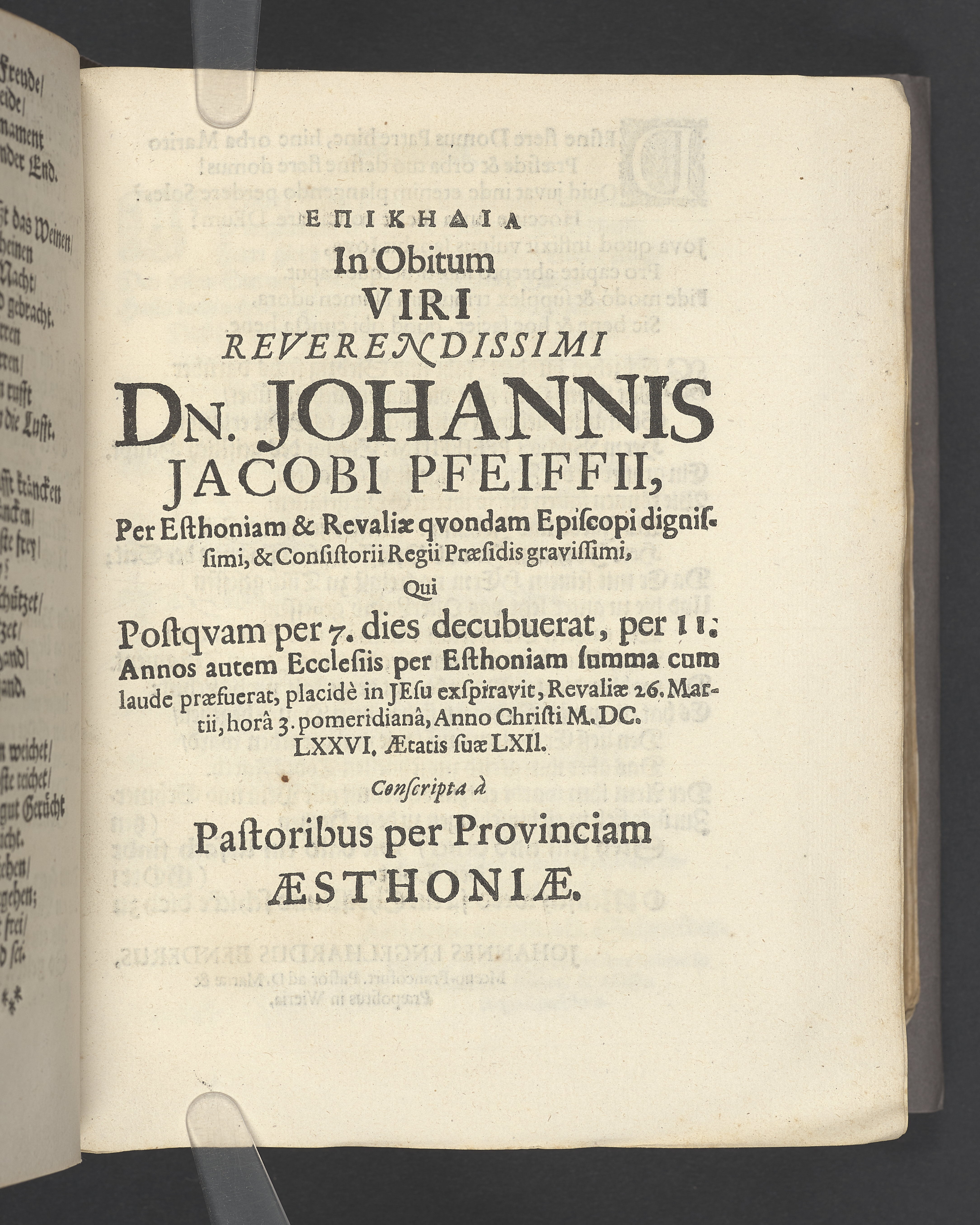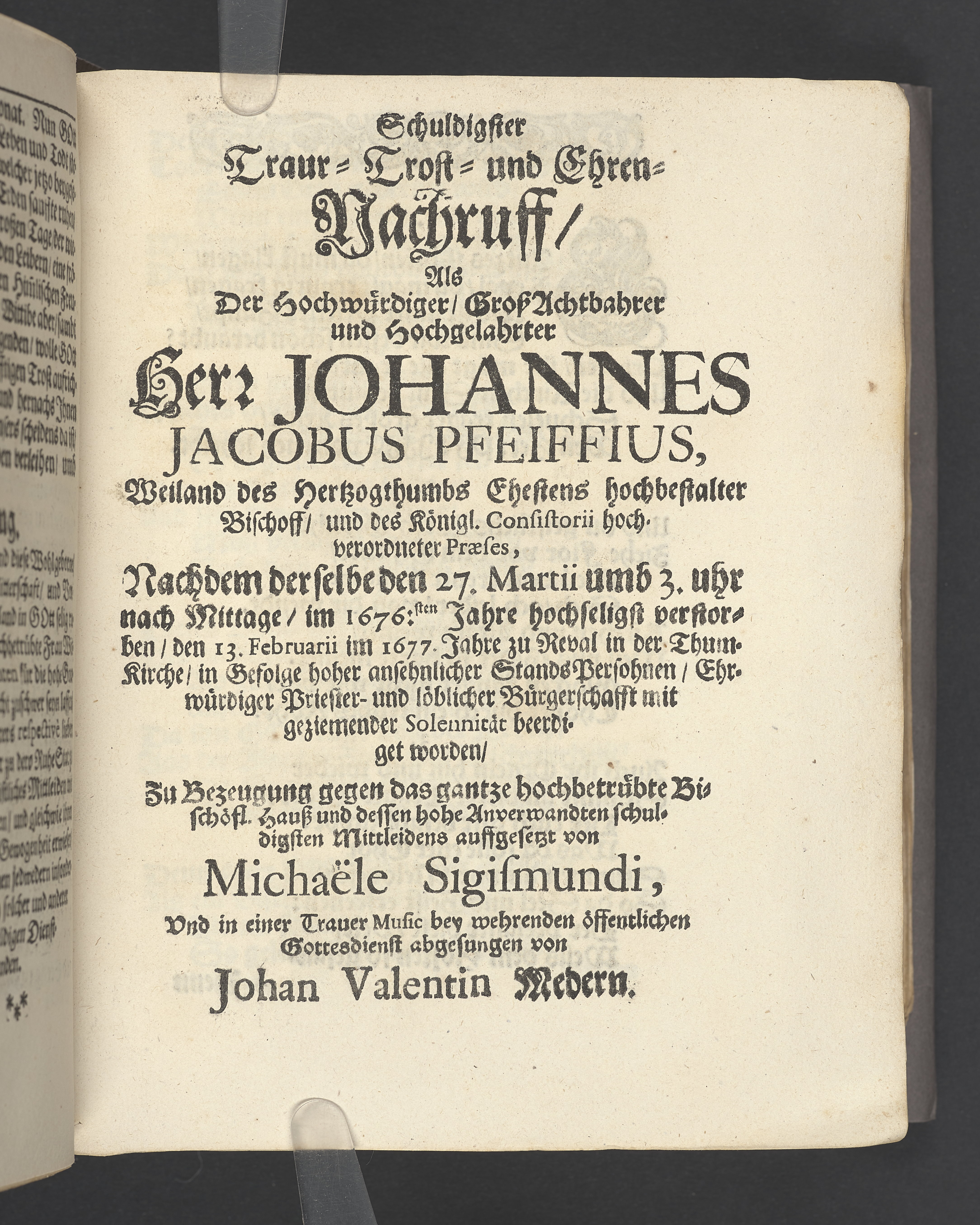 Schuldigster Traur- Trost- und Ehren-Nachruff, als ... Herr Johannes Jacobus Pfeiffius ... Bischoff ... den 13 februarii im 1677. Jahre zu Reval in der Thum-Kirche ... beerdiget worden ... auffgesetzt von Michaële Sigismundi, vnd in einer Trauer Music ... abgesungen von Johan Valentin Medern.