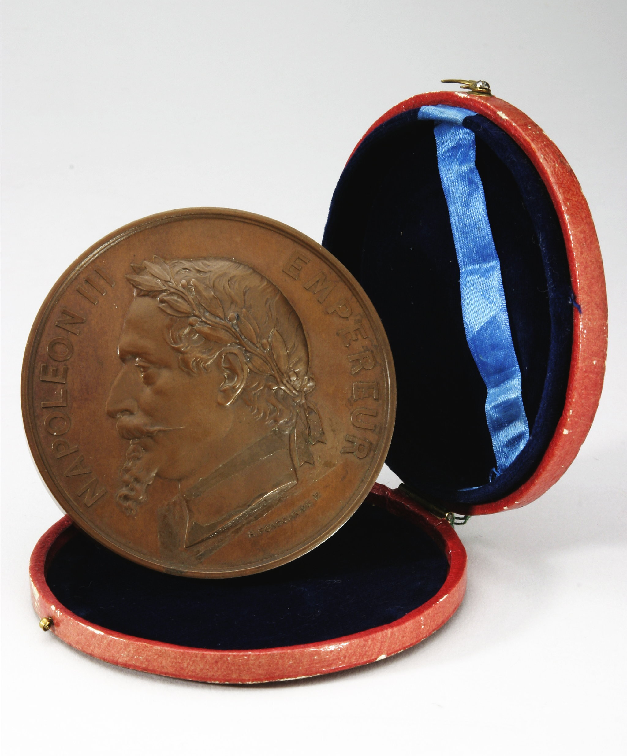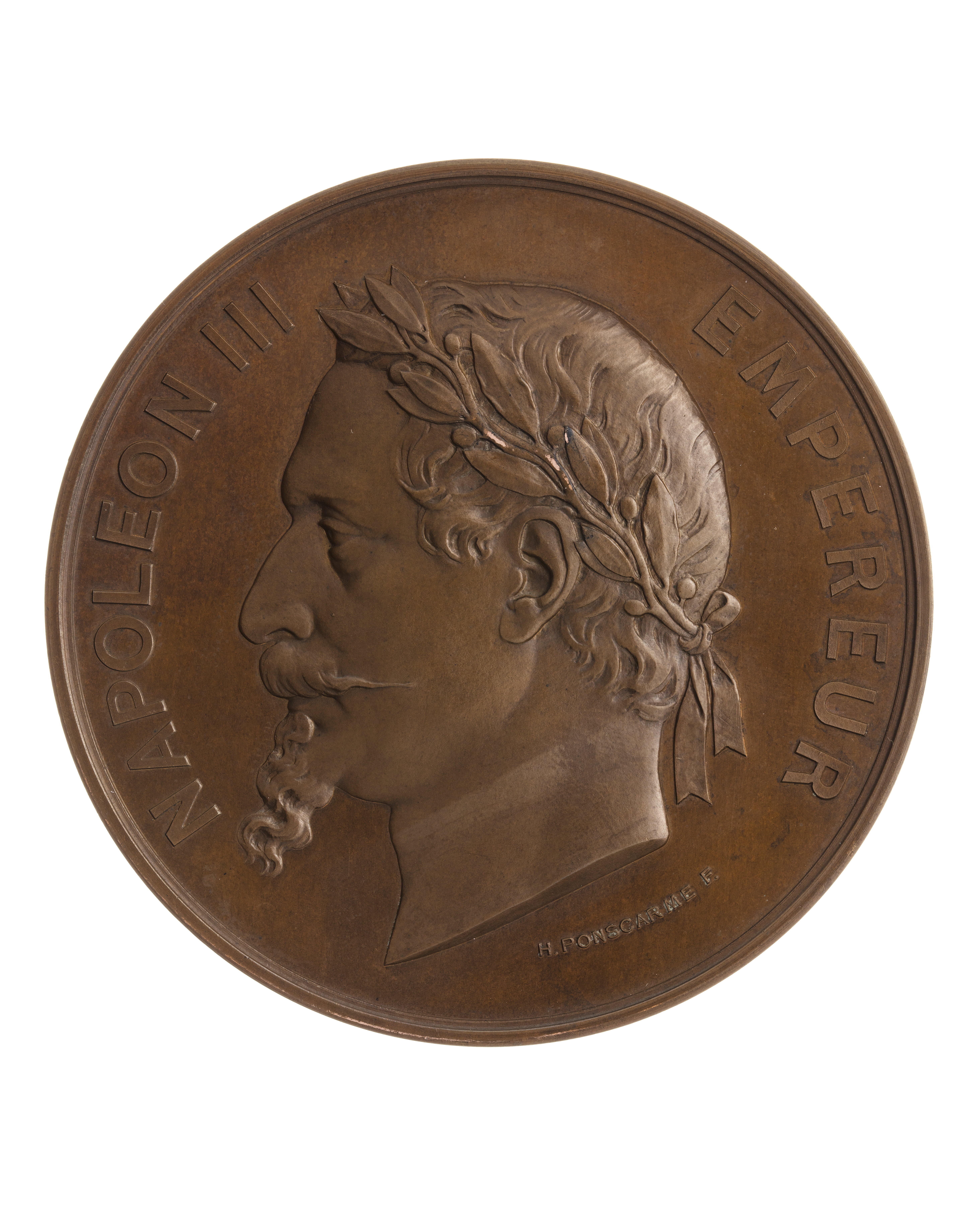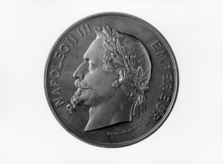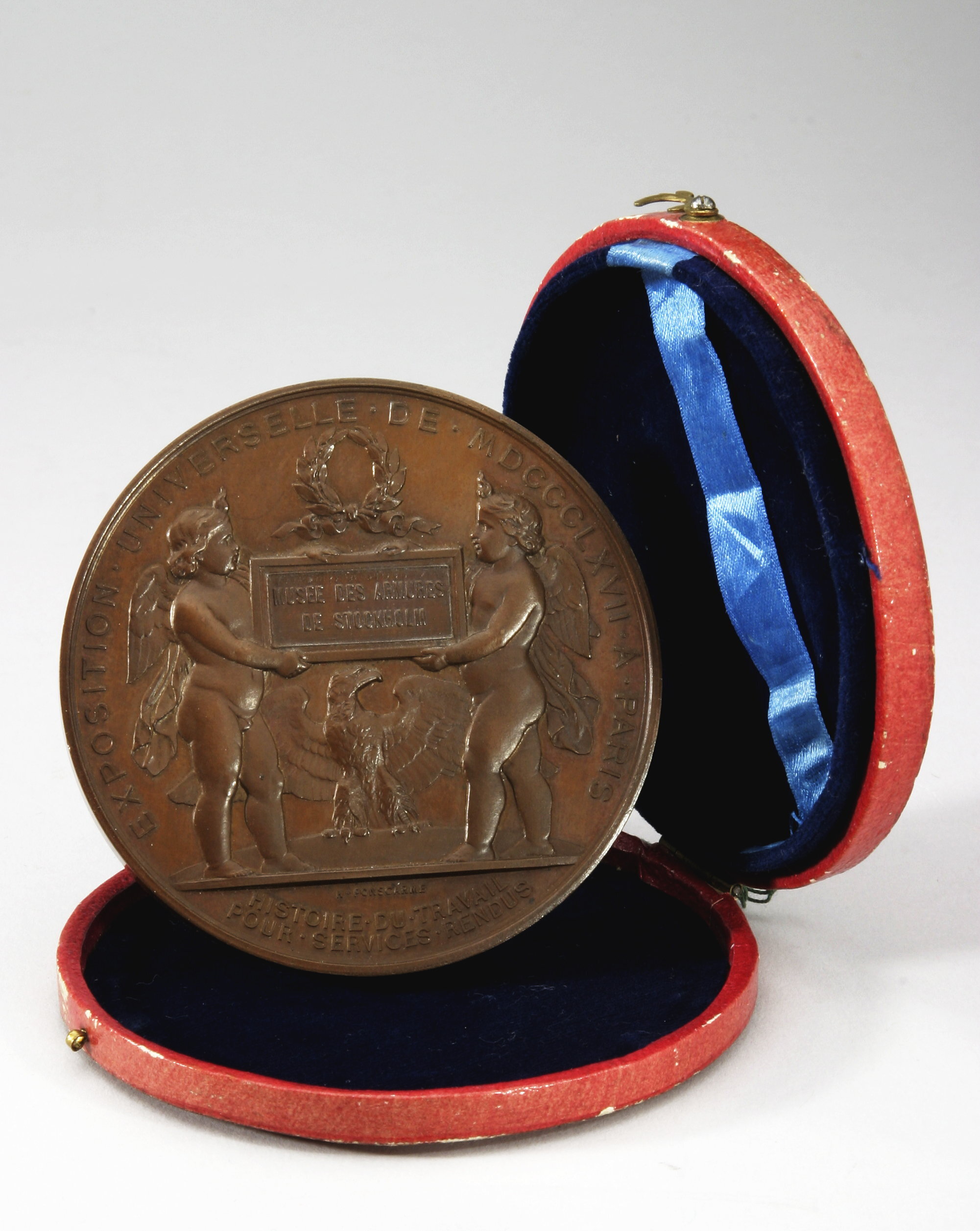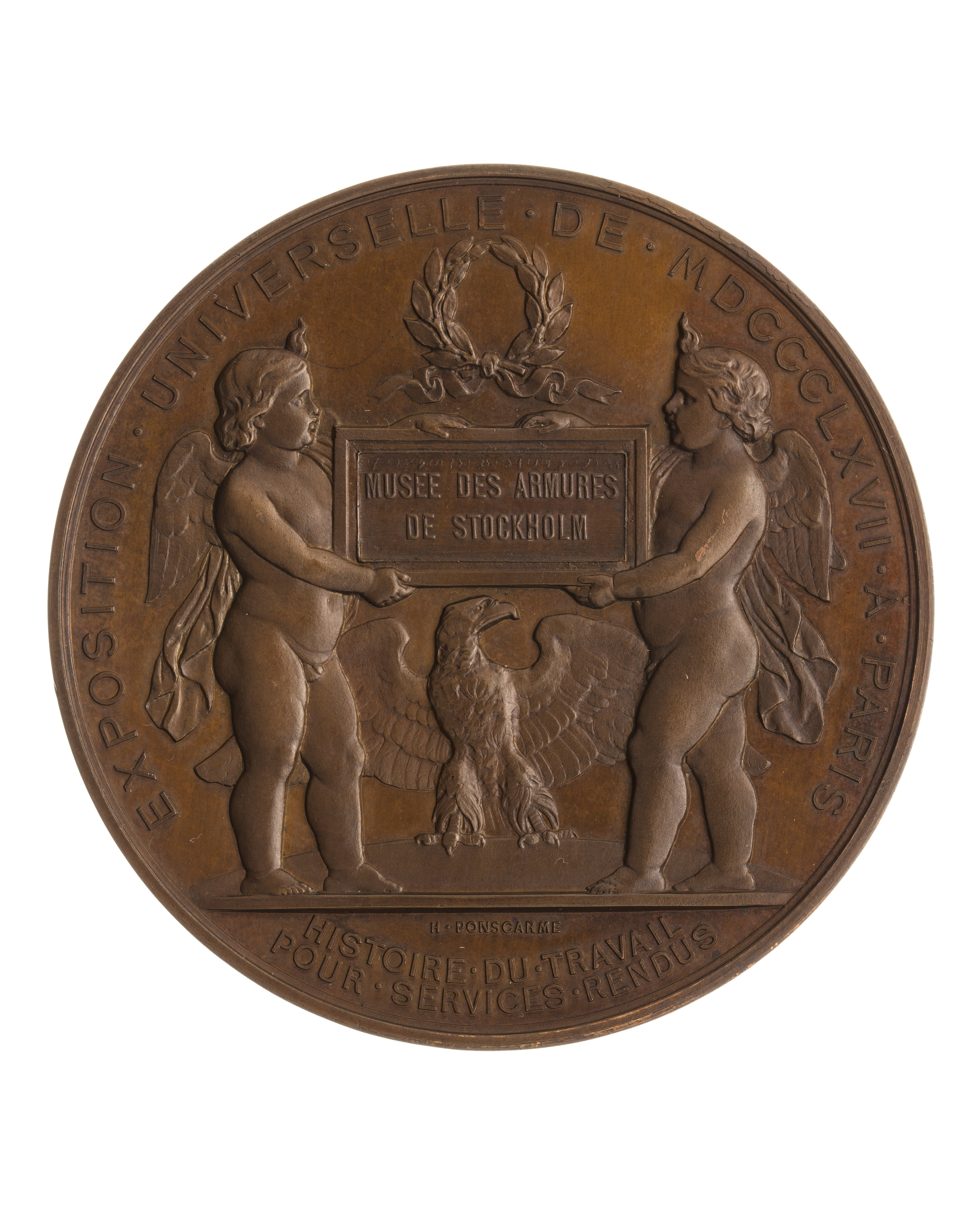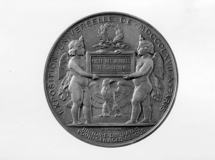 Åtsida: Napoleon III, halsbild, profil v, lagerkrans om huvudet, signatur vid avsnittet: "H.PONSCARME F.", omskrift: "NAPOLEON III EMPEREUR" Frånsida: två putti stående på sockel, hållande tavla med text: "MUSEE DES ARMEURS // DE STOCKHOLM", ovanför tavlan lagerkrans ombunden med fladdrande band, på sockeln mellan dessa putti sitter en fläkt örn. Omskrift: "EXPOSITION.UNIVERSELLE.DE.MDCCCLXVII.A.PARIS". I avsnittet nedanför sockeln signatur: "H.PONSCARME", samt text: "HISTOIRE.DU.TRAVAIL // POUR.SERVICES.RENDUS". På kanten stämplat: "CUIVRE" och otydlig stämpel.