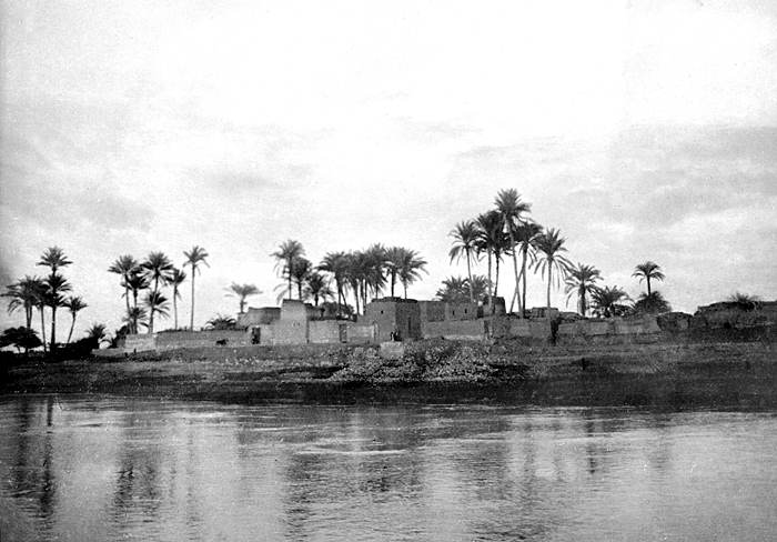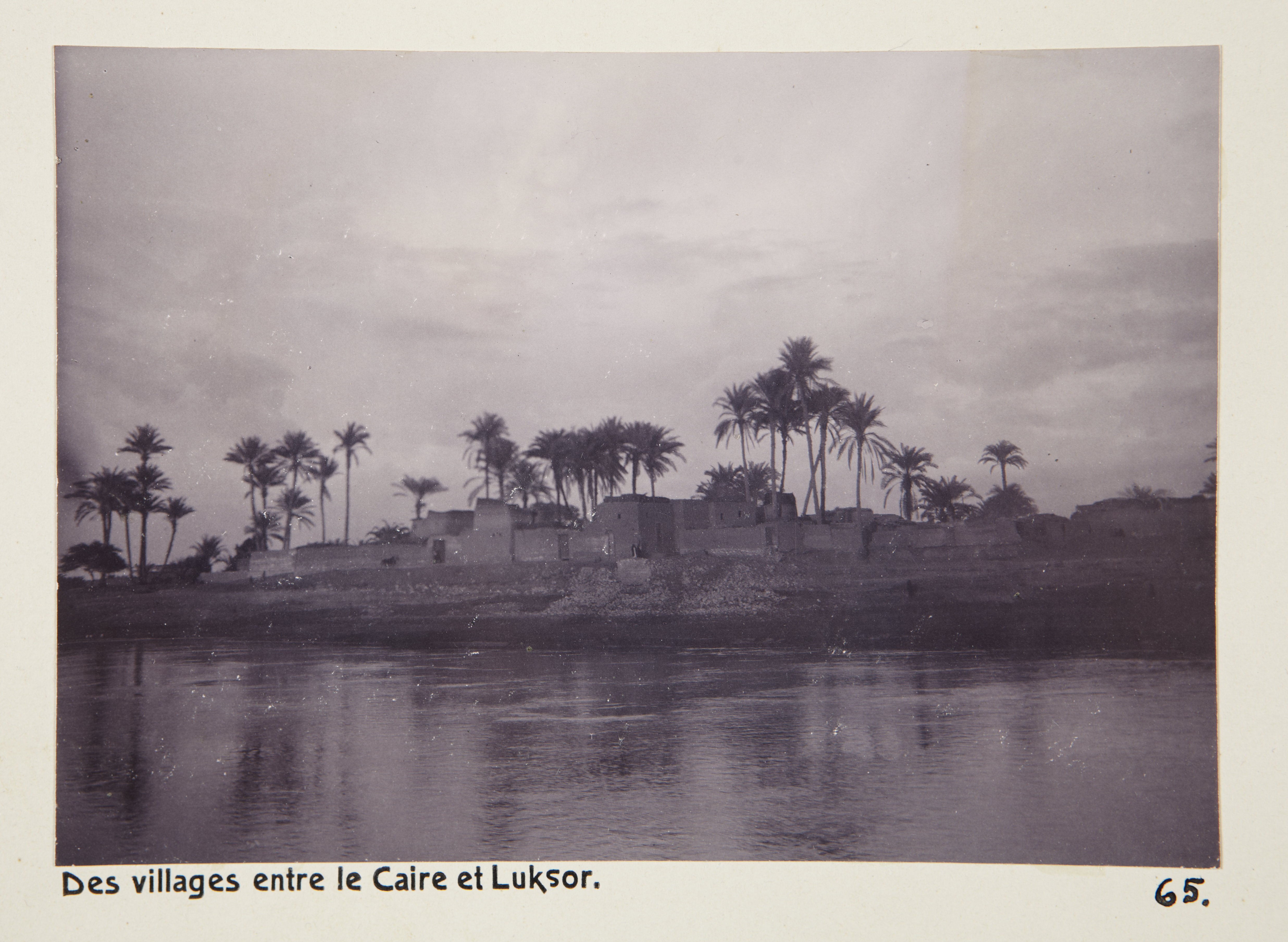 Byar mellan Kairo och Luxor, Egypten. Text på originalet: Des villages entre le Caire et Luksor. Fotografierna LXVI:M.01.- 201. kommer från resan till Egypten och Sudan som Wilhelmina och Walther von Hallwyl gjorde vintern 1900-1901. De lämnade Sverige den 5 november 1900 och fortsatte från Egypten till Palestina den 28 mars 1901. Med på resan var döttrarna Ellen med maken Henric de Maré och Irma med maken Wilhelm von Geijer. Wilhelminas sällskapsdam, fröken Ida Uhse reste också med. Under en del av resan anslöt sig ledamoten av Internationella domstolen i Kairo, assessorn Otto Conrad Waldemar Cedercrantz med makan Anna Elisabeth. Vid resan uppför Nilen hade Walther von Hallwyl hyrt ångfartyget Columbia med besättning. Båtresan startade i Kairo 27 december 1900, gick ända till Wadi Halfa varifrån man reste vidare med tåg till Khartum och tillbaka till Wadi Halfa. Båten vände åter i riktning mot Kairo, men det verkar som att sällskapet tog tåg sista biten, från Luxor. Henric och Ellen de Maré samt fru Cedercrantz lämnade båten redan då de passerade Luxor första gången. Resten av sällskapet återvände till Kairo den 1 mars. Fotografierna LXVI:M.01.-120. togs av resenärerna själva, de största av Ellen de Maré, de mellersta av Wilhelmina von Hallwyl och de minsta av Wilhelm von Geijer. Resten köptes av professionella fotografer i Kairo, de flesta från Studio Photogr. Artistique G. Lekegian & Cie. Alla uppgifter kommer från Ida Uhses reseanteckningar.