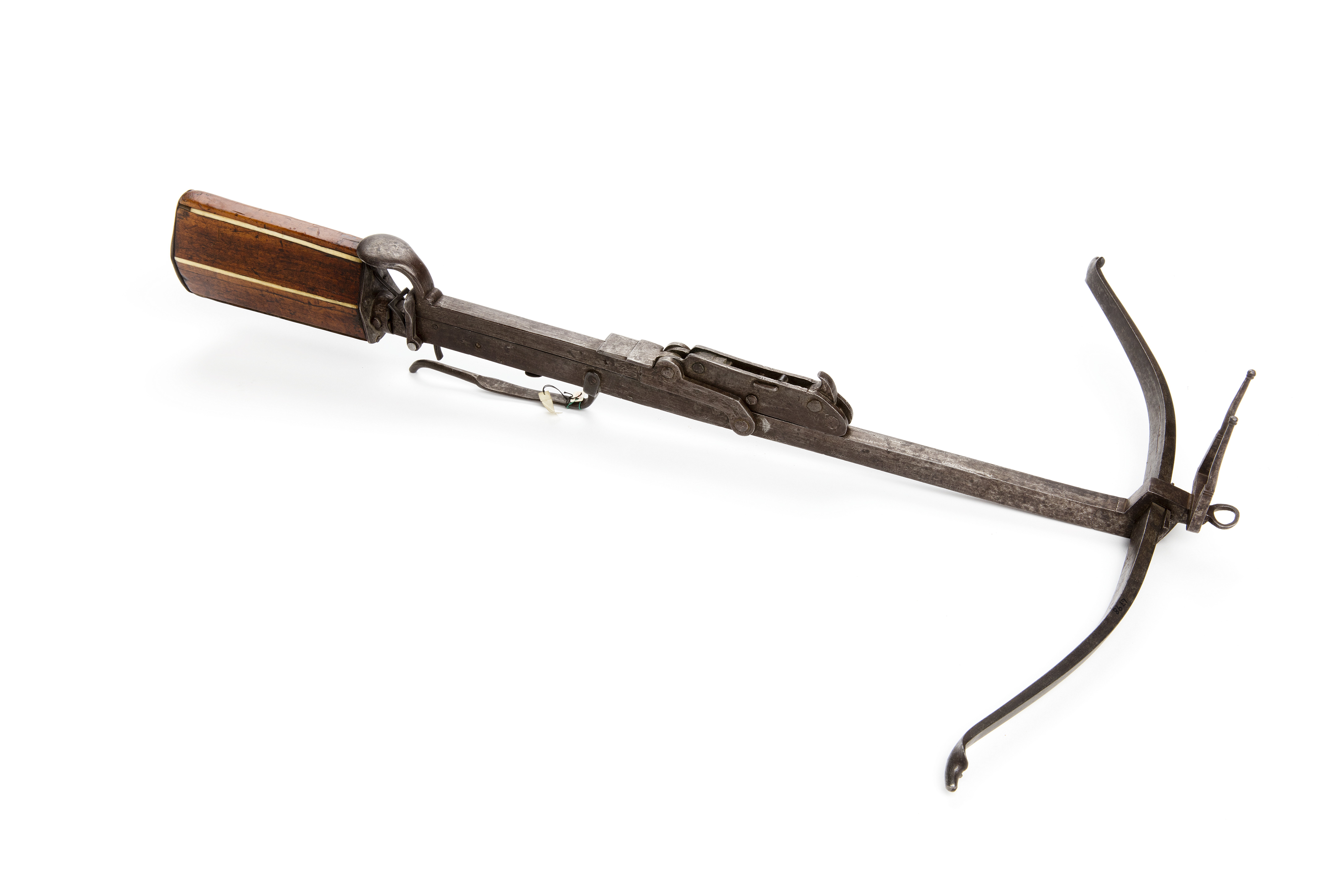 Båge av stål, fäst i hål i stocken med stålkil. Lås med låshus av stål, friliggande på stockens ovansida, med snälltryck som spännes när man trycker på en knapp på stockens undersida bakom varbygeln. Nöt med stränghållare av stål. Vid låshuset och stocken är en spänninrättning i form av en hävarm av stål fäst. Stock av stål med kolv av björk. Kolv av tysk typ med bakplåt av koppar och inlagd med smala lister av ben. På stålstocken högt klaffsikte och i framänden tvåarmad stålgaffel för korn. Gaffelns ändar avslutade med små kulor. Öppen varbygel av stål av böjd rund, delvis tillplattad ten. I stockens framända rund bygel av stål.
