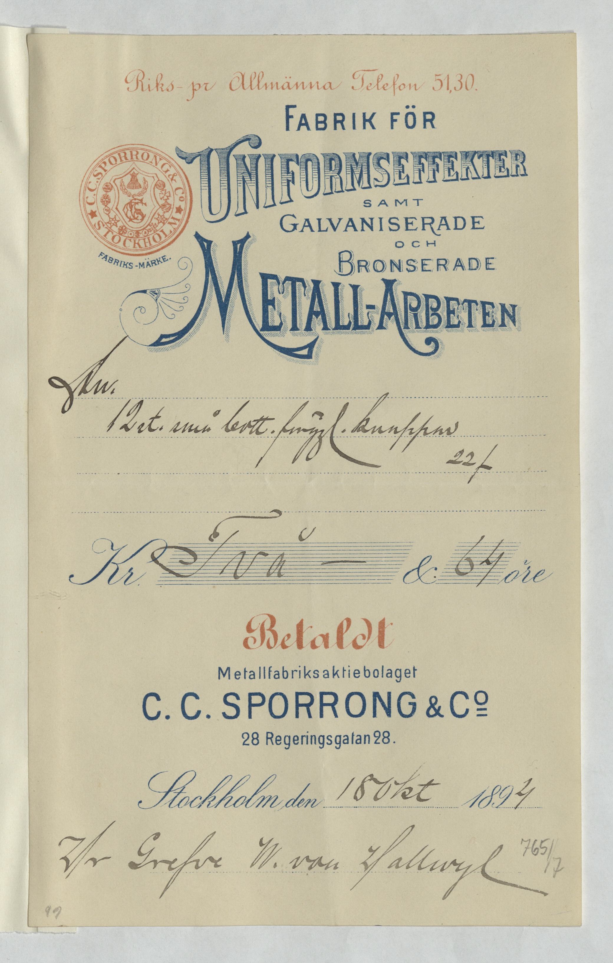 Kvitto från C. C. Sporrong & Co. Stockholm, 1894.