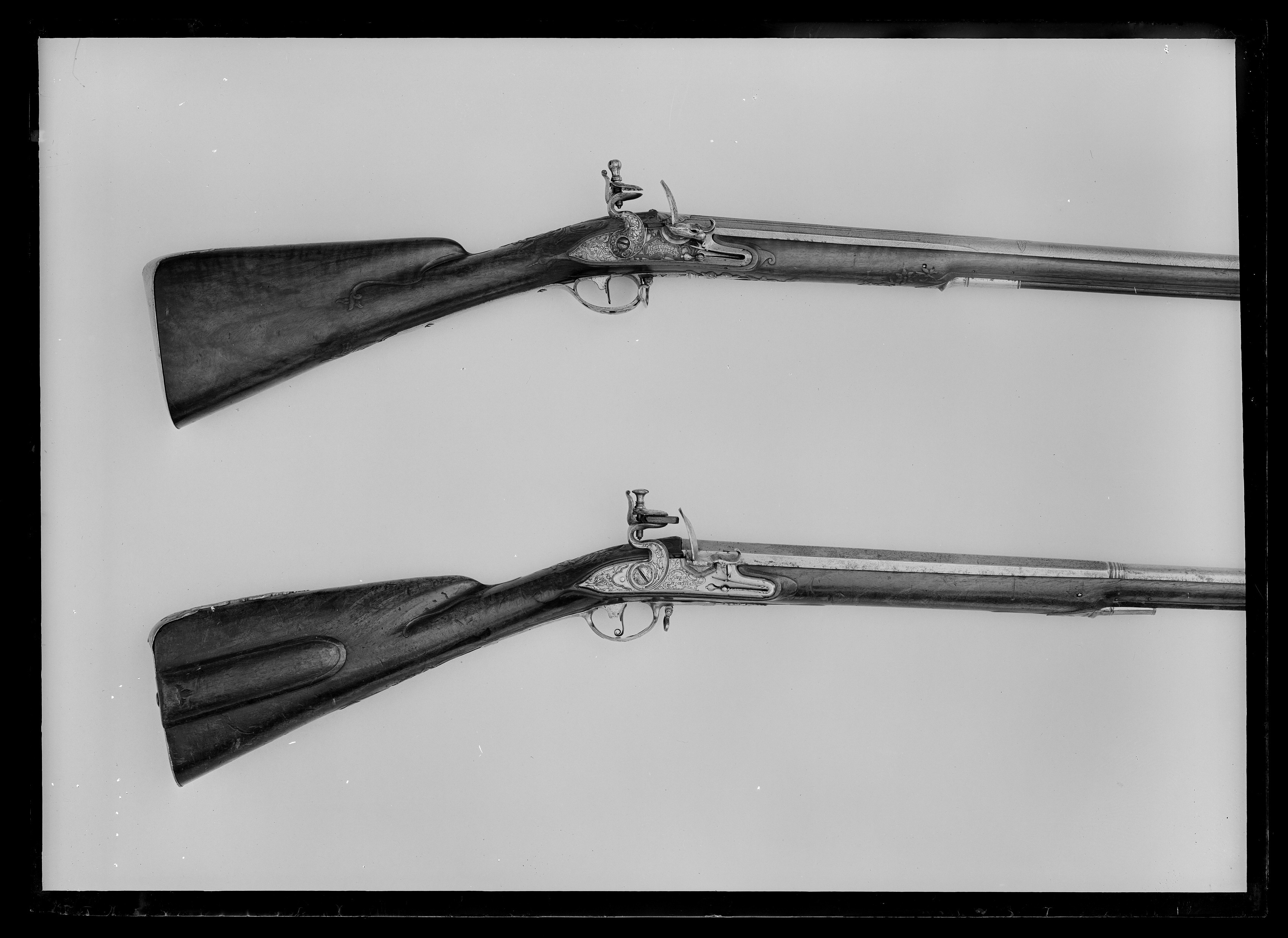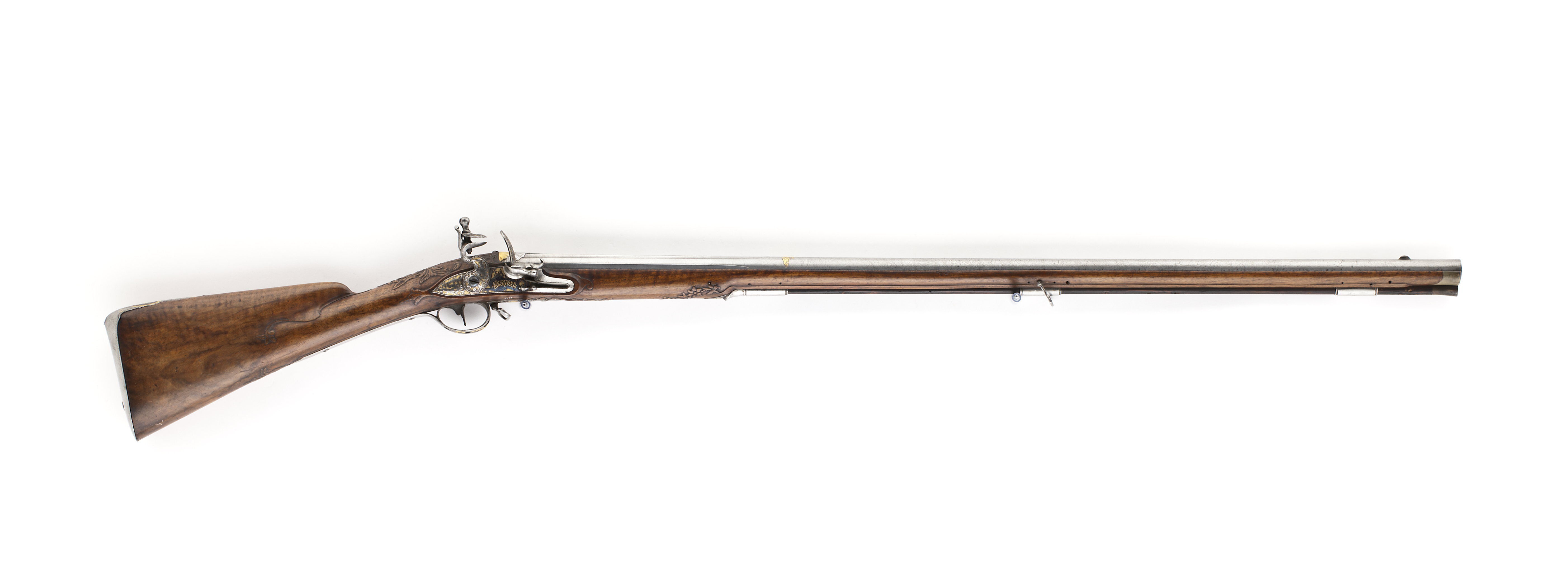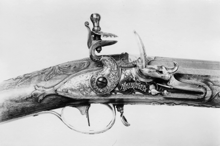 Flintlåsbössa, Johan Franz Meidinger, Stockholm ca 1750, den graverade dekoren möjligen av Johan Lorentz Weiss, Stockholm (+1754)