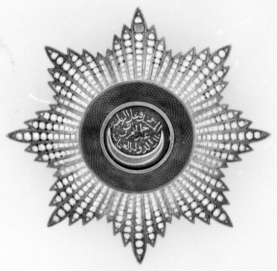 Åttauddig, flinkerad strålstjärna av silver, 56 bladformiga strålar med repstavskanter, på övrespetsen en turkisk stämpel. Välvd medaljong täckt med röd emalj, turkisk text av silver, nertill en förgylld(?), åsad halvmåne. Runtom en välvd ring täckt med grön, genomsynlig emalj. På medaljongens frånsida firmamärke i relief i form av halvmåne och skrifttecken, upptill femuddig stjärna, ovanför märket en stämpel, på en udd en "åldermansranka". Vertikalt placerad säkerhetsnål,två hakar.