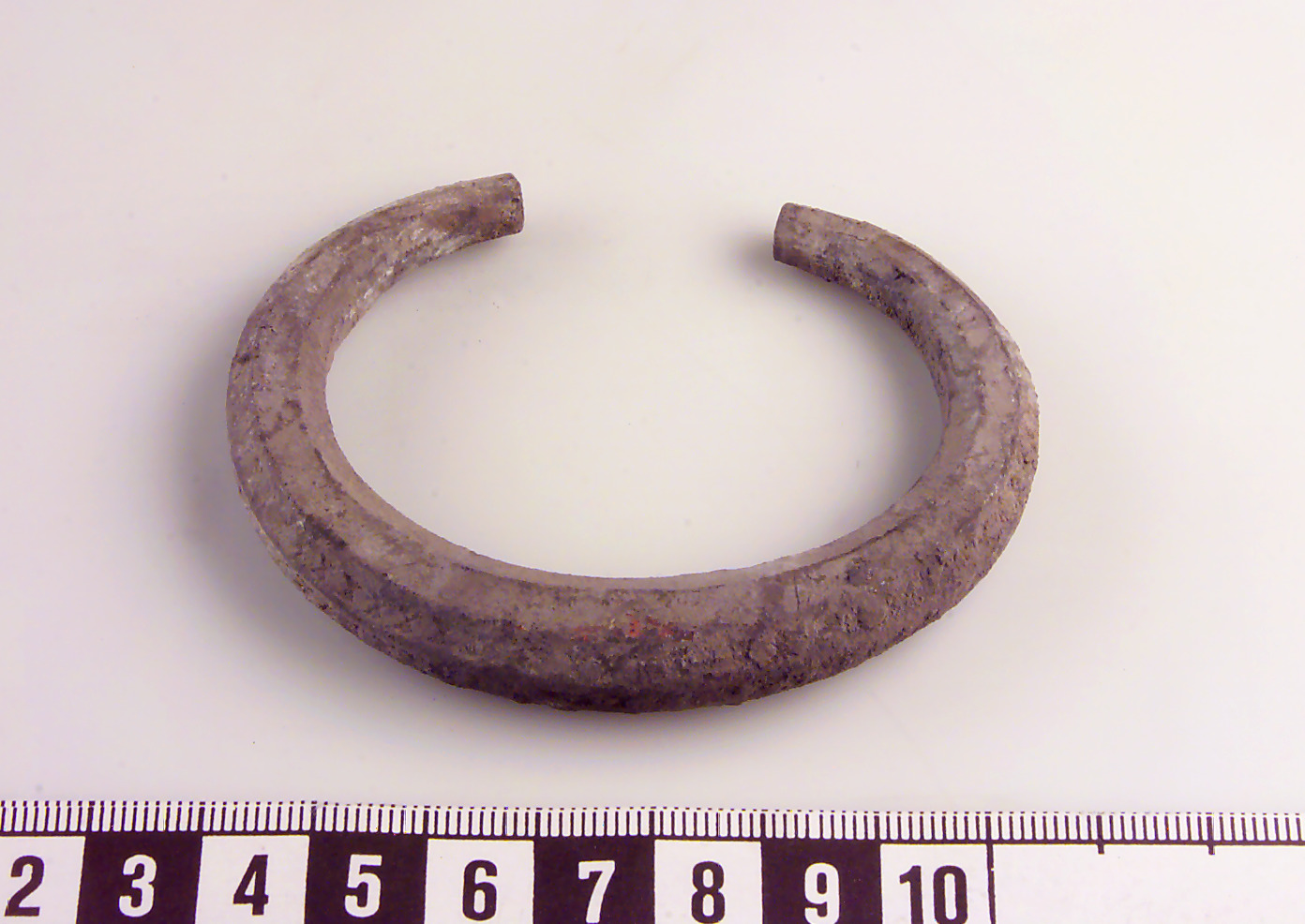 Av åttkantig ten med avsmalnande ändar. Något skadat ytskikt. Stämpelornerad med motställda trianglar i tre rader.