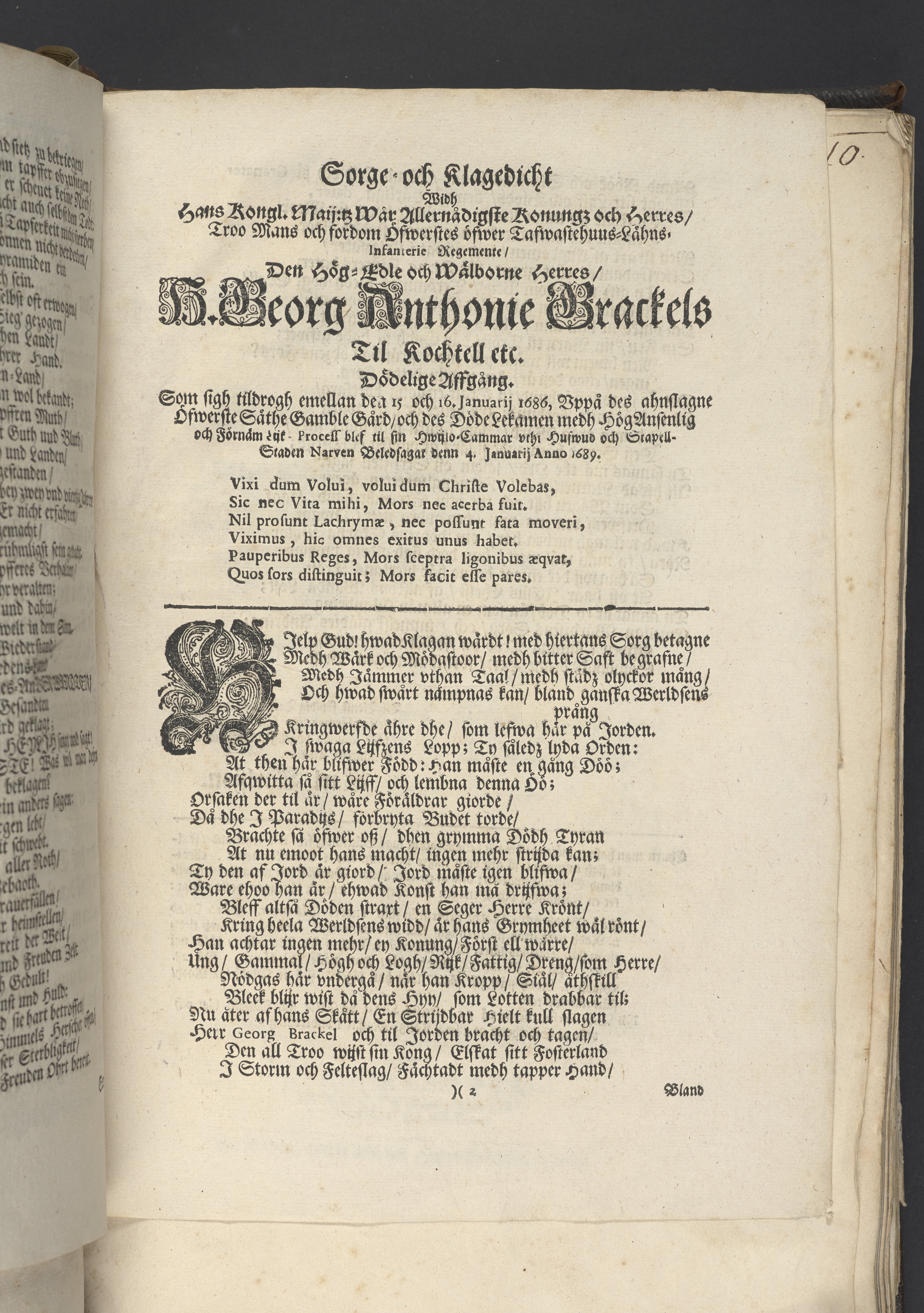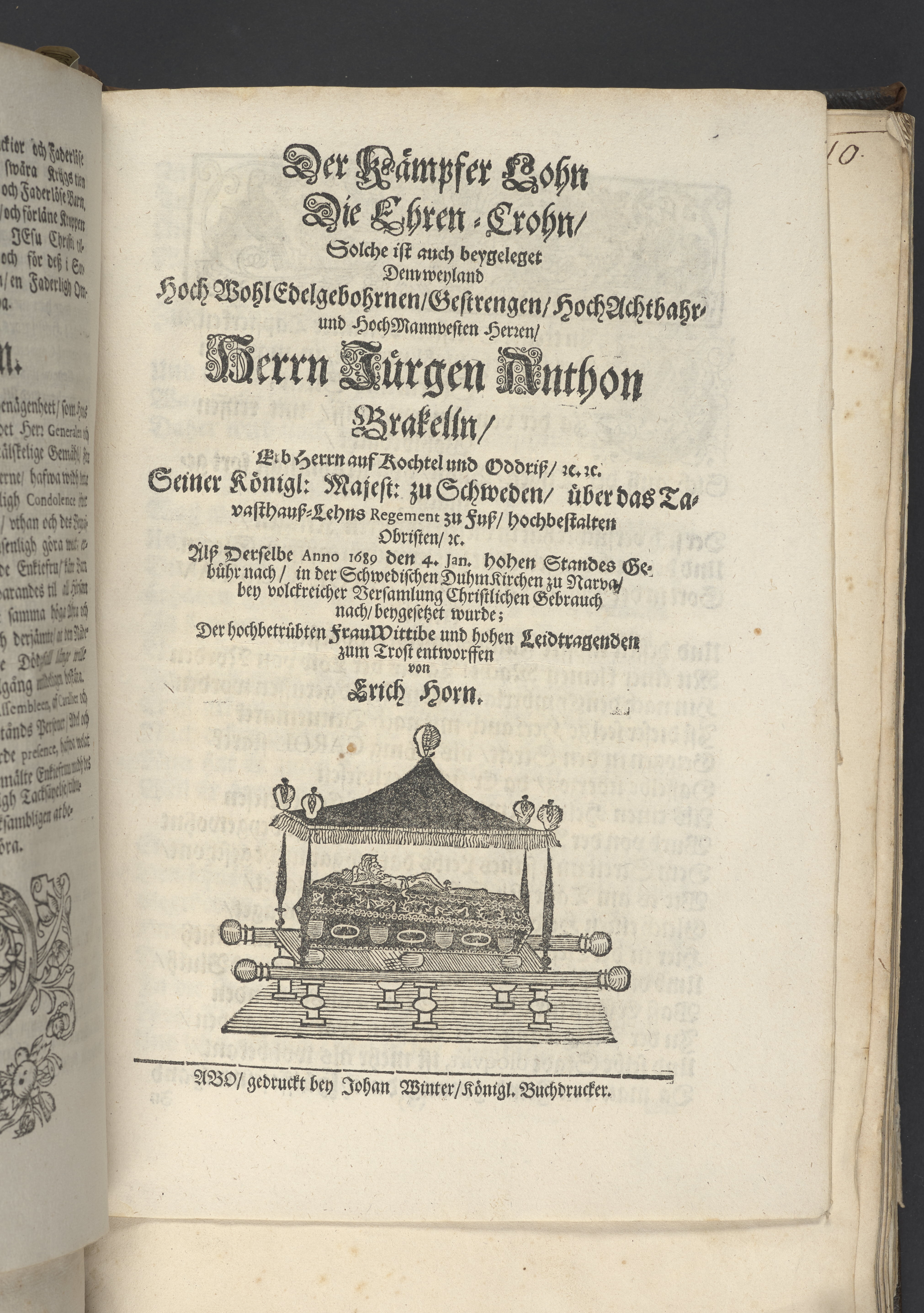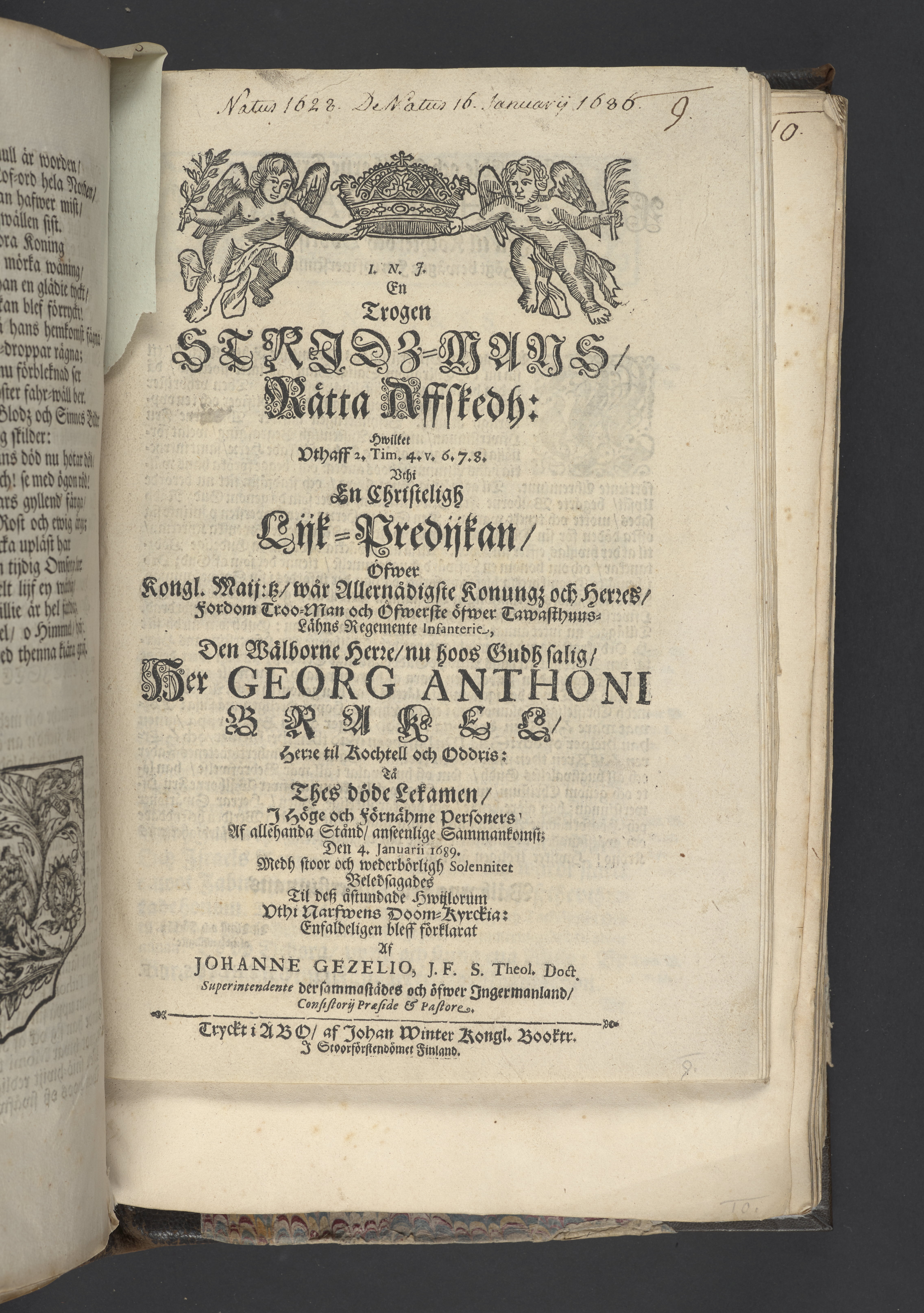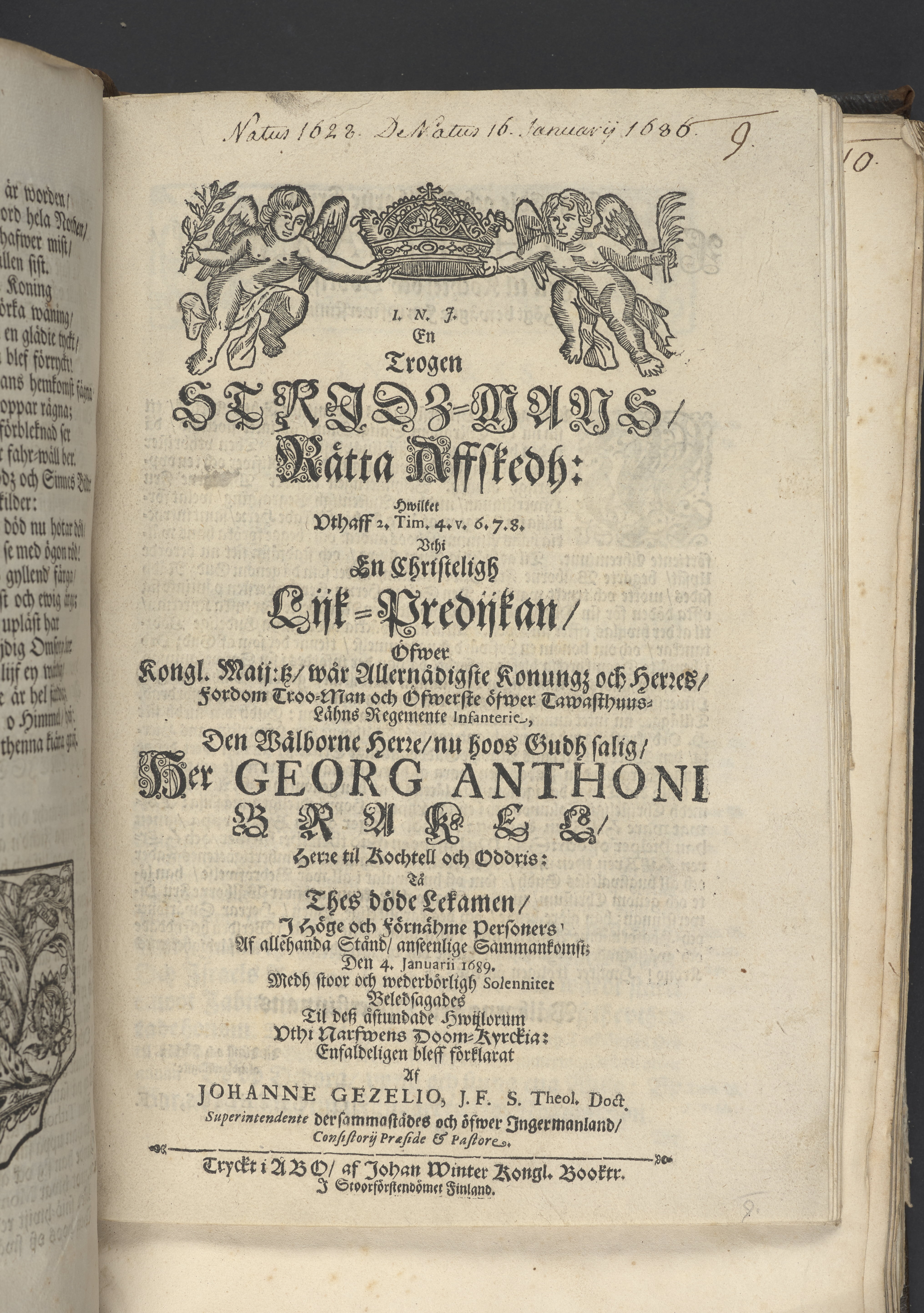 En trogen strids-mans, rätta affstedh ... Vthi en christeligh Lijk-predijkan öfwer kongl. maij:tz ... öfwerste öfwer Tawasthuus-lähns regemente infanterie ... Her Georg Anthoni Brakel, herre til Rochtell och Oddris ... den 4. januarii 1689 ... vthi Narfwens doom-kyrckia ... af Johanne Gezelio ... Tryckt i Åbo, af Johan Winter.