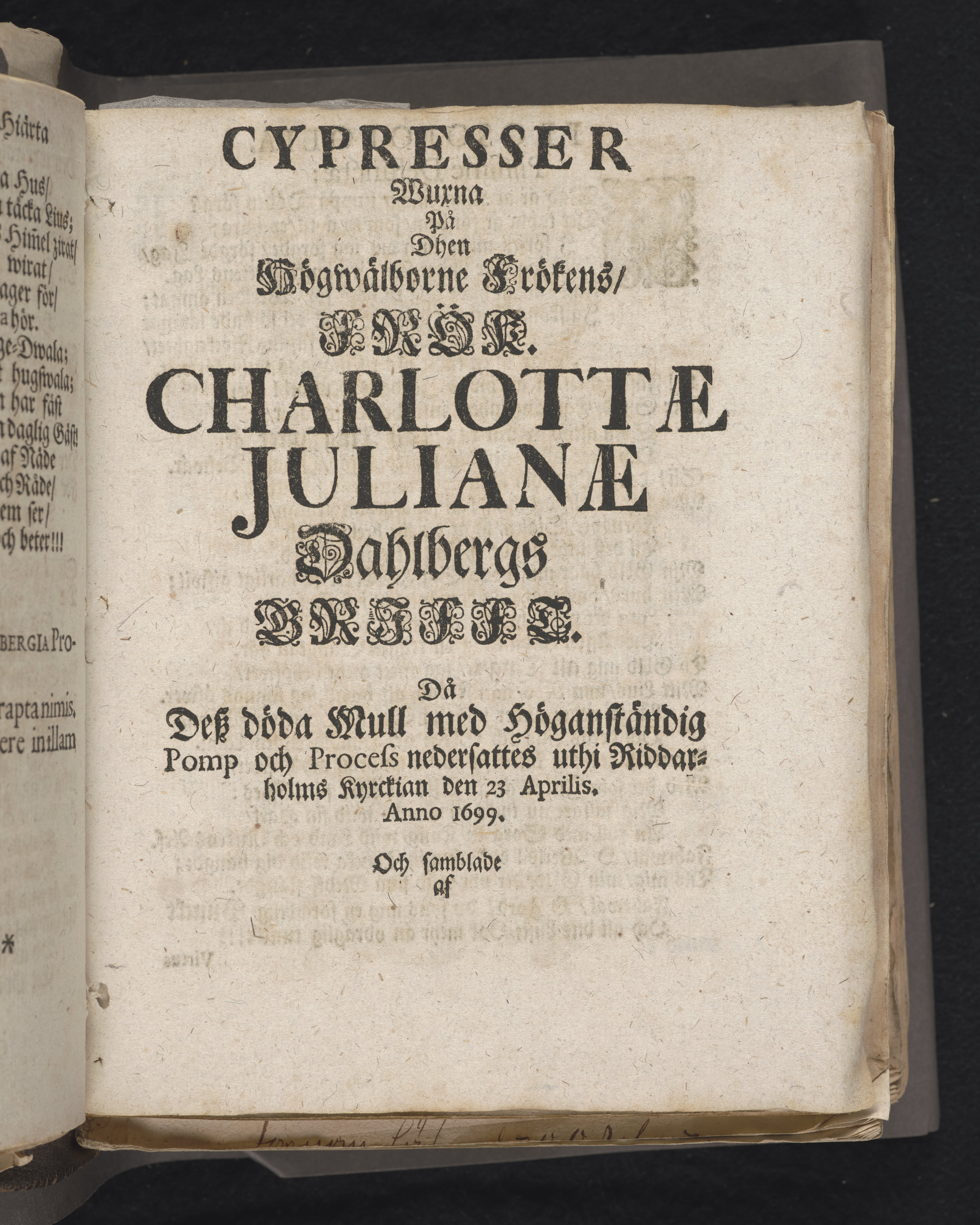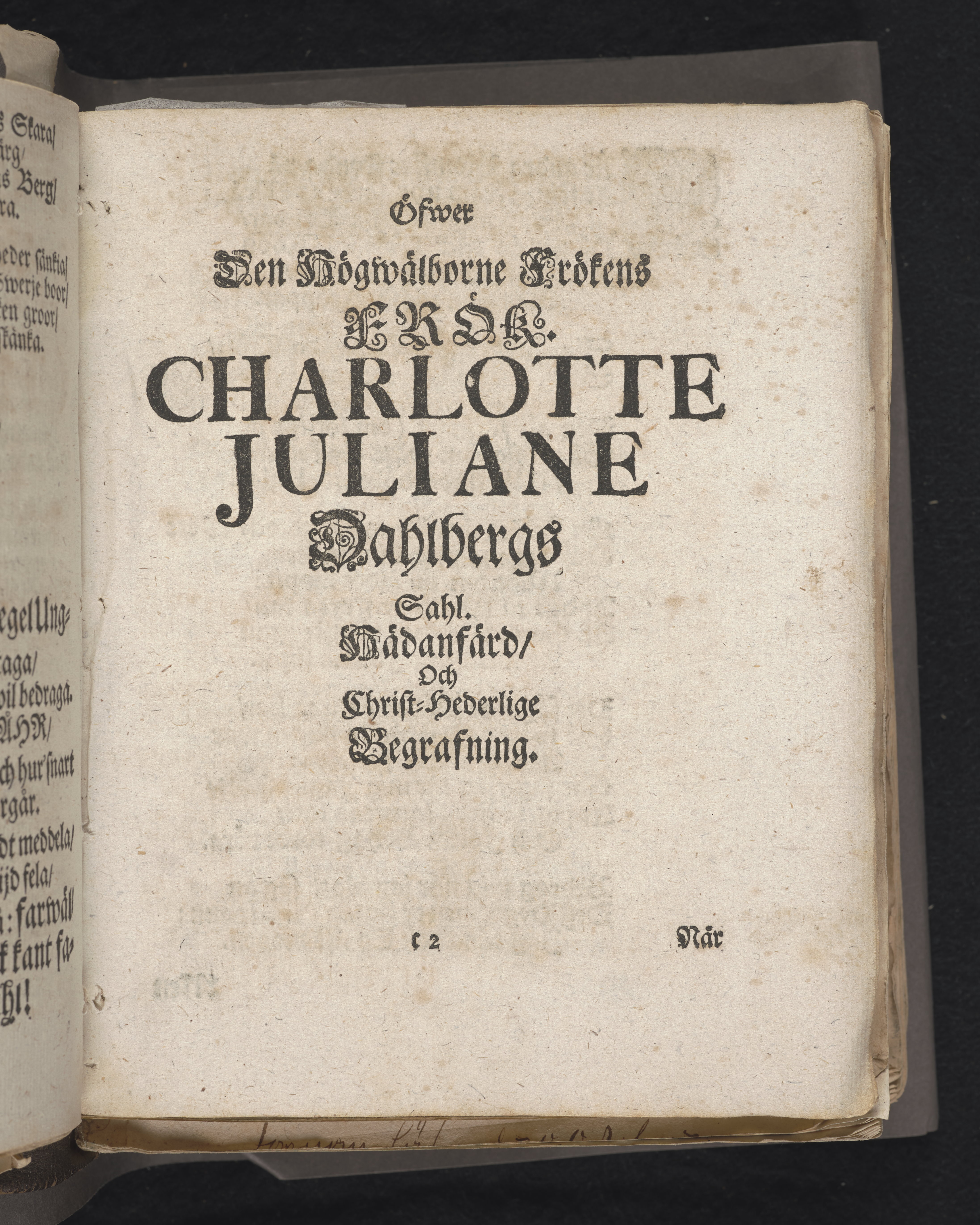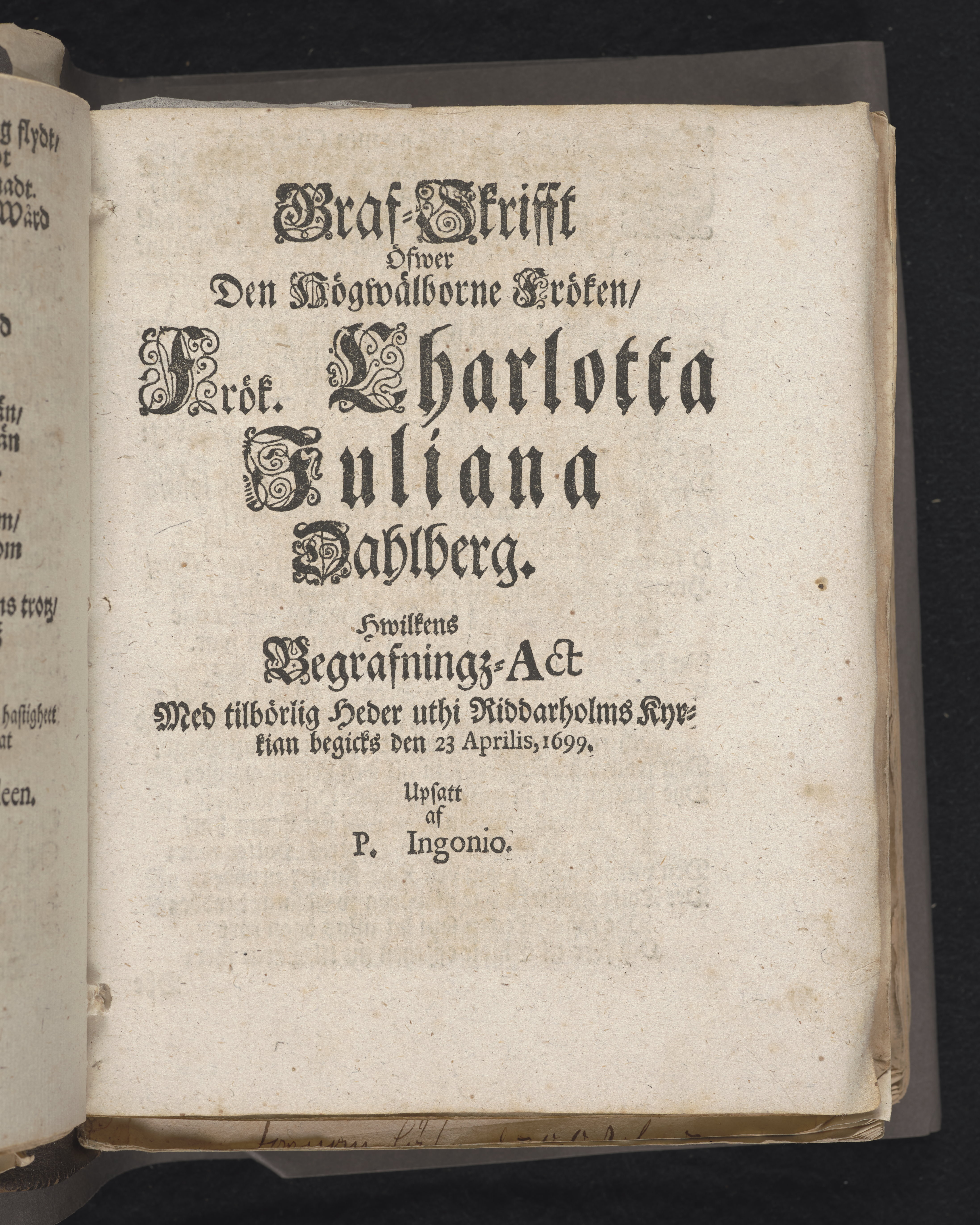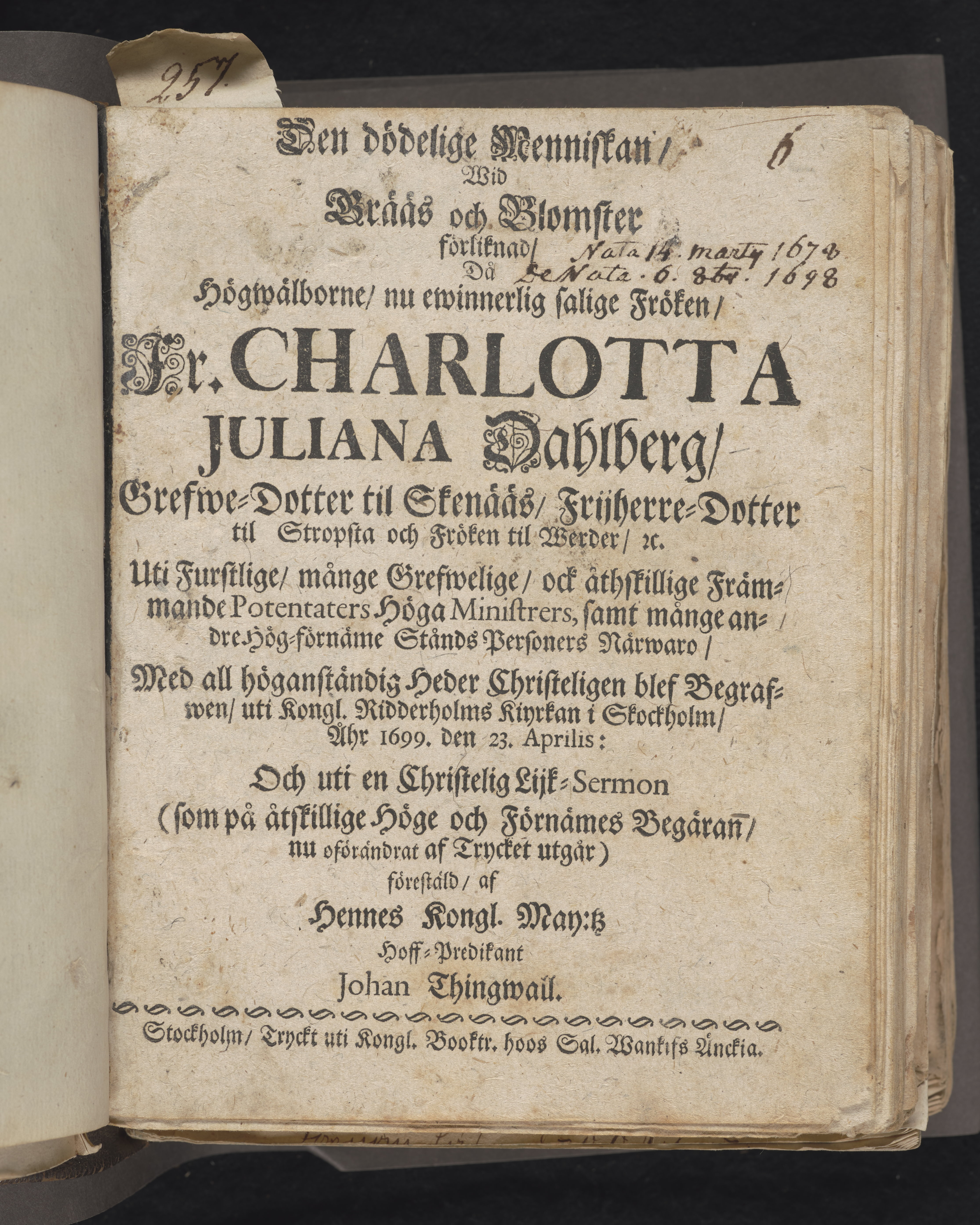 Den dödelige menniskan wid grääs och blomster förliknad, då högwälborne, nu ewinnerlig salige fröken, Fr. Charlotta Juliana Dahlberg, grefwe-dotter til Skenääs ... blef begrafwen, uti kongl. Ridderholms kiyrkan i Stockholm, åhr 1699. den 23. aprilis: och uti en christelig lijk-sermon ... förestäld, af ... Johan Thingwall. Stockholm, tryckt uti kongl. booktr. hoos sal. Wankifs änckia.
