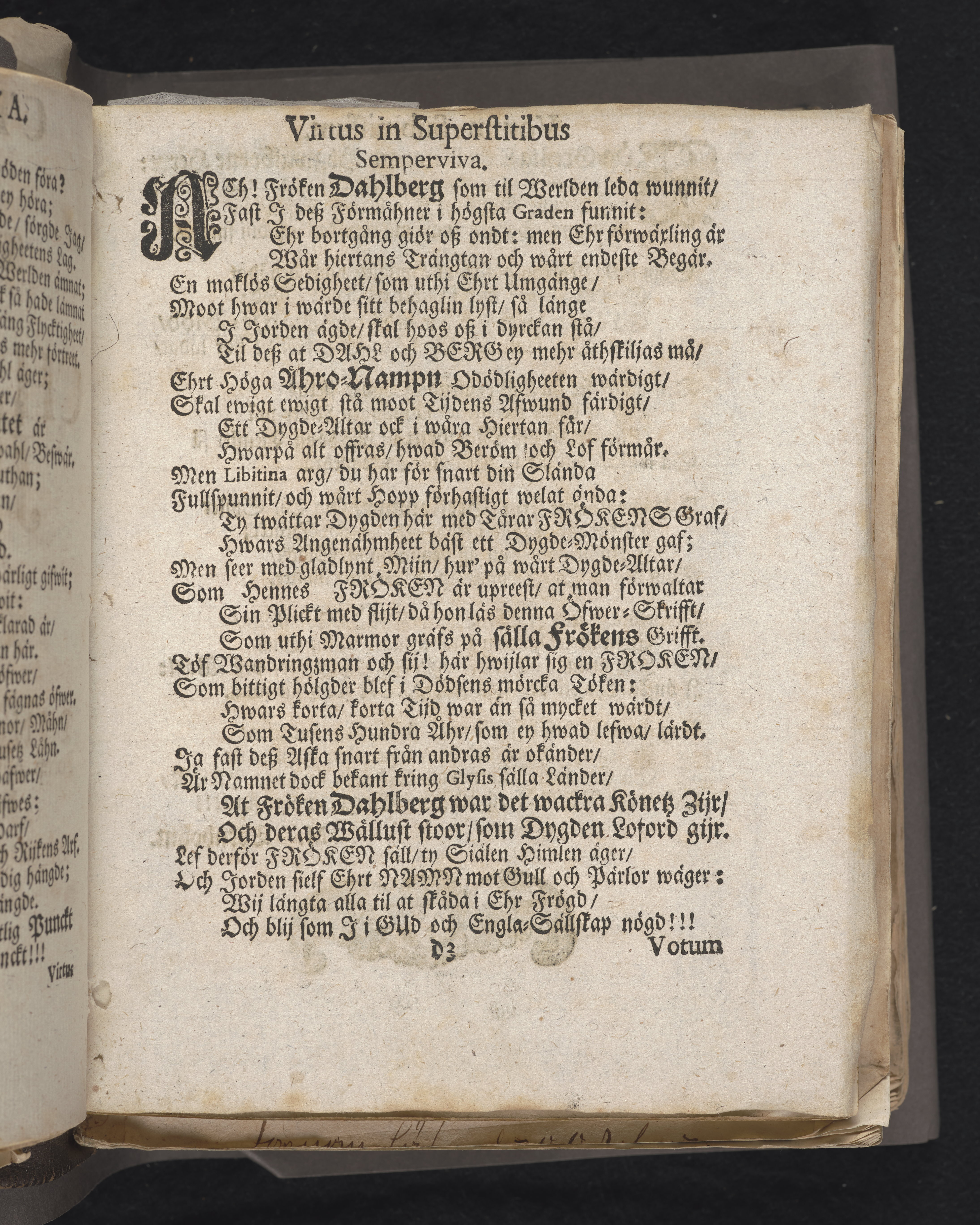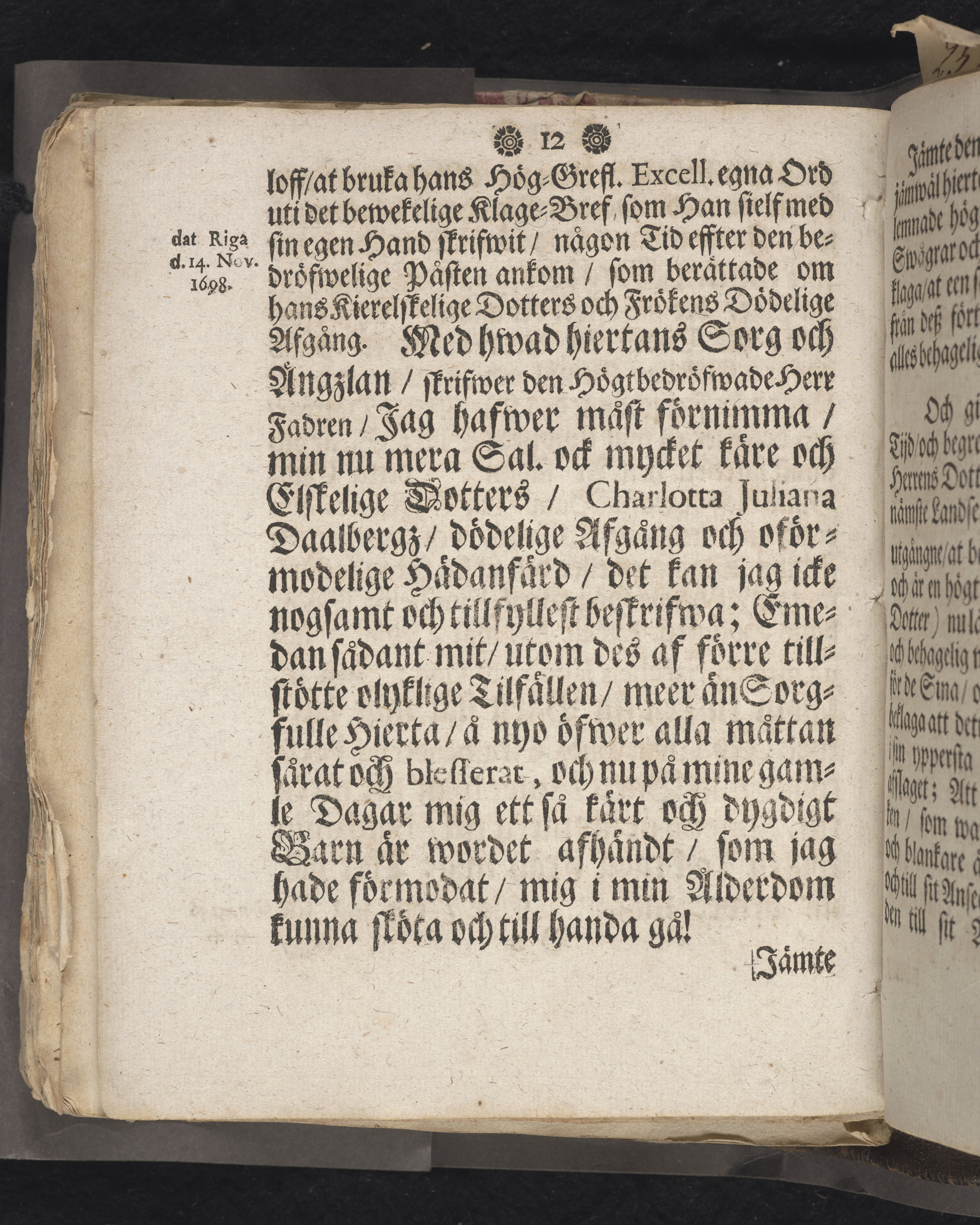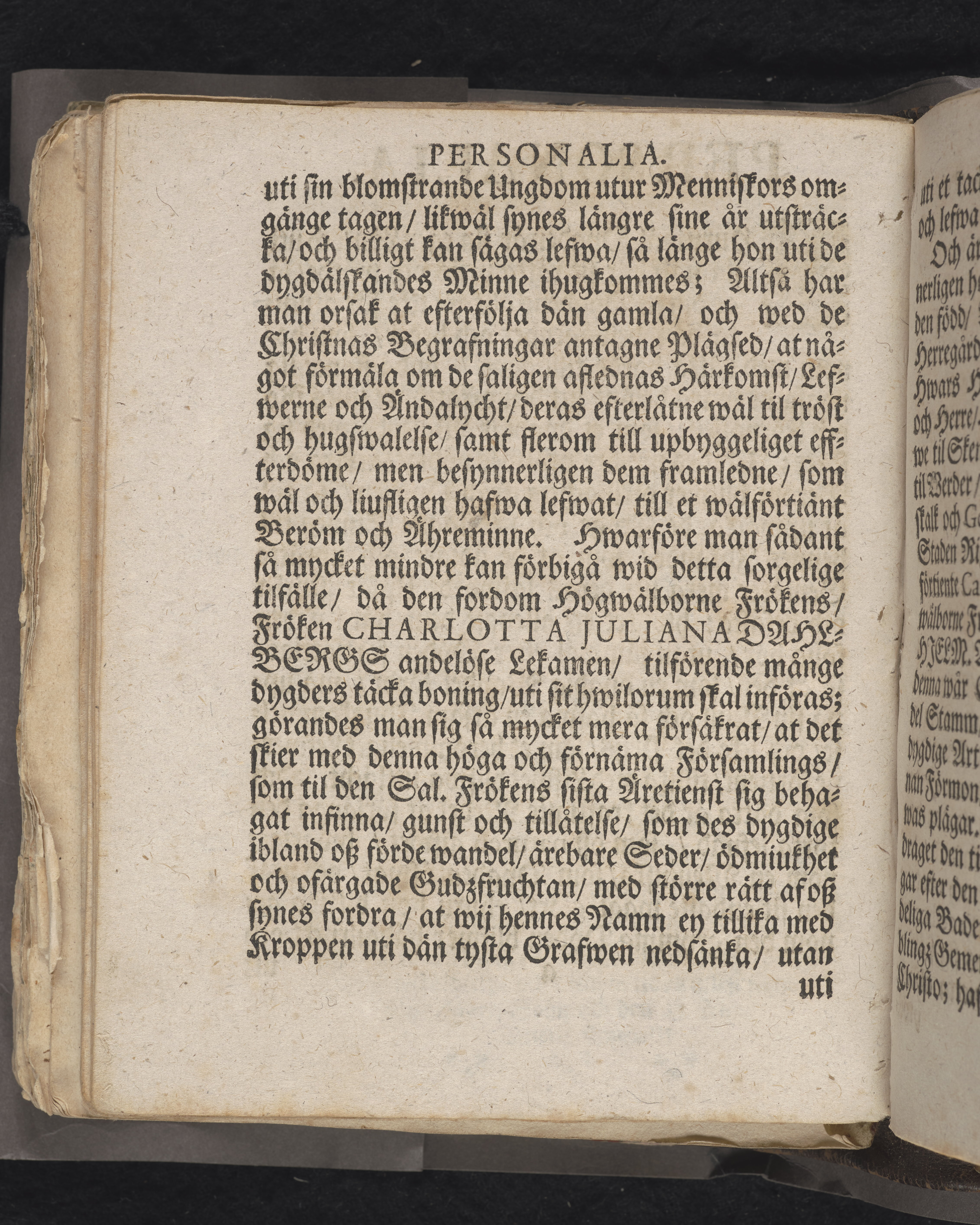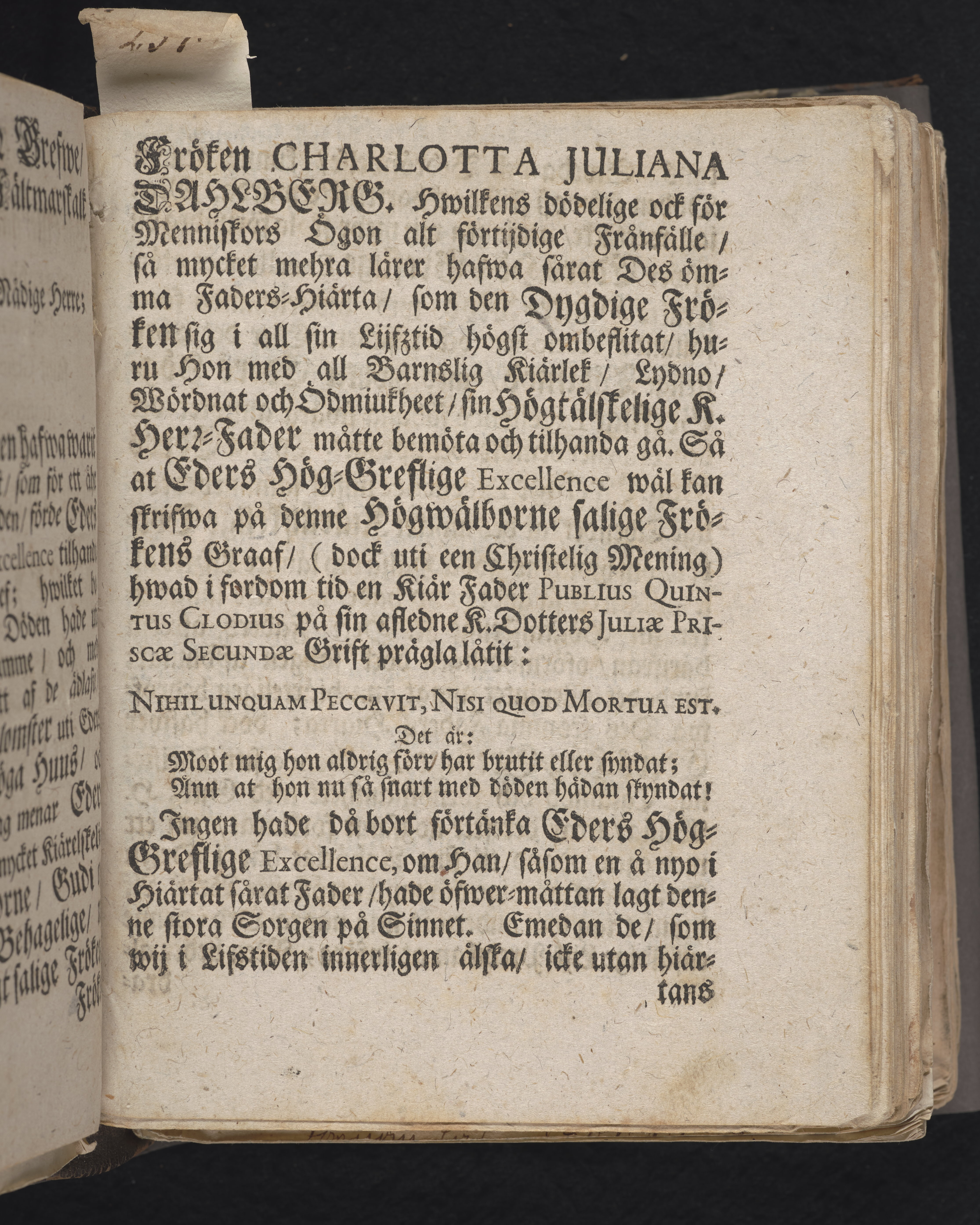 Den dödelige menniskan wid grääs och blomster förliknad, då högwälborne, nu ewinnerlig salige fröken, Fr. Charlotta Juliana Dahlberg, grefwe-dotter til Skenääs ... blef begrafwen, uti kongl. Ridderholms kiyrkan i Stockholm, åhr 1699. den 23. aprilis: och uti en christelig lijk-sermon ... förestäld, af ... Johan Thingwall. Stockholm, tryckt uti kongl. booktr. hoos sal. Wankifs änckia.