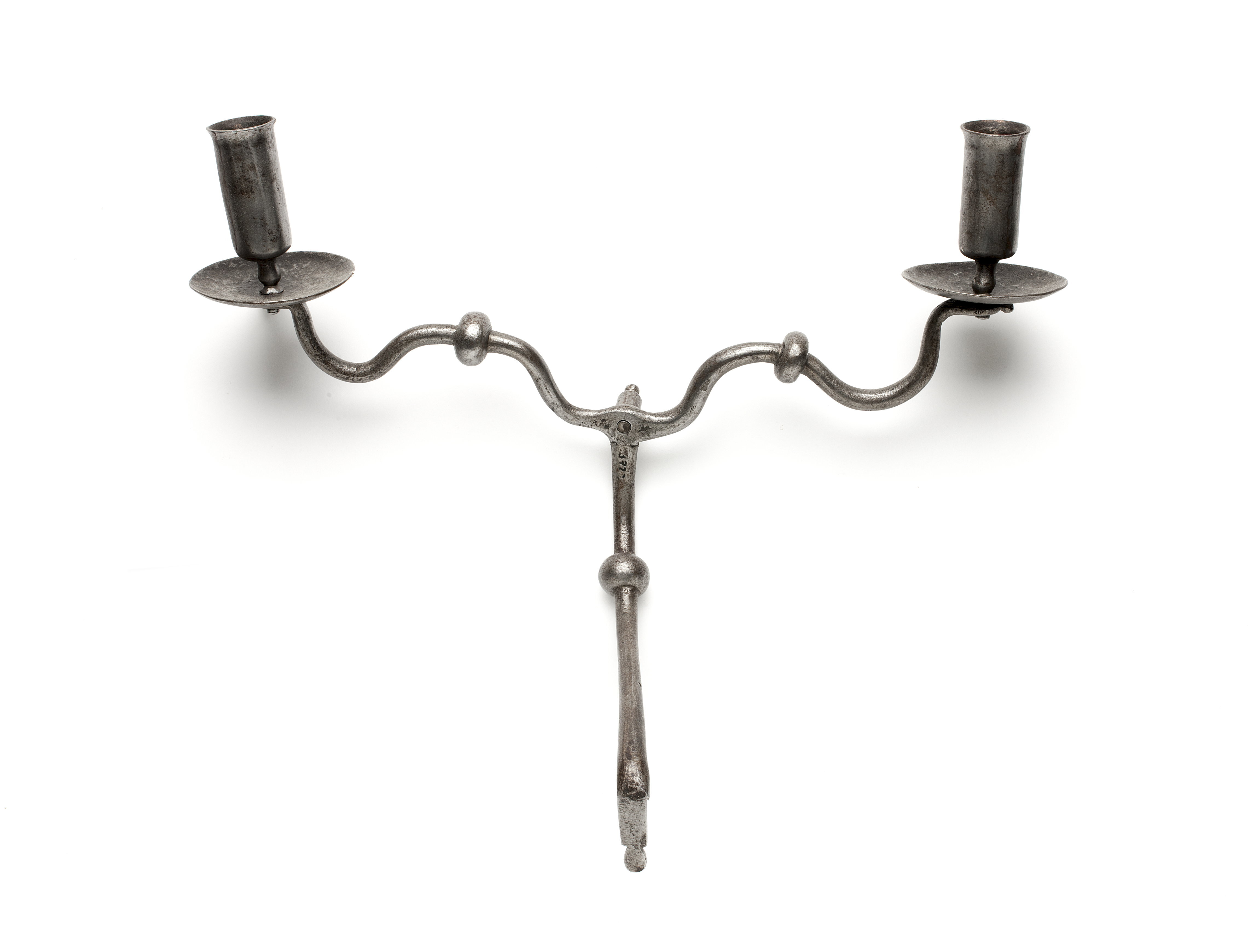 Vinkelböjd väggarm med två s-formiga ljusarmar av rundjärn, vardera med en ljuspipa med droppskål.