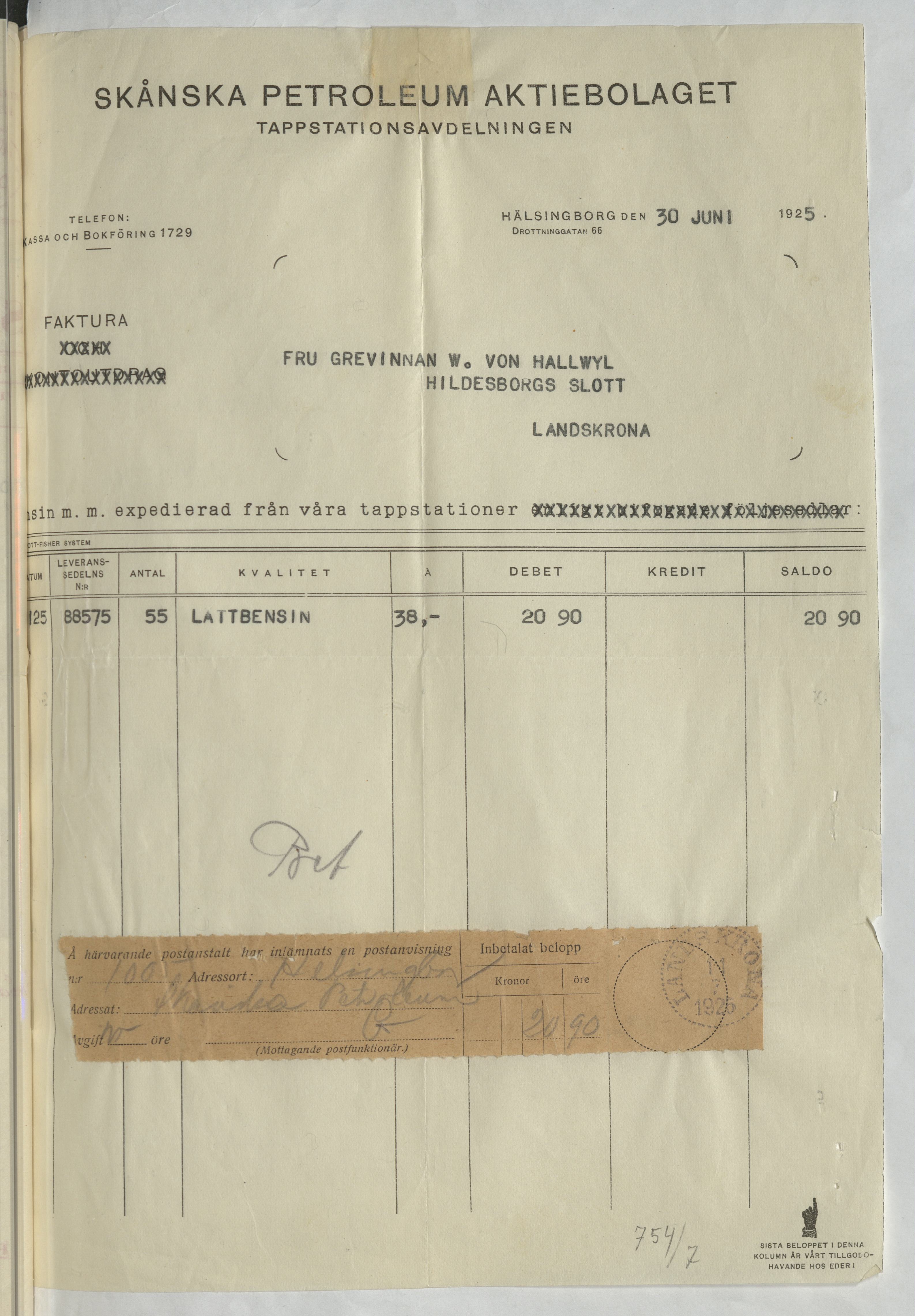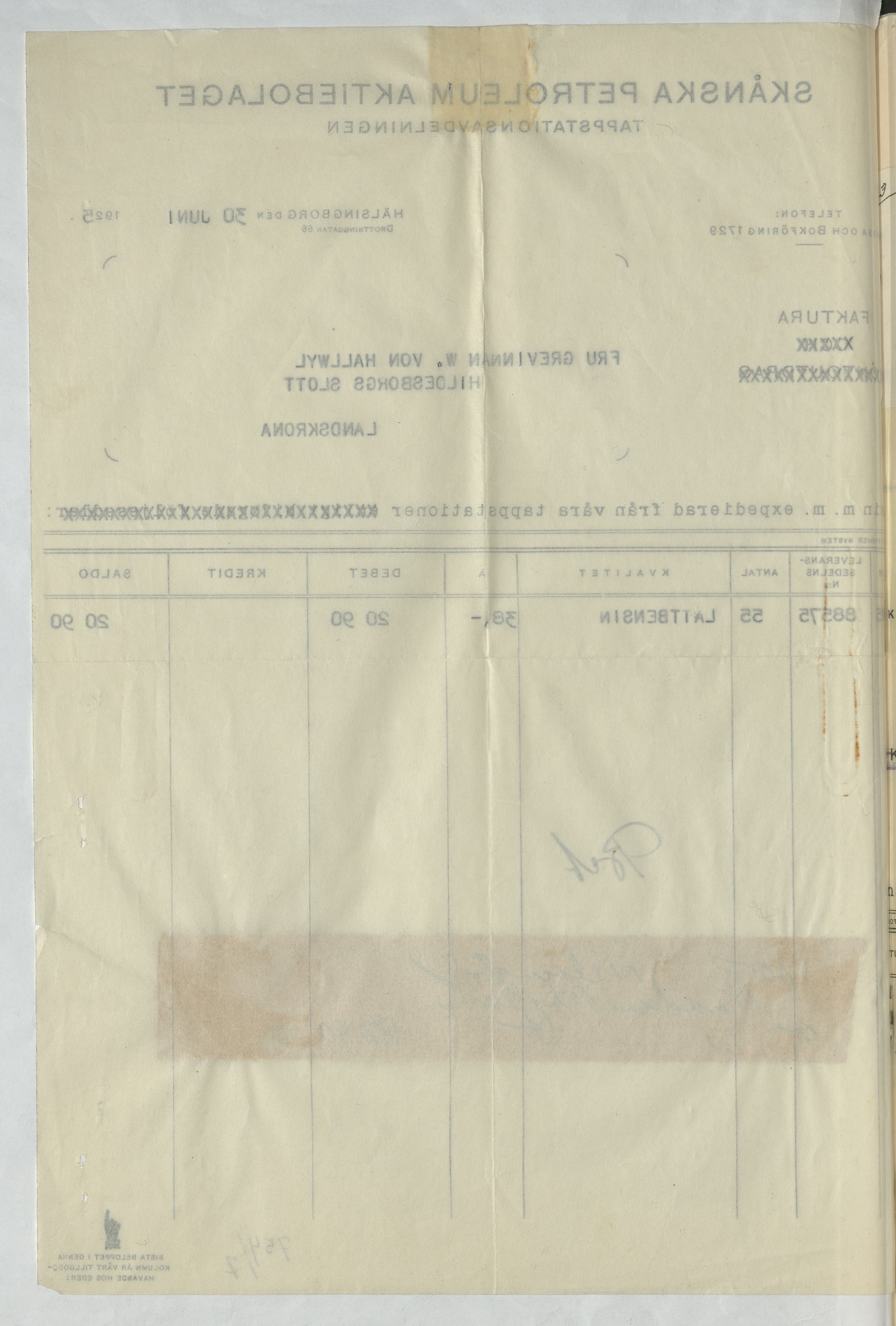 Kvitto från Skånska Petroleum Aktiebolaget. Gällande inköp av 55 liter bensin. Helsingborg, 1925.